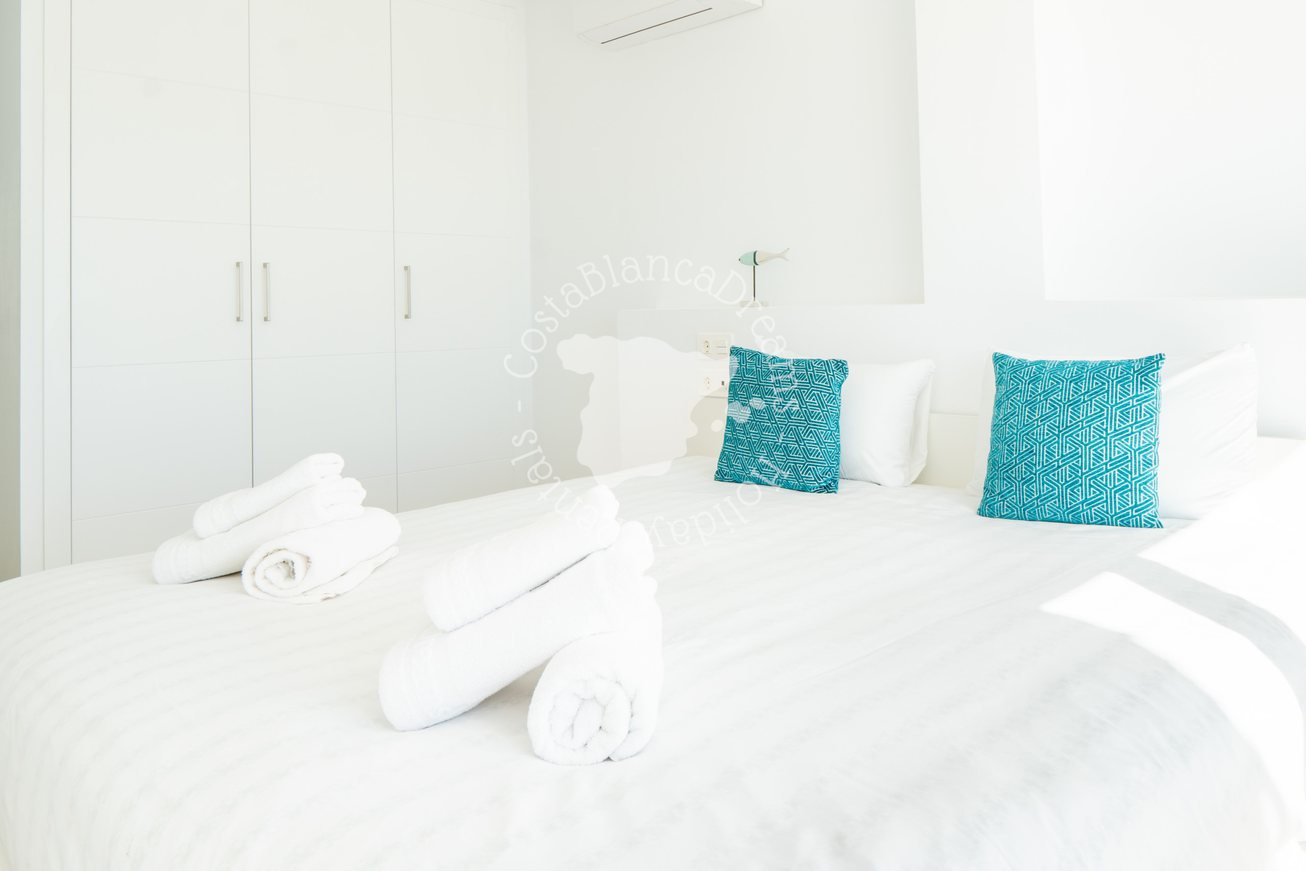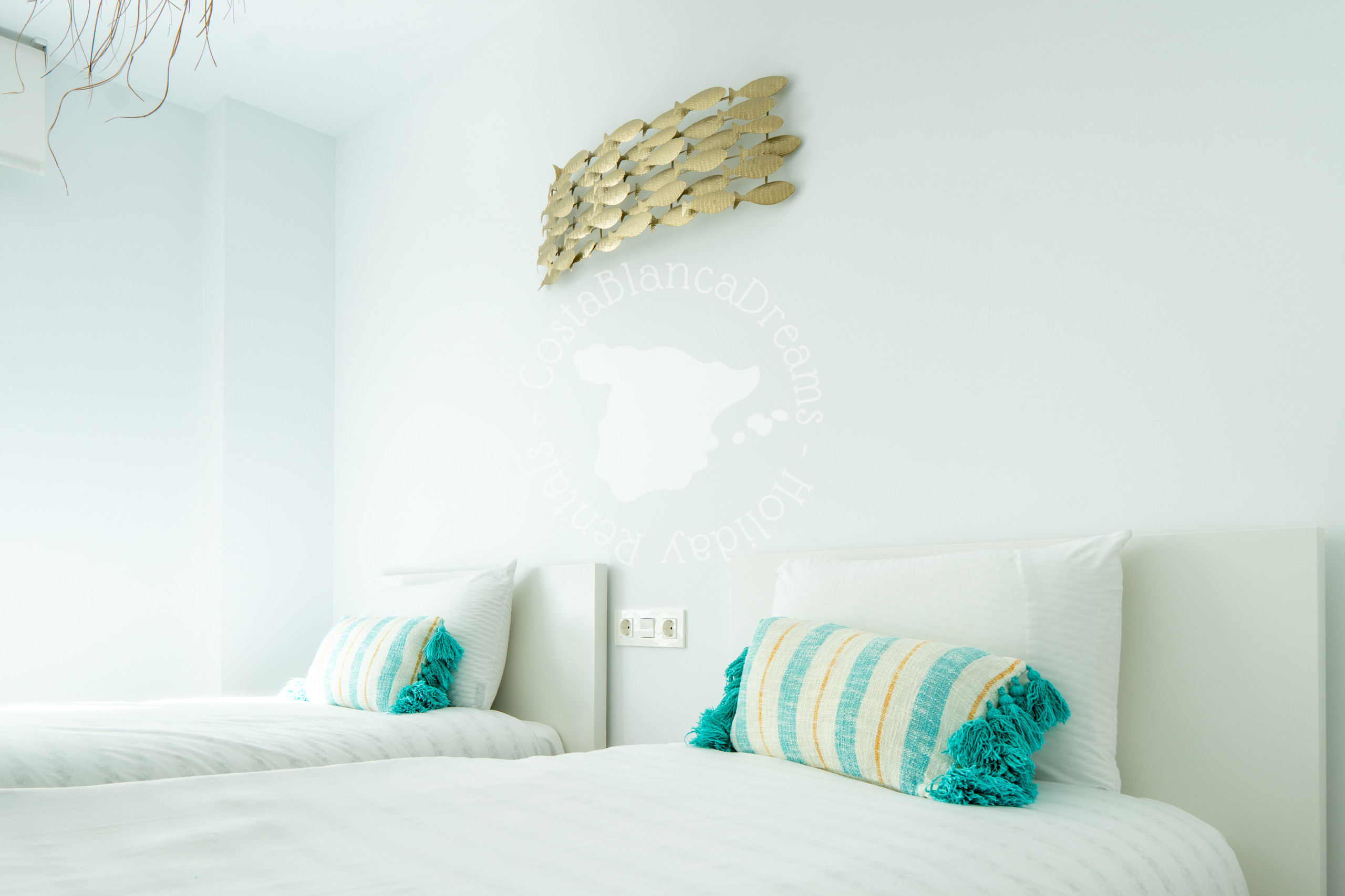 Das Hauptschlafzimmer bietet ein Doppelbett, Einbauschränke, Klimaanlage und ein eigenes Badezimmer mit Dusche, Waschbecken und WC. Es verfügt außerdem über eine Schiebetür zur Terrasse. Das zweite Schlafzimmer ist mit zwei Einzelbetten, einem Kleiderschrank und einer Klimaanlage ausgestattet. Ein zweites Badezimmer im Flur bietet zusätzlichen Komfort mit Dusche, Waschbecken und WC.