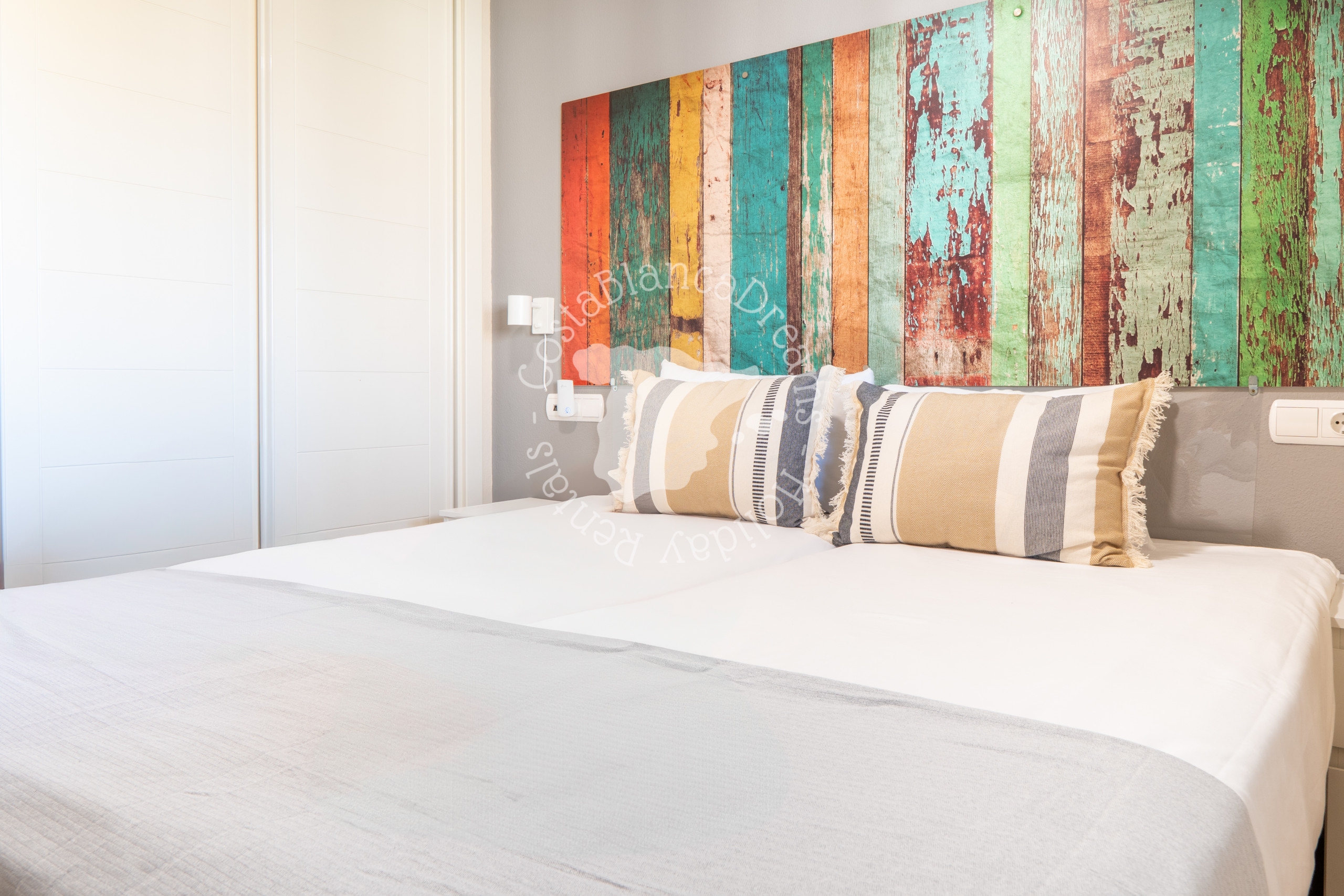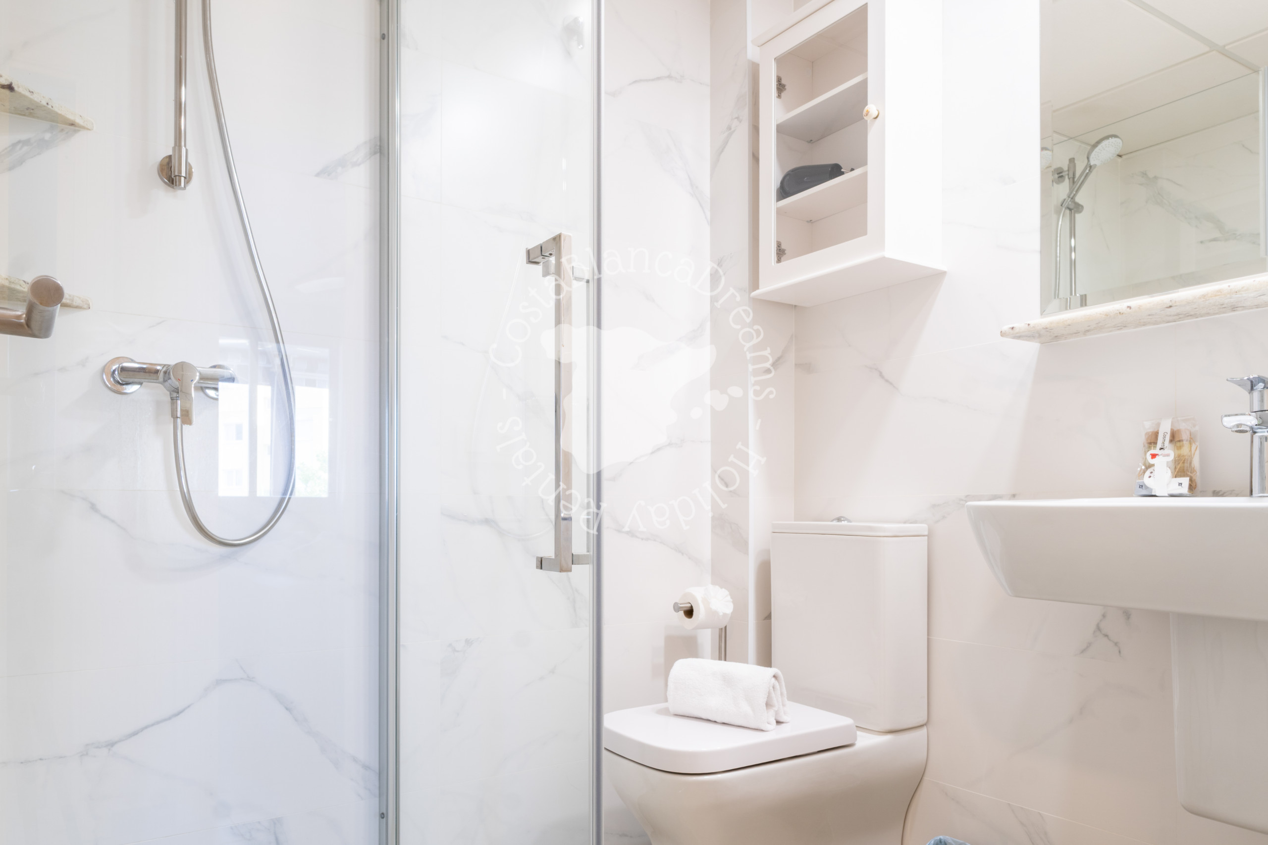 Das Apartment verfügt über drei durchdacht gestaltete Schlafzimmer. Das Hauptschlafzimmer verfügt über ein Doppelbett, einen großzügigen Kleiderschrank und ein eigenes Badezimmer mit Doppelwaschbecken, Dusche und Toilette. Das zweite Schlafzimmer bietet ebenfalls ein Doppelbett und reichlich Stauraum, während das dritte Schlafzimmer über zwei Einzelbetten und einen Kleiderschrank verfügt. Diese Schlafzimmer teilen sich ein stilvolles Badezimmer mit Dusche, Waschbecken und Toilette.