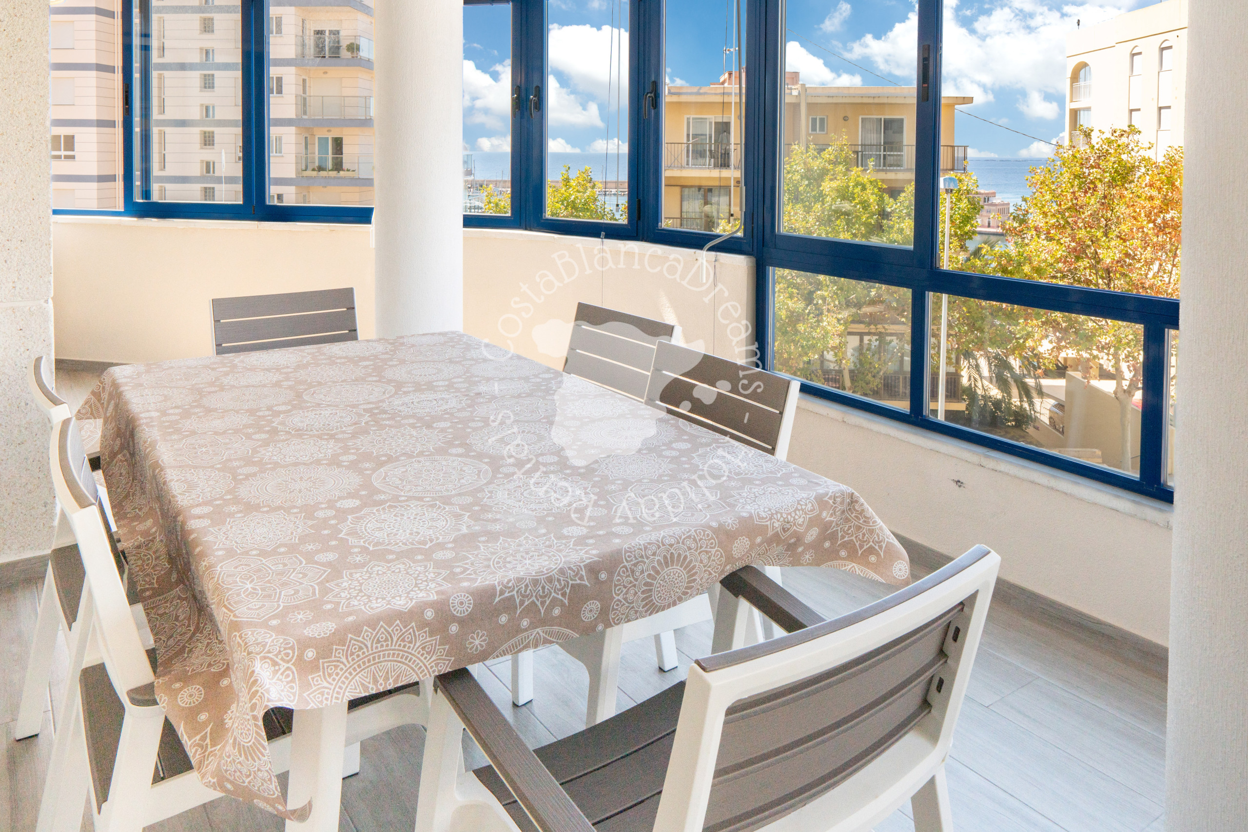 Treten Sie vom Wohnzimmer auf den geräumigen privaten Balkon, der mit einem Esstisch und zwei Sonnenliegen ausgestattet ist. Dies ist der perfekte Ort, um die mediterrane Sonne zu genießen und gleichzeitig den Panoramablick auf den berühmten Peñon d’Ifach, die Skyline von Calpe, den Salzsee Les Salines und das glitzernde Meer zu genießen.