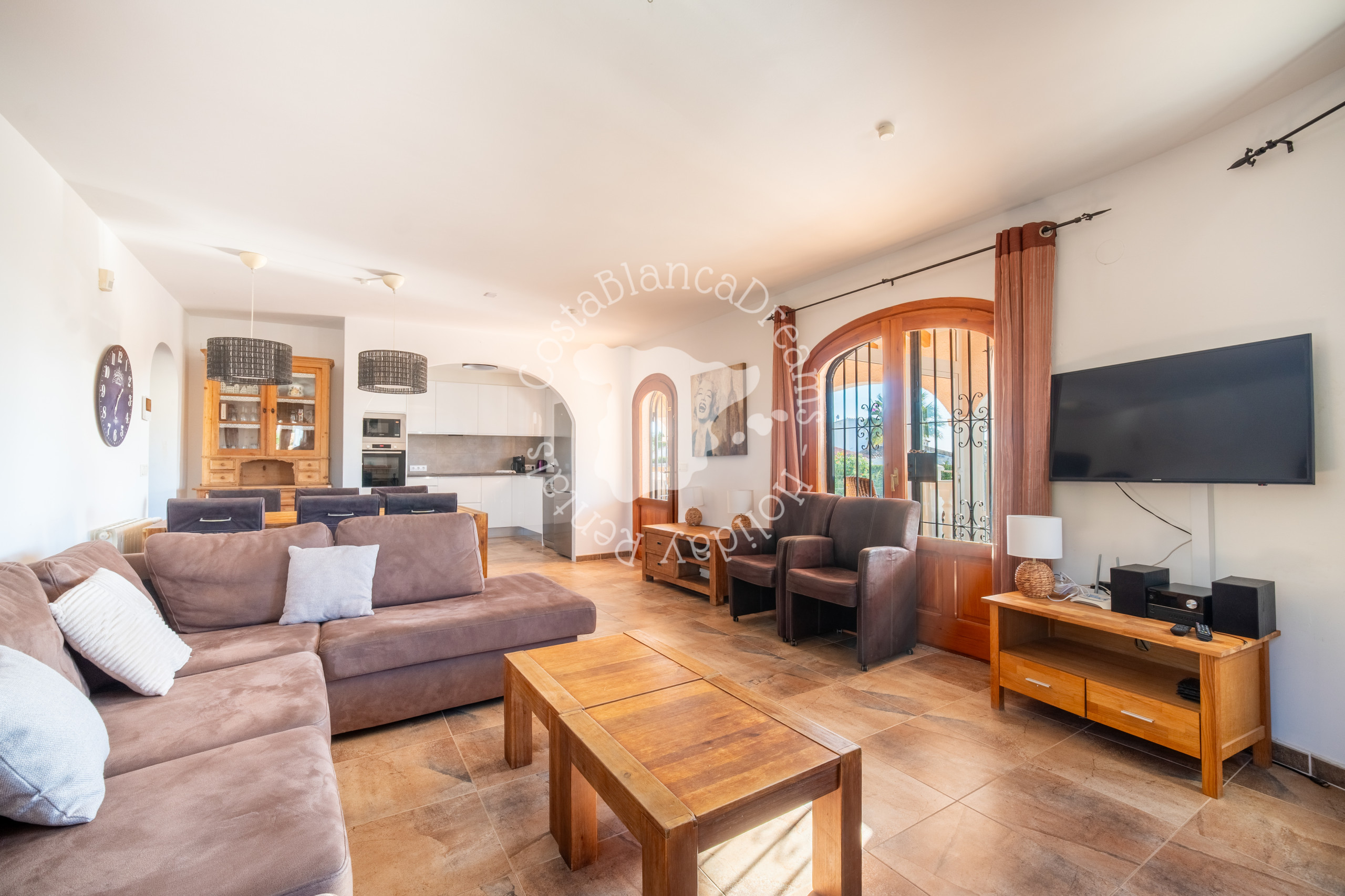 Betreten Sie das einladende Wohnzimmer, geschmückt mit Dekor im Ibiza-Stil und durchflutet von natürlichem Licht. Machen Sie es sich auf bequemen Sofas gemütlich oder machen Sie es sich in den bequemen Sesseln bequem, während Sie Ihre Lieblingssendungen im Fernsehen verfolgen. Angrenzend lädt ein Esstisch für sechs Personen zu gemütlichen Mahlzeiten mit Ihren Lieben ein, während der direkte Zugang zum Garten das Leben im Innen- und Außenbereich nahtlos miteinander verbindet.