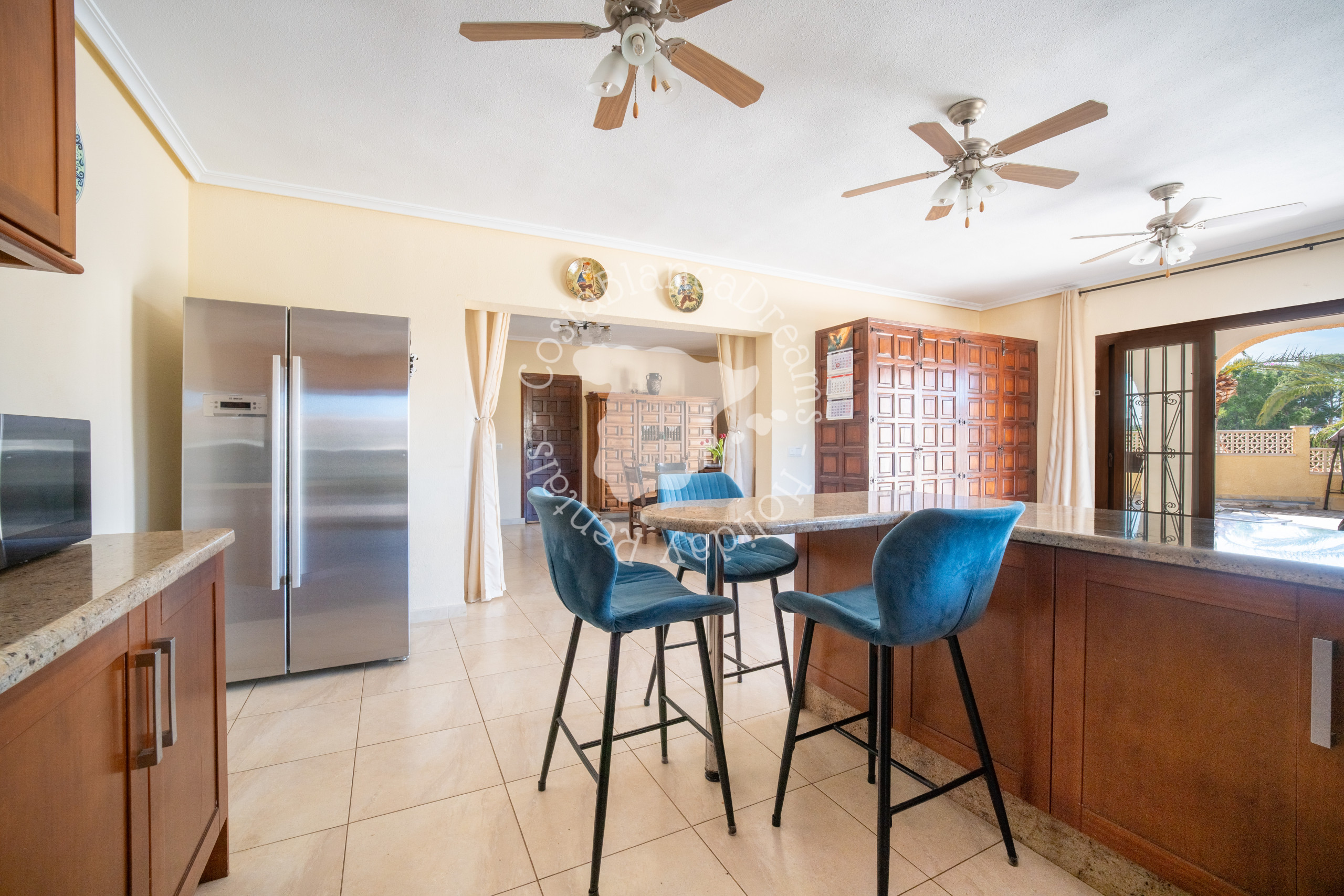 Es bietet einen großzügigen Wohnraum, der die gemütliche Atmosphäre Spaniens vermittelt. Entspannen Sie sich auf der Couch oder lesen Sie die Zeitung auf einem der beiden Sitzplätze. Genießen Sie das ganze Jahr über die spanische Natur. Allerdings kann es im Winter abends etwas kühl werden. Dann kommen alle zusammen und legen einen zusätzlichen Scheit in den Kamin.