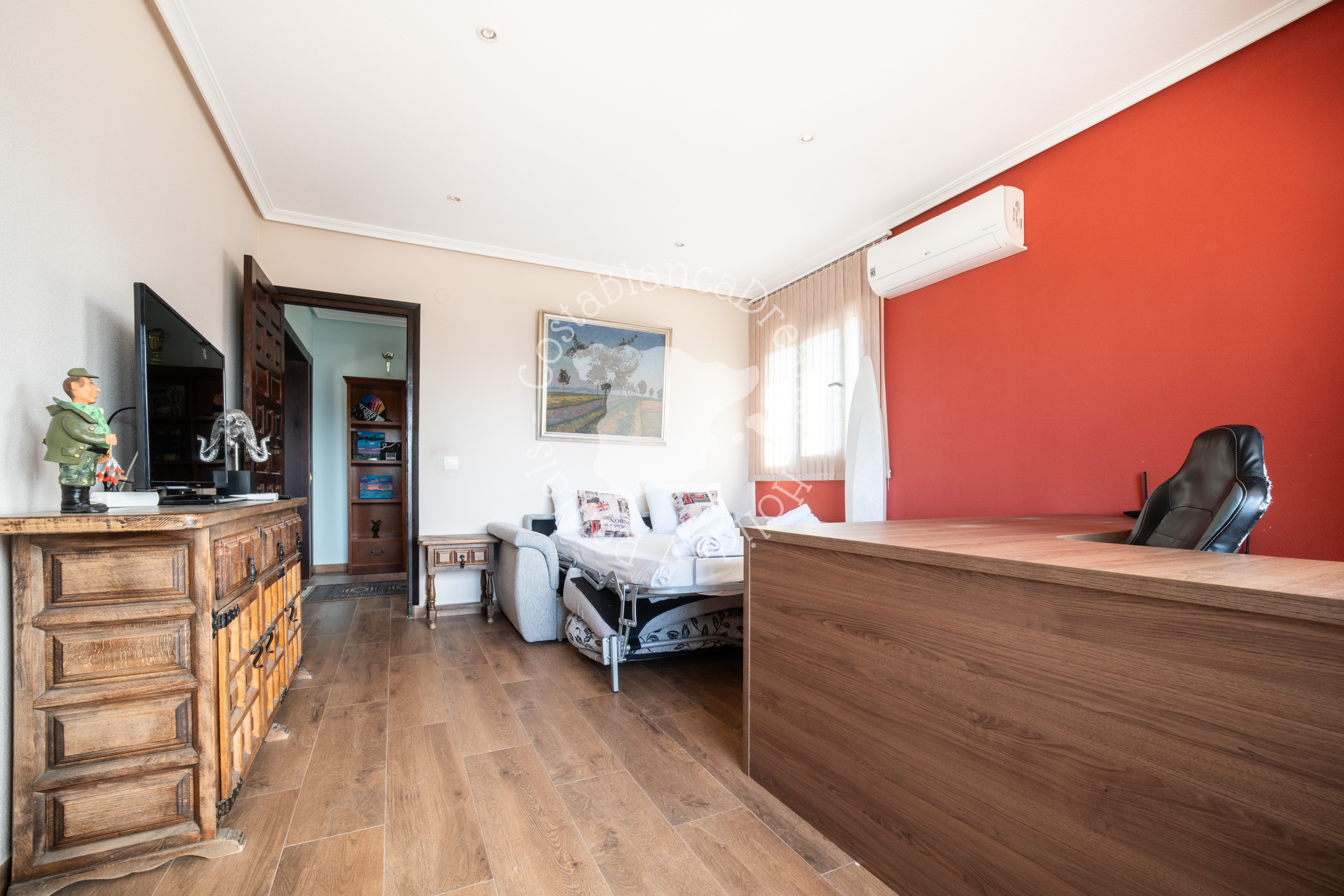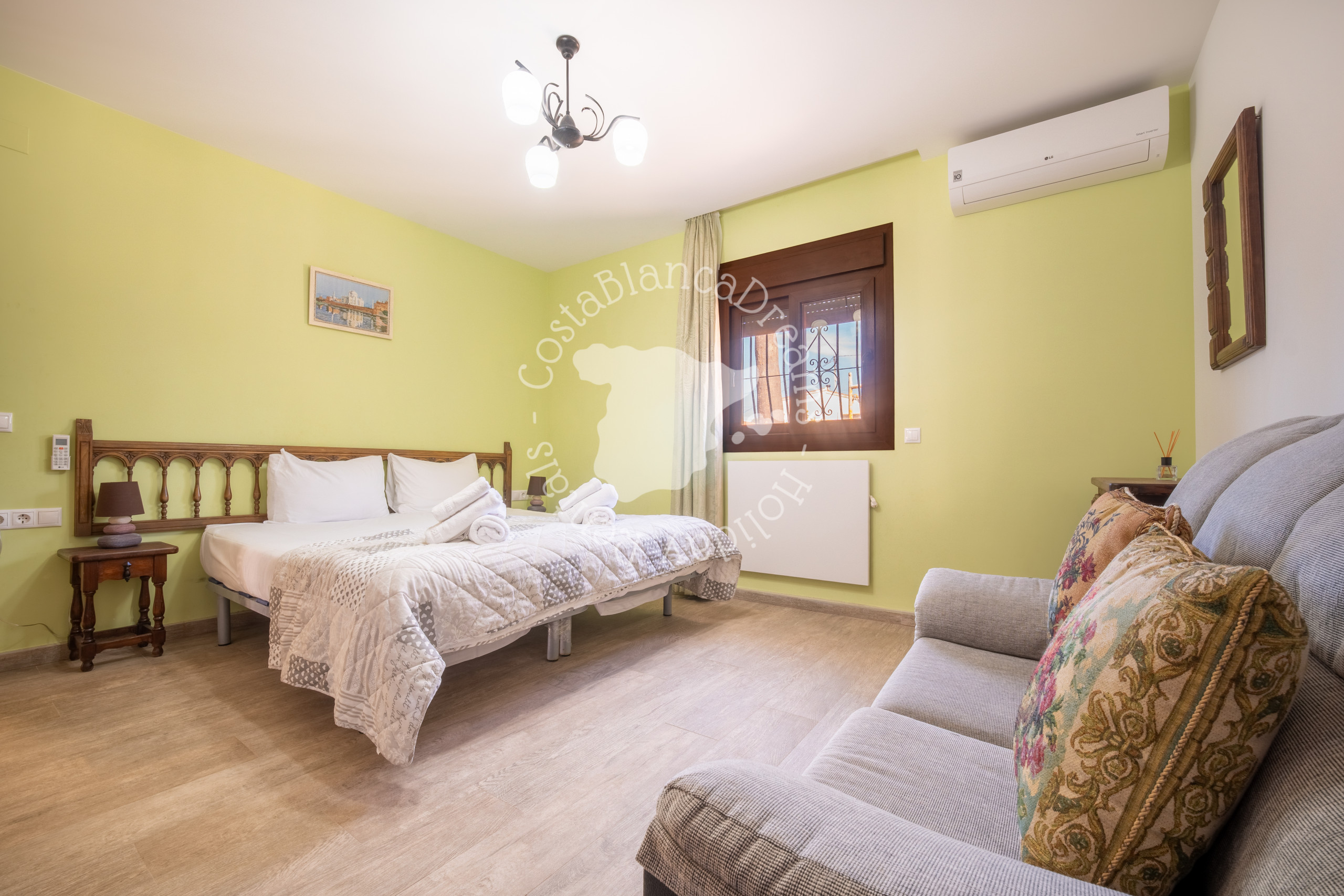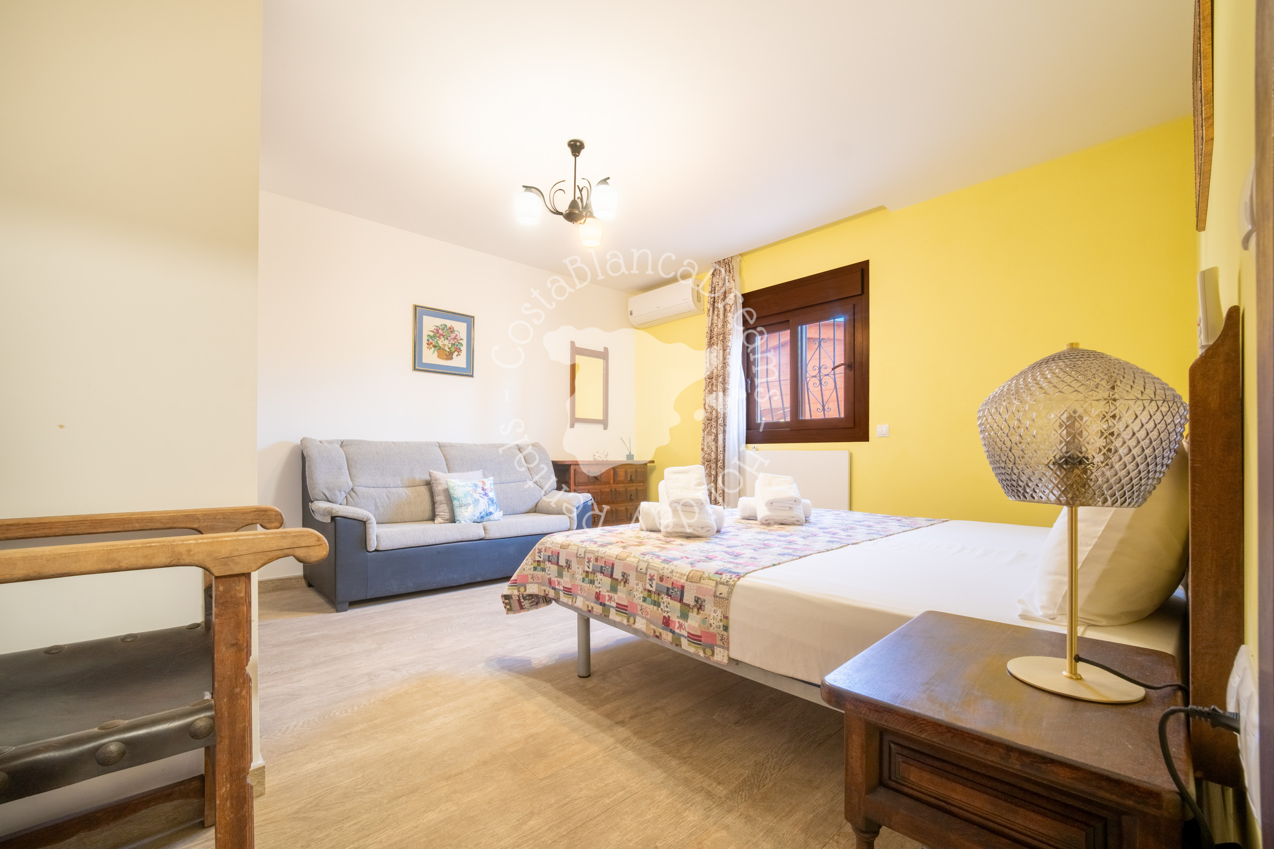 Die anderen 2 Schlafzimmer und das Badezimmer liegen neben dem Haus, sind aber über die überdachte Terrasse erreichbar. Das moderne Hauptschlafzimmer verfügt über ein Doppelbett, einen Kleiderschrank im Ibiza-Stil, eine Klimaanlage und ein eigenes Badezimmer. In diesem Badezimmer finden Sie eine geräumige ebenerdige Dusche, Toilette und Waschbecken. Angrenzend an dieses Schlafzimmer finden Sie ein weiteres Zimmer mit einem Schlafsofa für zwei Personen.