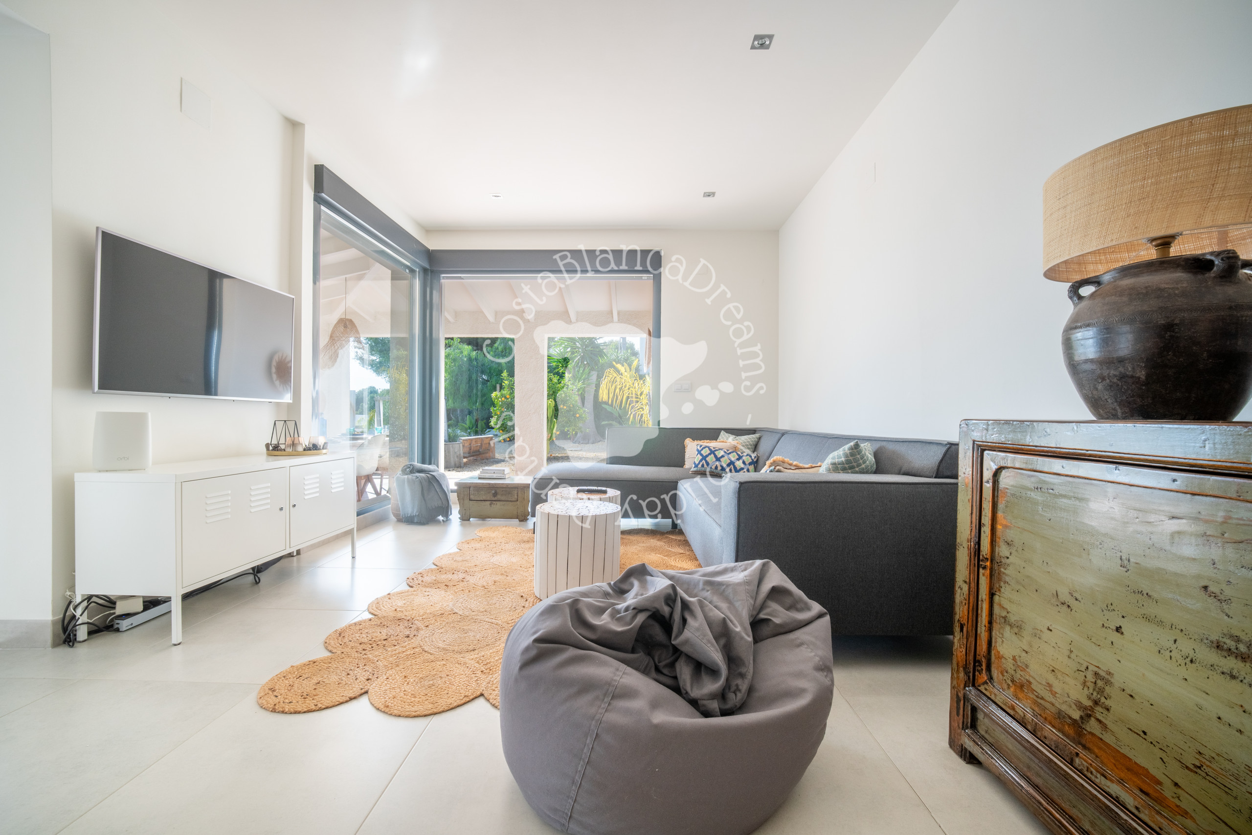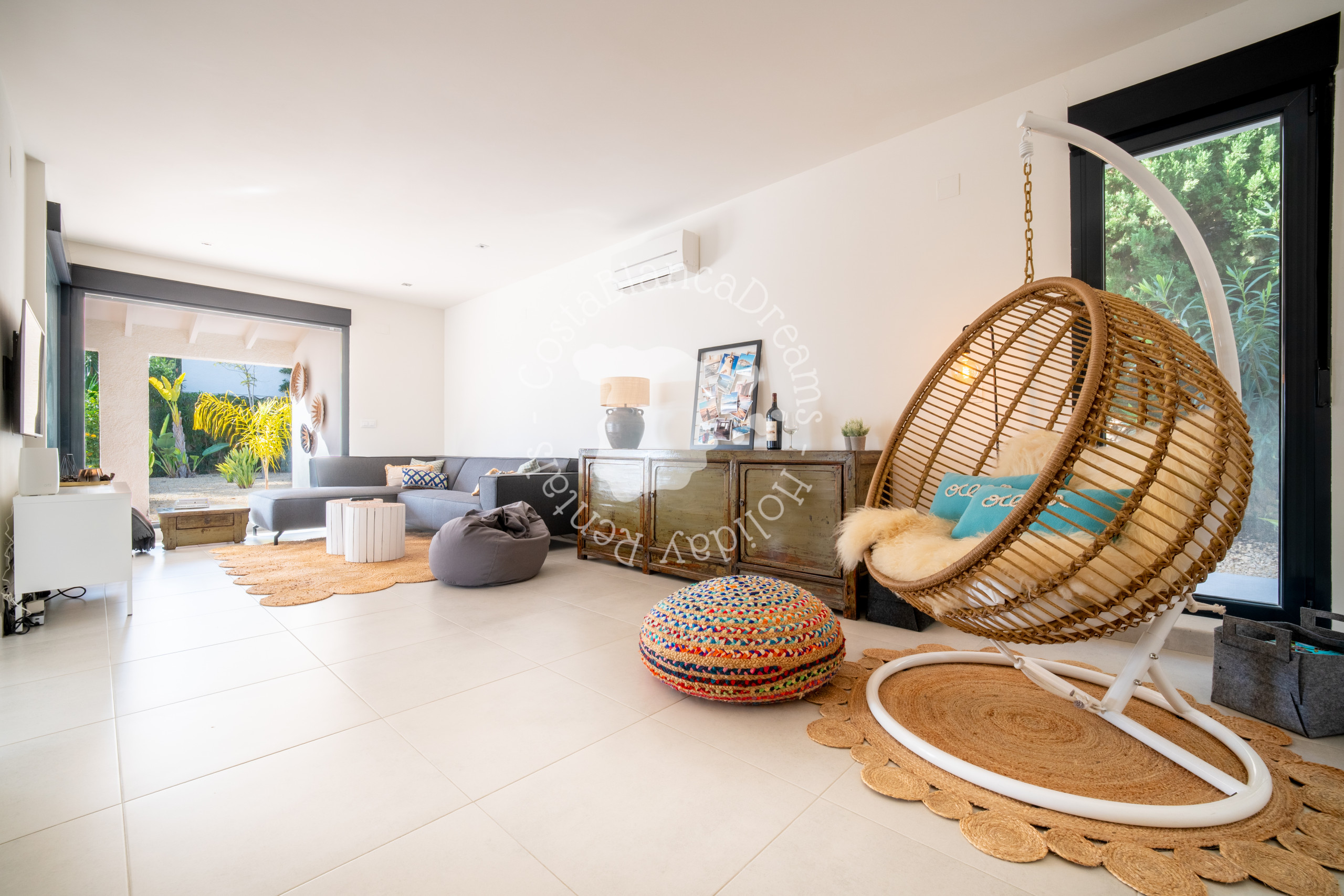 Beim Betreten des Hauses gelangen Sie in einen hellen und geräumigen offenen Wohn- und Essbereich. Das Wohnzimmer ist komfortabel mit einem gemütlichen Sofa, einem Sessel, einem Smart-TV von LG und einer Klimaanlage ausgestattet und bietet einen entspannenden Ort zum Verweilen. Angrenzend befindet sich der Essbereich mit direktem Zugang zum großen Garten und Poolbereich. Die moderne, voll ausgestattete offene Küche mit integrierten Bosch-Geräten verfügt über einen Kühlschrank, einen Gefrierschrank, ein Cerankochfeld, eine Mikrowellen-/Backofenkombination, einen Geschirrspüler, eine Nespresso-Kaffeemaschine, einen Toaster und einen Wasserkocher und bietet somit alles, was für einen angenehmen Aufenthalt benötigt wird.