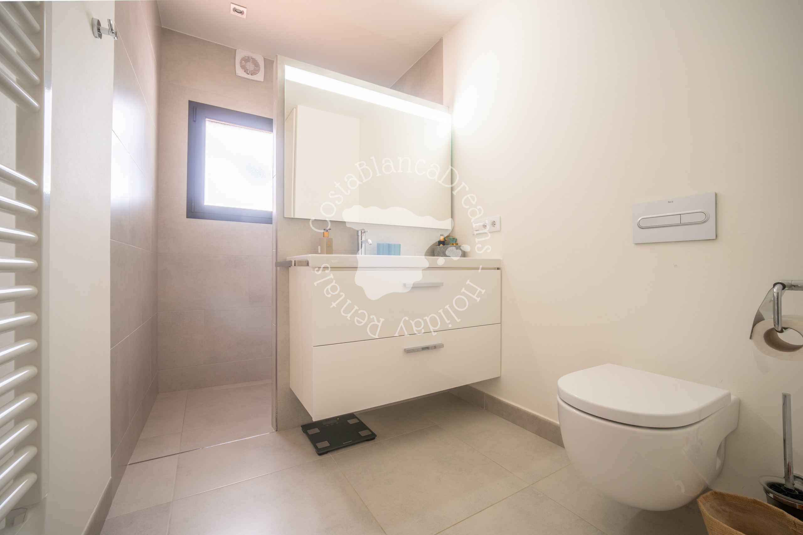 Die obere Hauptetage empfängt Sie mit einem lichtdurchfluteten Wohnzimmer mit bequemen Sofas und herrlichem Blick auf das Meer sowie einem separaten Home-Office-Bereich. Entspannen Sie sich in der gemütlichen Lounge mit Smart-TV, auf dem Sie Ihr eigenes Netflix-Konto nutzen können, und schauen Sie sich deutsches Satellitenfernsehen und spanische Sender an. Oder betreten Sie die halb überdachte Terrasse, wo Sie speisen und dabei die faszinierende Aussicht auf das Meer und das Tal genießen können.