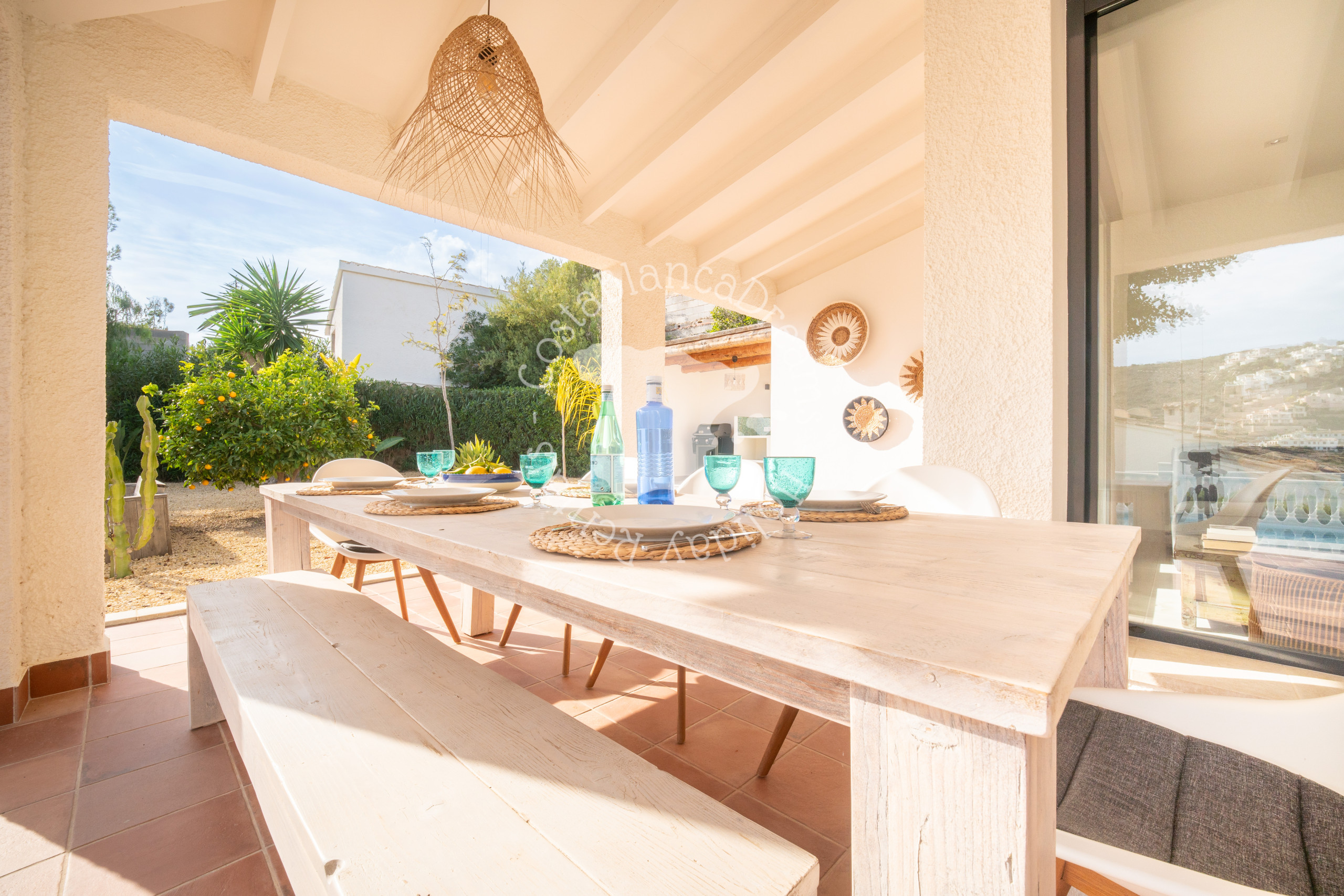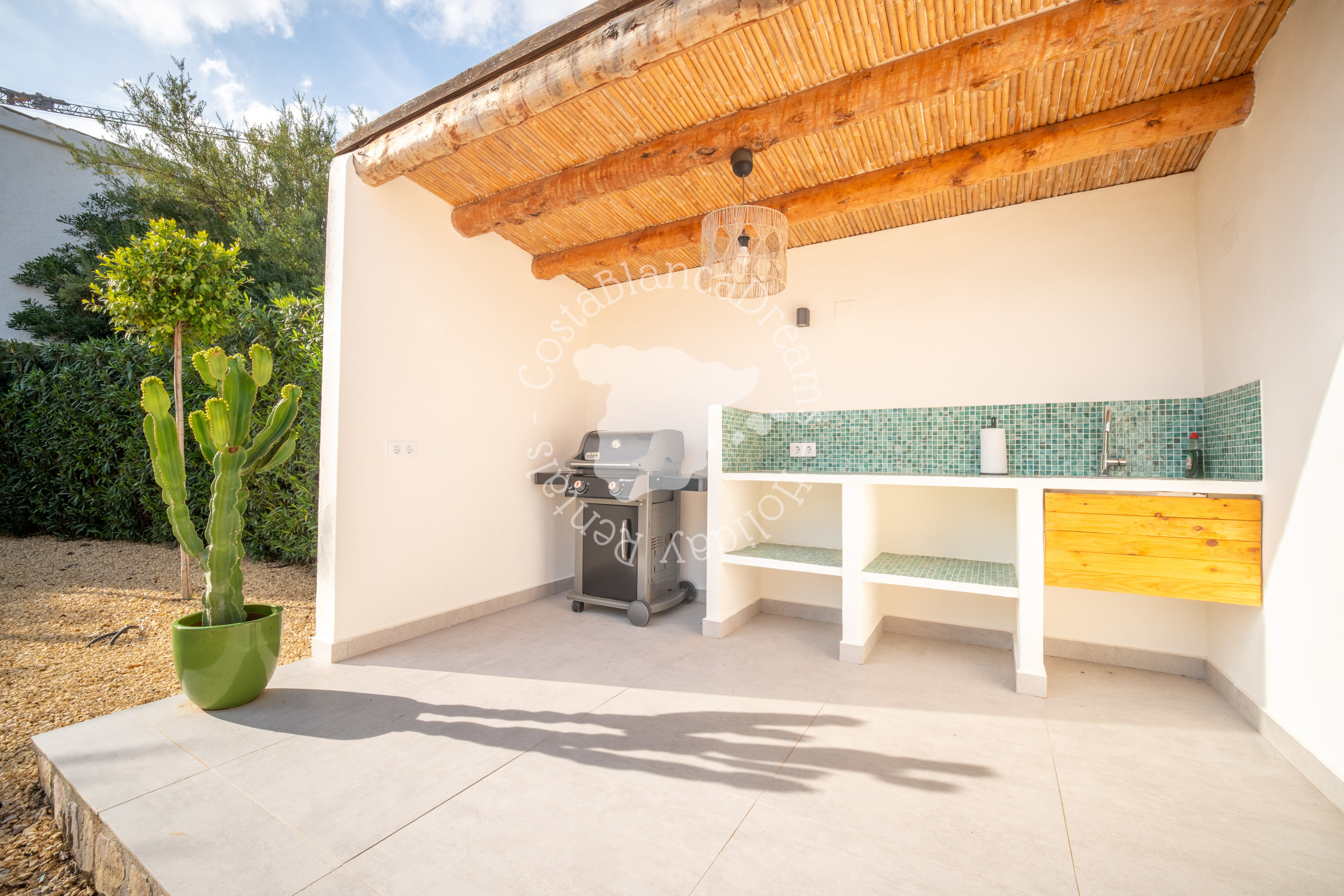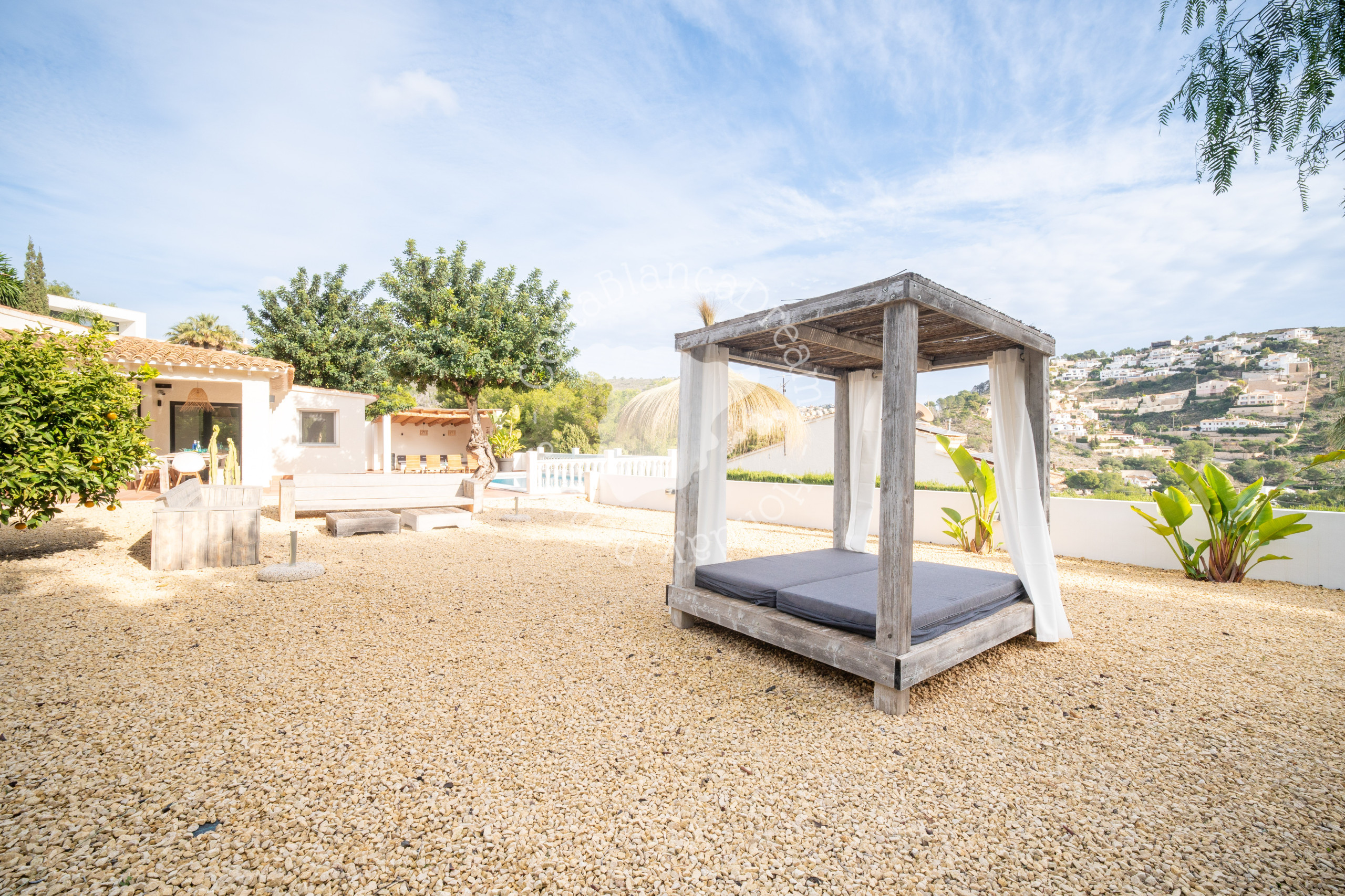 Das Casa Amahle besticht durch seinen großzügigen, wunderschön gepflegten Garten und den weiten Blick über die Umgebung, das Cap d’Or mit seinem Turm und sogar einen kleinen Meerblick auf die Bucht von El Portet. Gäste können das Leben im Freien in vollen Zügen genießen: Ein überdachter Essbereich und eine Außenküche im Ibiza-Stil mit Weber-Gasgrill und Spüle laden zum Verweilen ein. Der private Pool misst 8 x 4 Meter und kann auf Anfrage beheizt werden (siehe Details unten). Die Außendusche ist ideal, um sich nach einem sonnigen Tag am Strand abzuduschen. Umgeben von Sonnenliegen bietet sie den perfekten Ort zum Entspannen unter der mediterranen Sonne. Neben dem Pool bietet eine überdachte Naya im Ibiza-Stil mit zwei bequemen Sofas und einem kleinen Kühlschrank einen schönen, schattigen Platz mit Blick auf Pool und Garten. Ein gemütliches Tagesbett und weitere Sofas sorgen dafür, dass Gäste den Komfort und die Schönheit der Umgebung voll auskosten können.