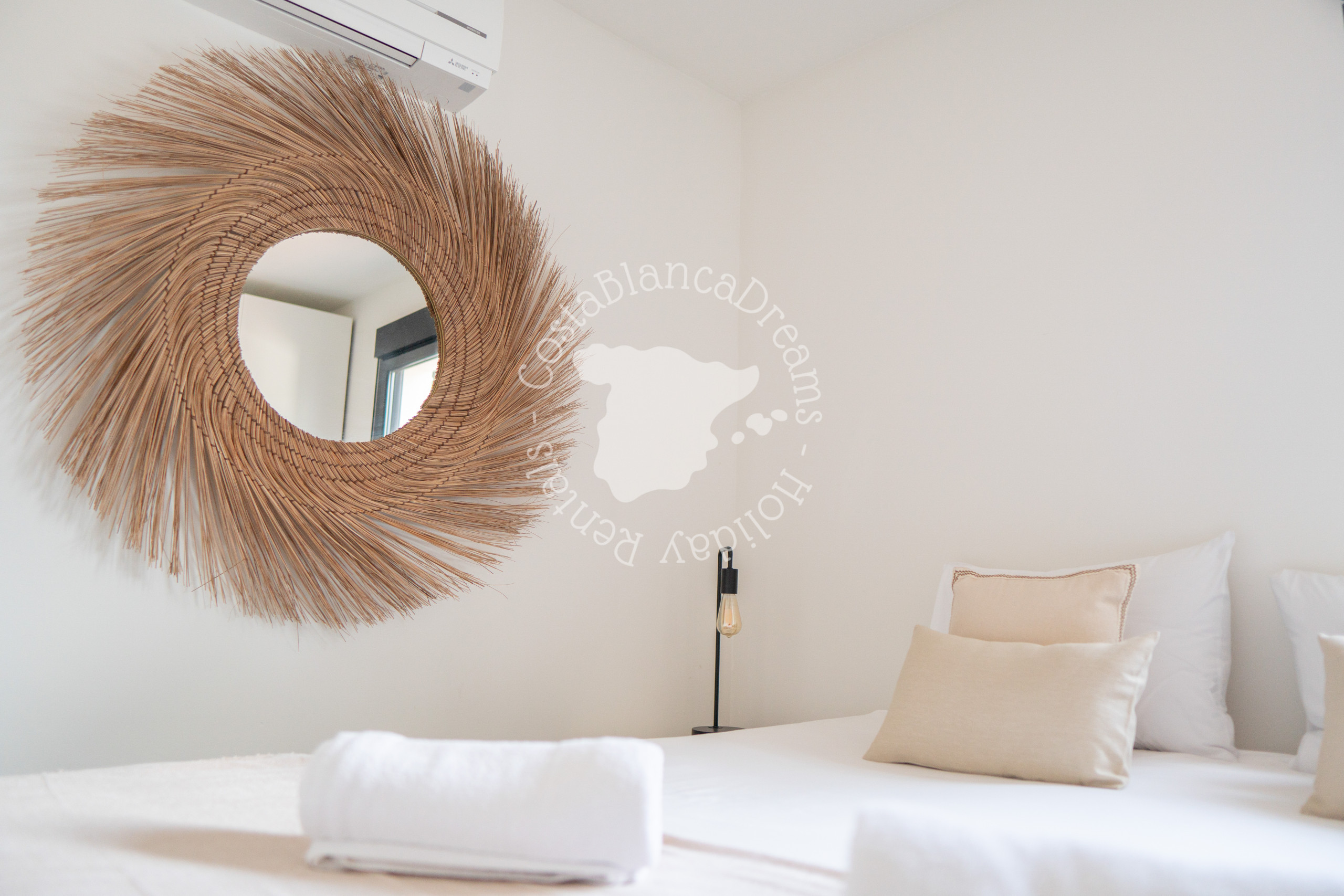 Vom Wohnzimmer führt ein Flur zu den drei Schlafzimmern, die alle mit Klimaanlage ausgestattet sind. Ein Schlafzimmer verfügt über ein skandinavisches Jenssen-Boxspringbett und einen Kleiderschrank, das zweite über zwei Einzelbetten, einen Kleiderschrank, einen LG-Fernseher und ein eigenes Badezimmer mit Dusche, Waschbecken und WC. Das dritte Schlafzimmer bietet ein Einzelbett, einen Kleiderschrank und einen LG-Fernseher mit Xbox-Spielkonsole. Ein zweites Badezimmer mit ebenerdiger Dusche, Waschbecken, WC und Waschmaschine befindet sich ebenfalls im Flur.