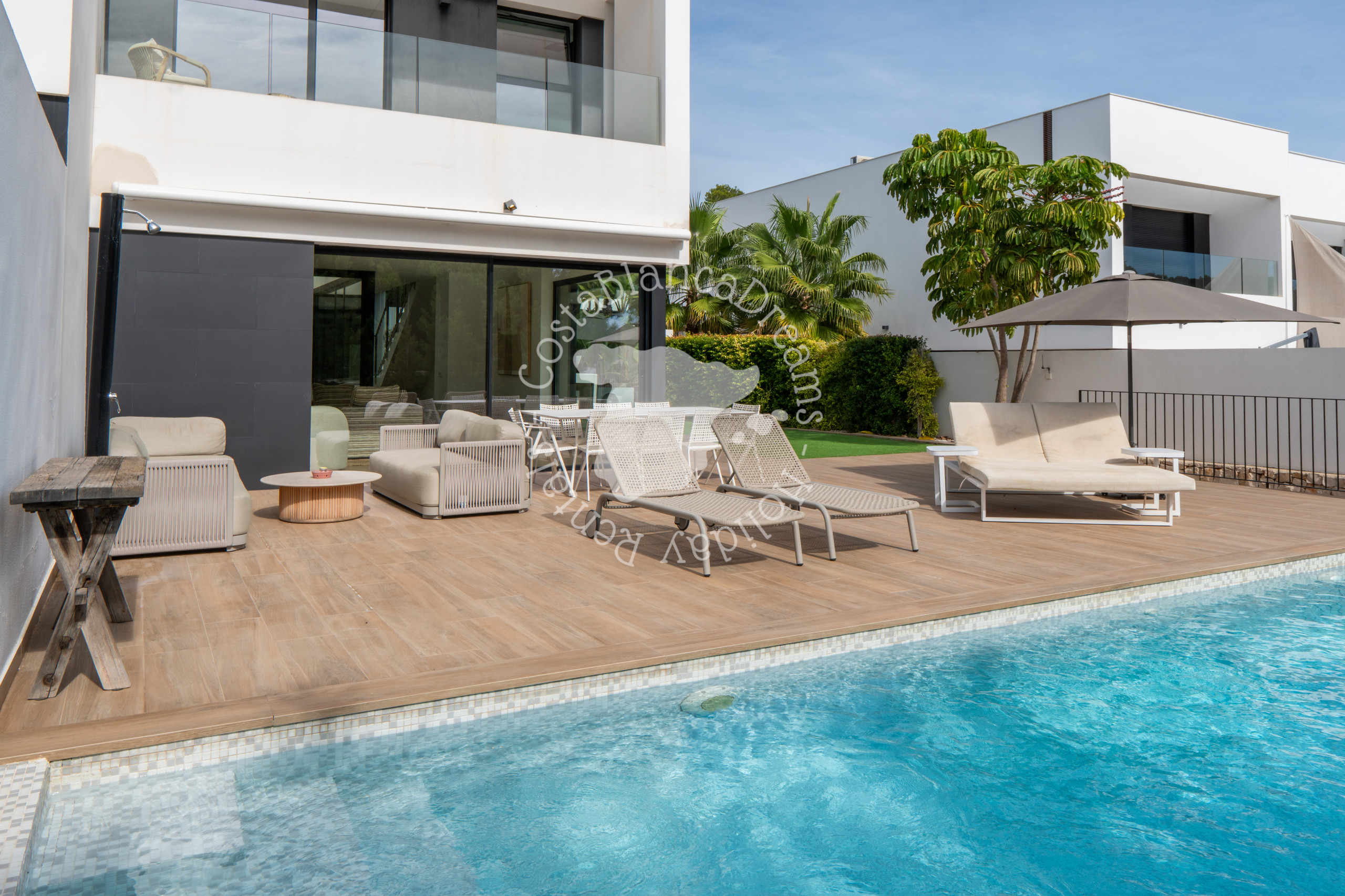 Betreten Sie Ihre eigene private Oase mit einem glitzernden Pool, umgeben von Sonnenliegen, komfortablen Loungebereichen und einem schattigen Essbereich. Egal, ob Sie die Sonne genießen oder mit Ihren Lieben Mahlzeiten im Freien genießen, der Außenbereich ist für puren Genuss konzipiert.