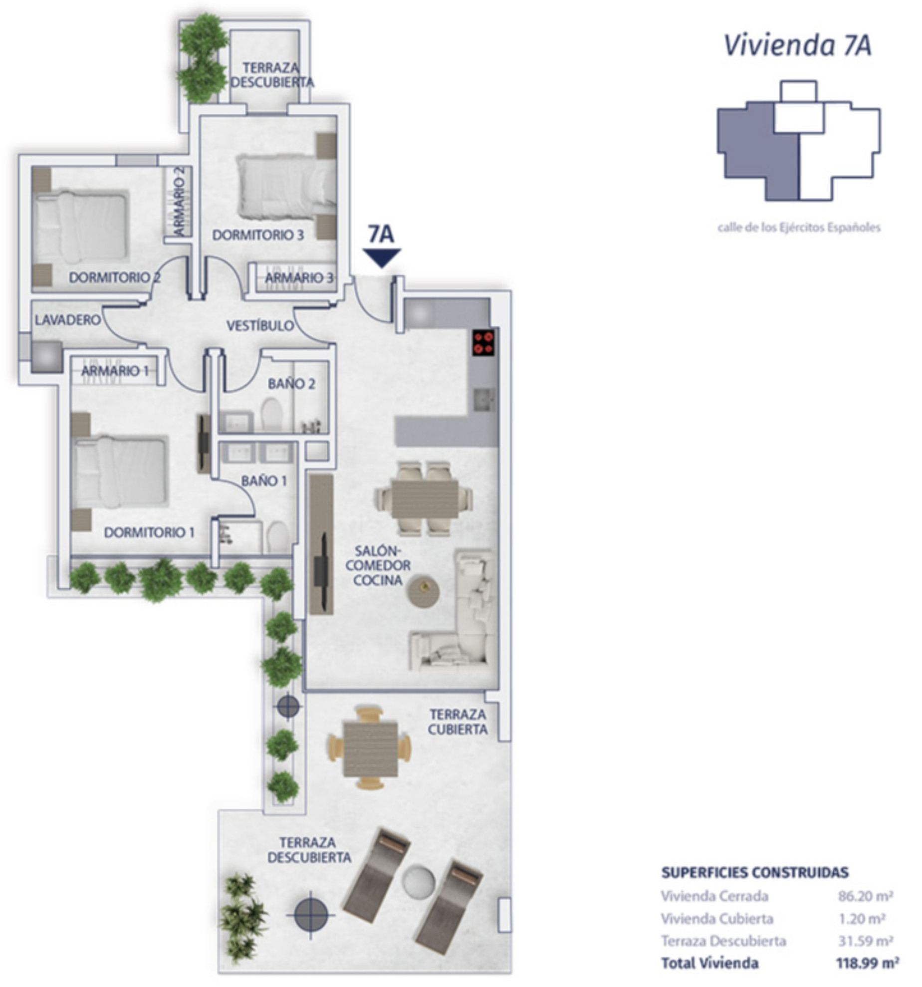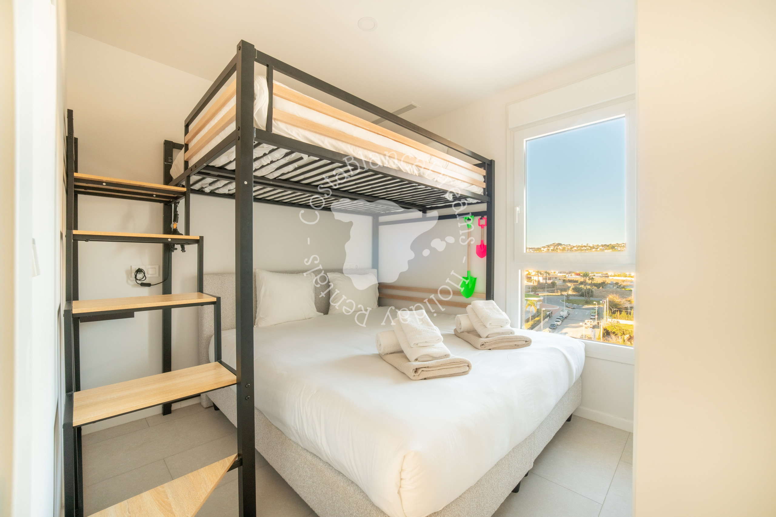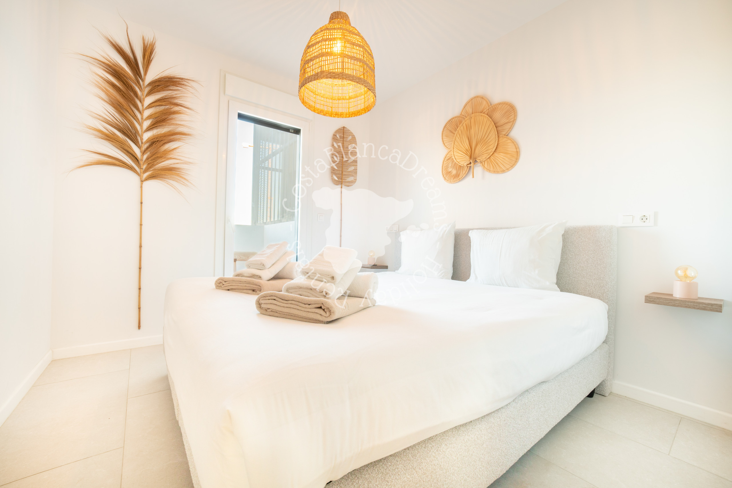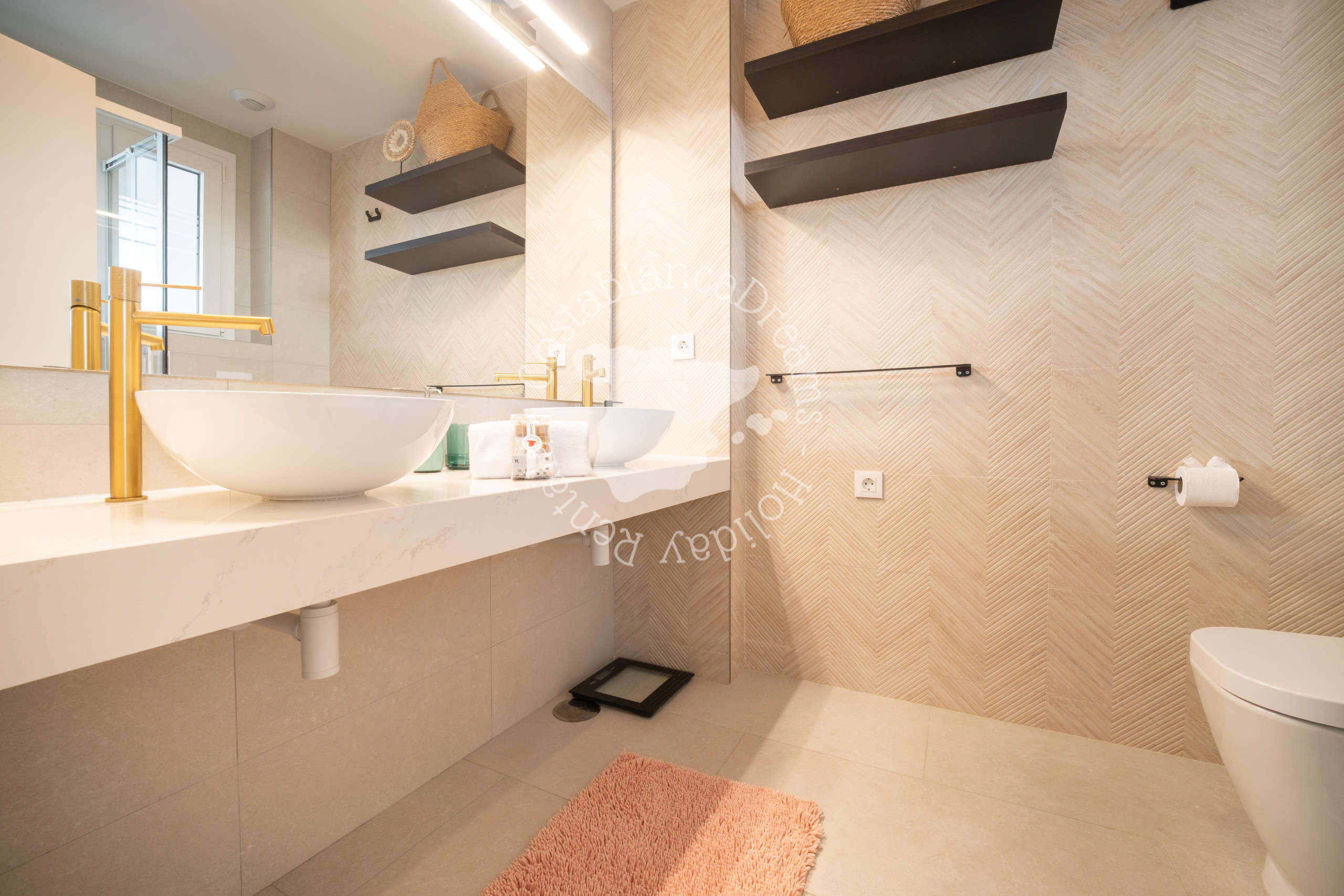 Het appartement beschikt over drie zorgvuldig ontworpen slaapkamers. De hoofdslaapkamer heeft een tweepersoonsbed, royale kastruimte en een eigen badkamer met dubbele wastafels, een douche en een toilet. De tweede slaapkamer heeft ook een tweepersoonsbed en voldoende opbergruimte, terwijl de derde slaapkamer twee eenpersoonsbedden en kastruimte heeft. Deze slaapkamers delen een stijlvolle badkamer met een douche, wastafel en toilet.