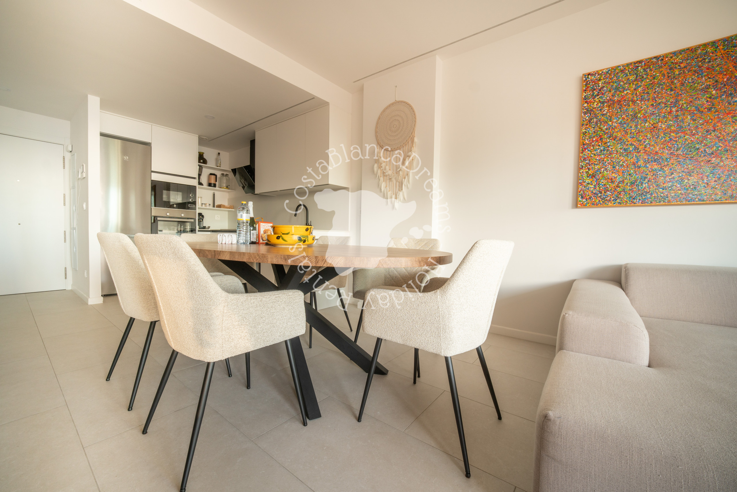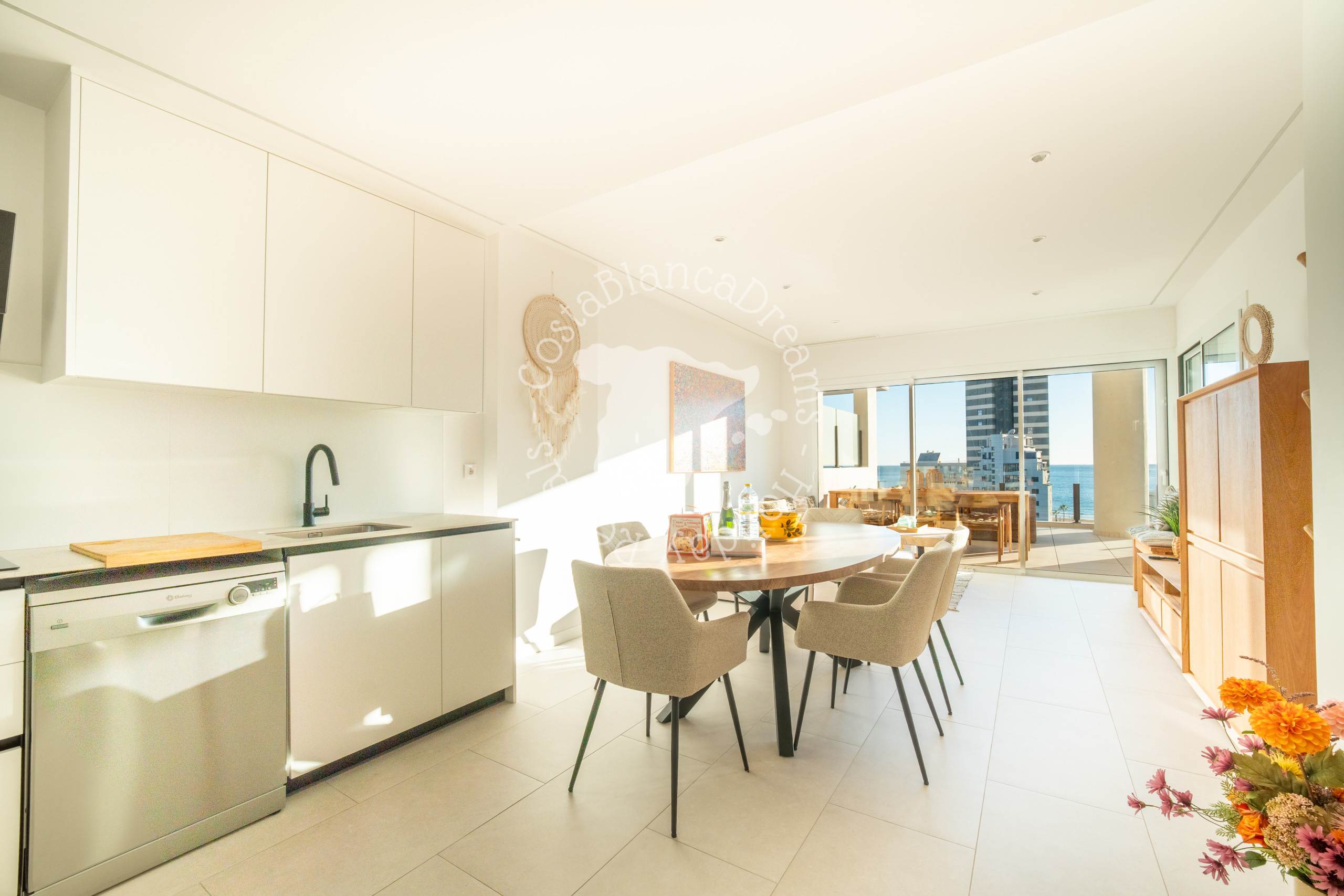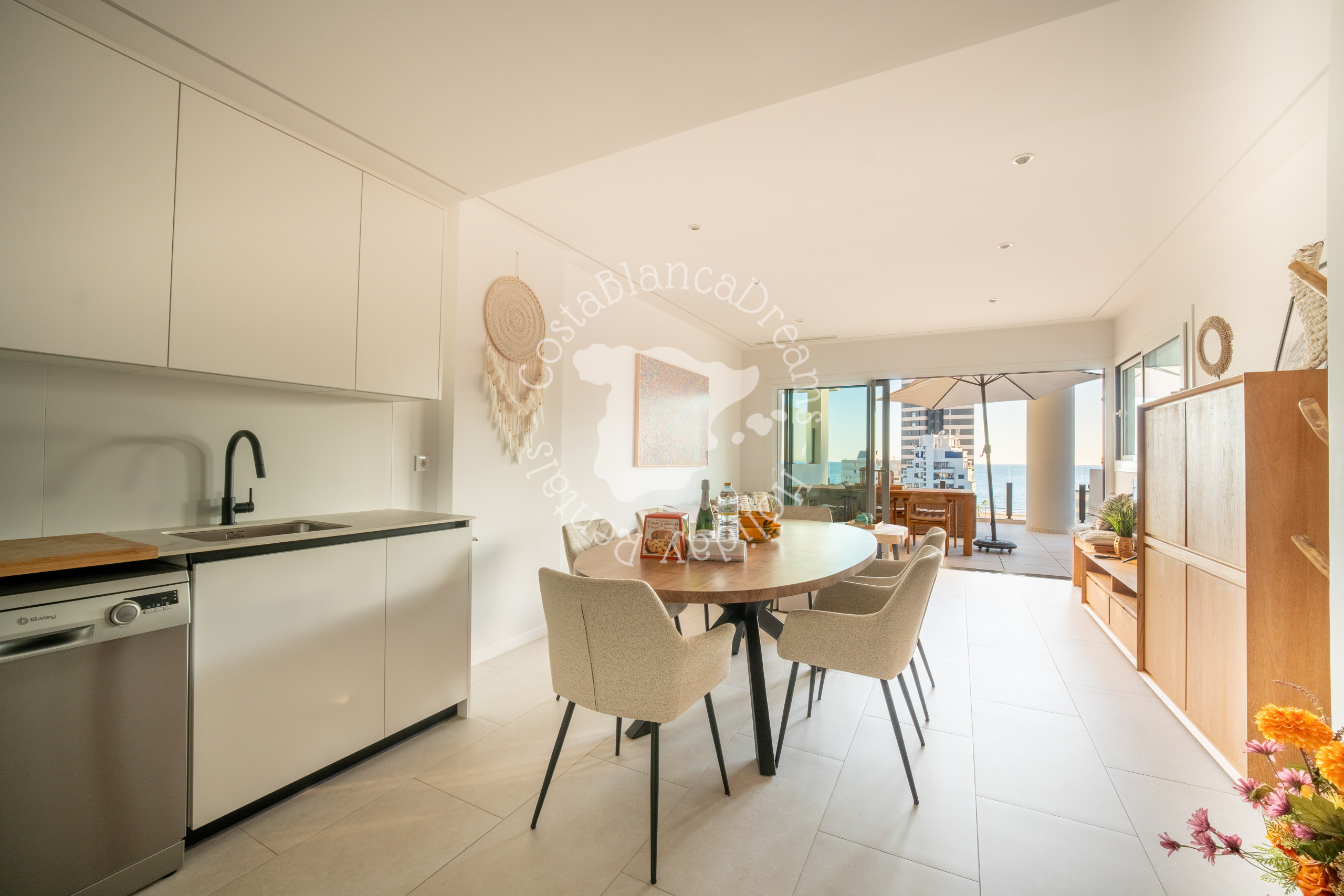 Stap vanuit de woonkamer het ruime privébalkon op, ingericht met een eettafel en twee ligbedden. Dit is de perfecte plek om te genieten van de mediterrane zon terwijl u geniet van een panoramisch uitzicht op de iconische Peñon d'Ifach, de skyline van Calpe, het zoutmeer Les Salines en de sprankelende zee.