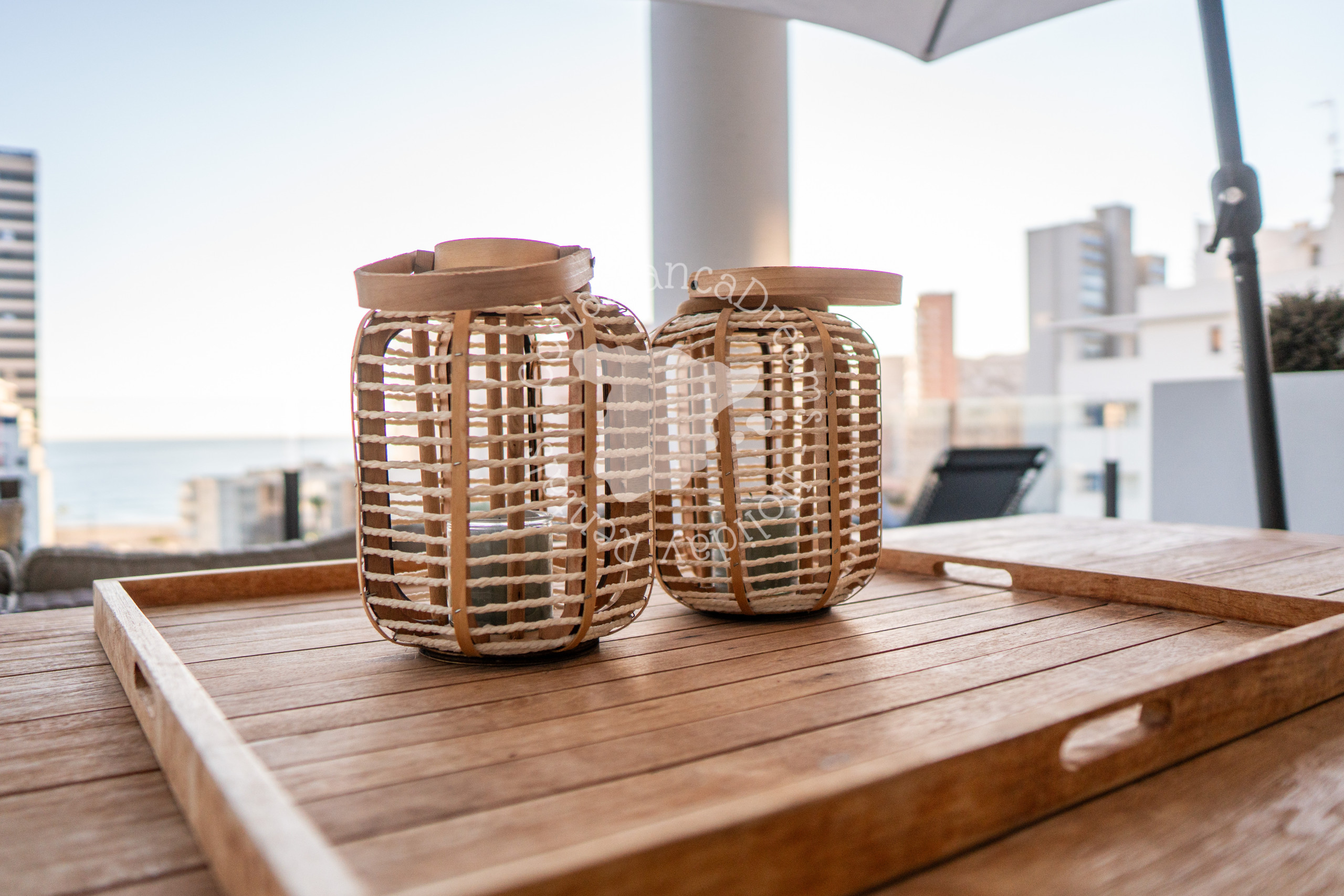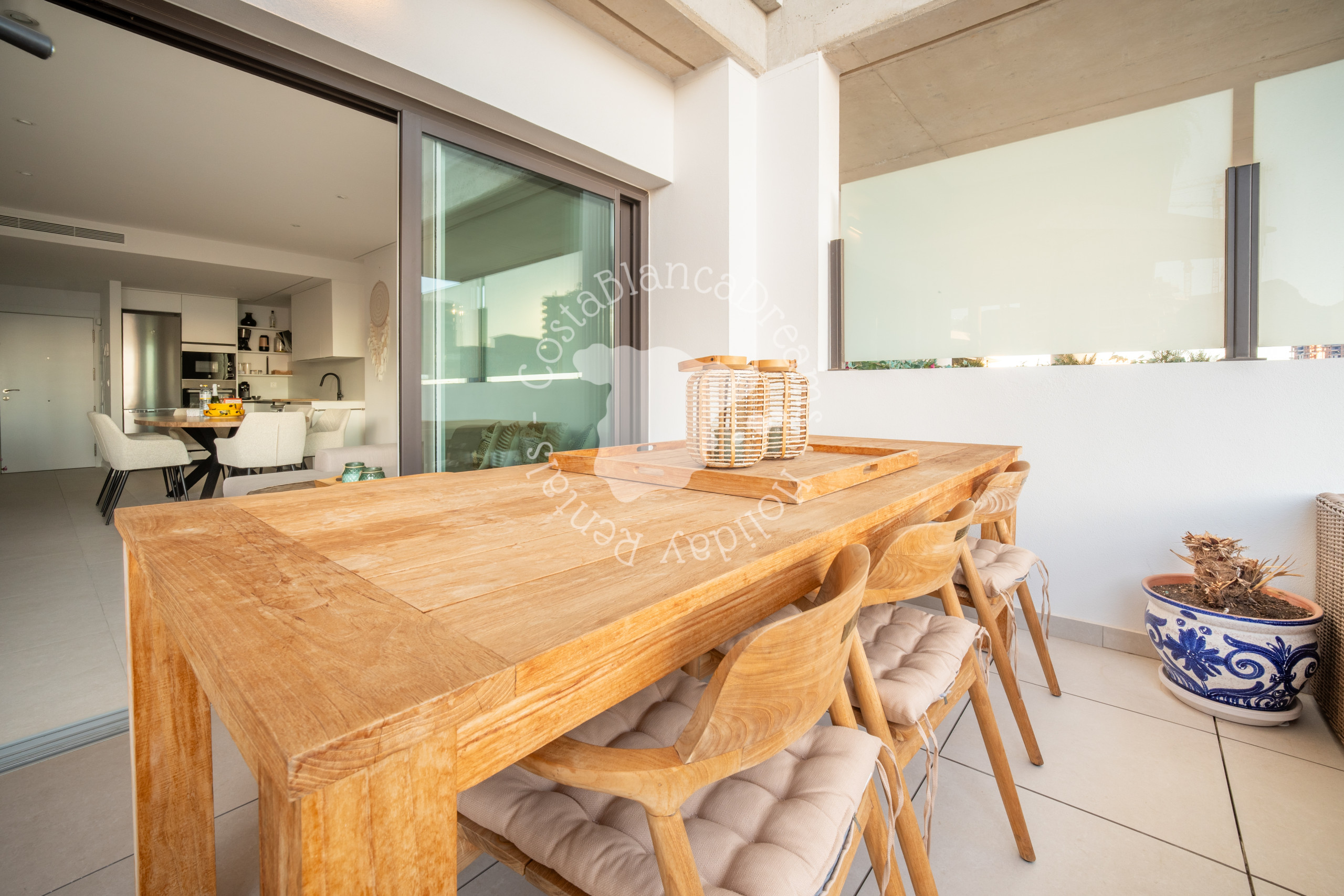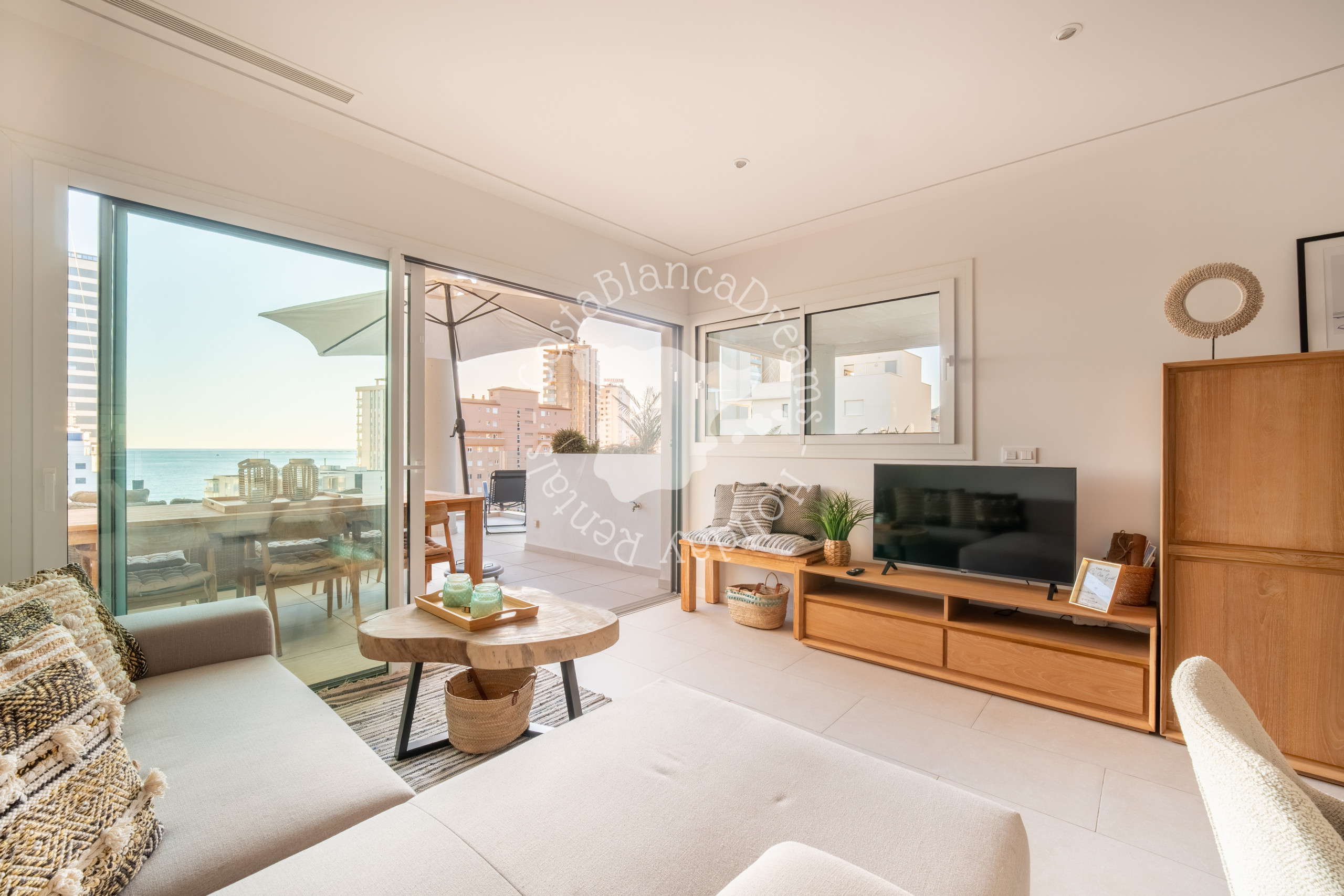 Stap vanuit de woonkamer het ruime privébalkon op, ingericht met een eettafel en twee ligbedden. Dit is de perfecte plek om te genieten van de mediterrane zon terwijl u geniet van een panoramisch uitzicht op de iconische Peñon d'Ifach, de skyline van Calpe, het zoutmeer Les Salines en de sprankelende zee.