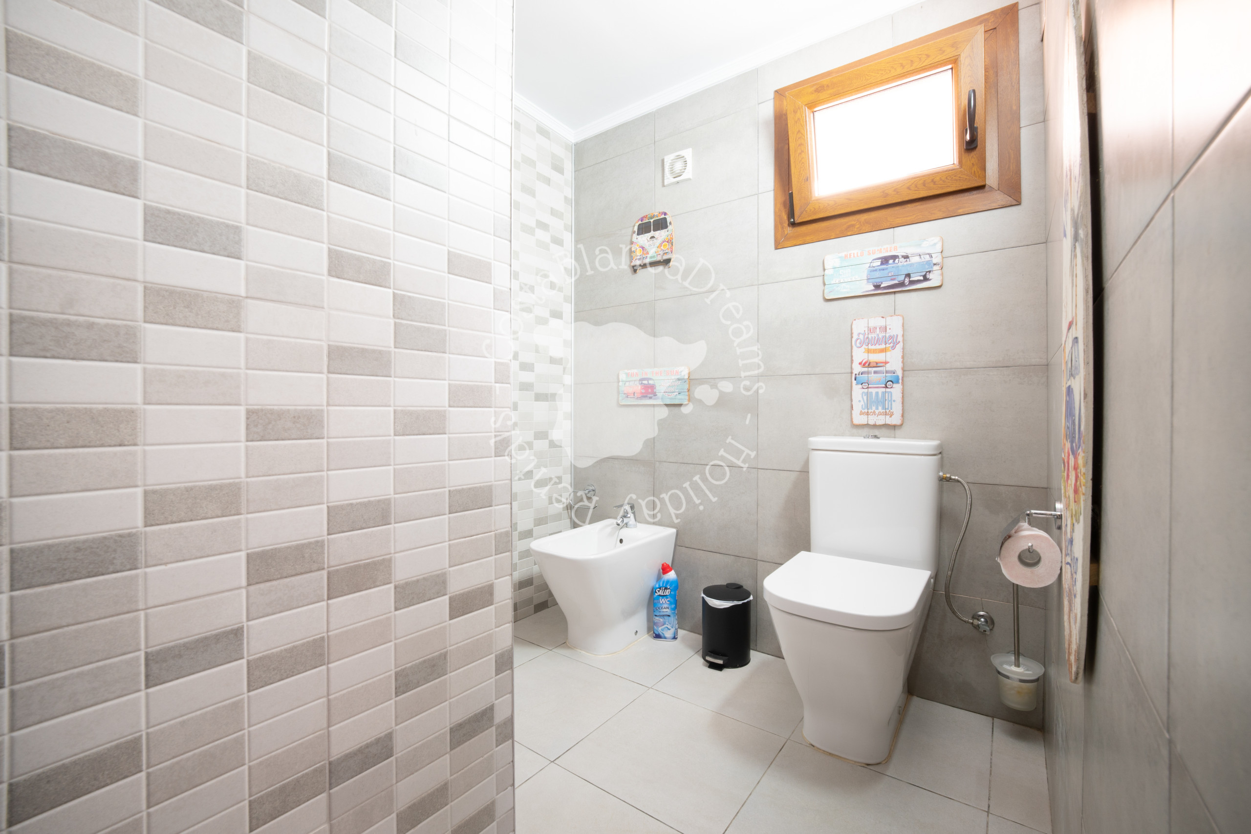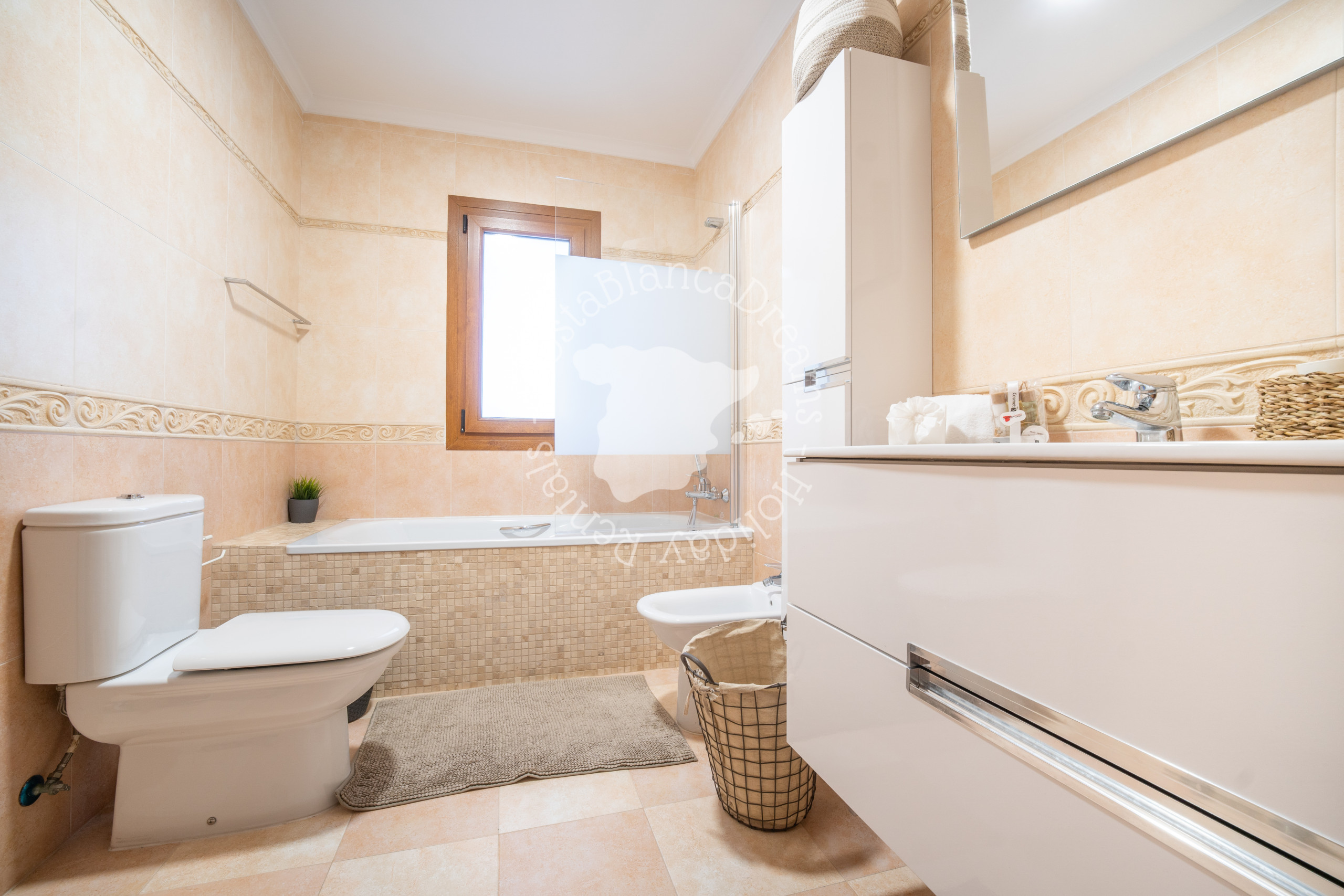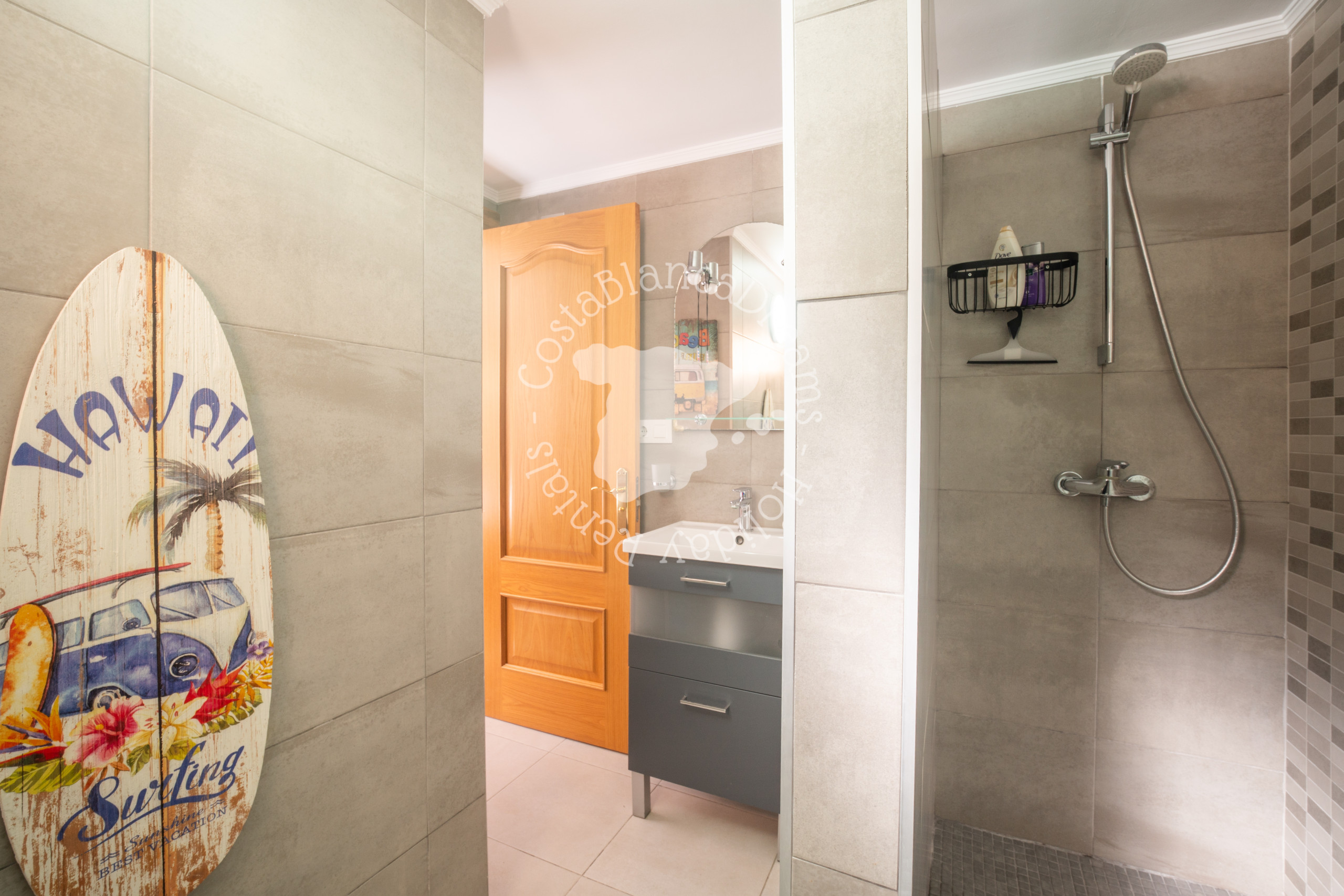 De benedenverdieping biedt een tweede woonkamer met een smart-tv, voor extra privacy. Hier vindt u twee extra slaapkamers met airconditioning, een moderne badkamer met douche, wastafel en toilet, evenals een keuken en een zithoek, waardoor een zelfstandige ruimte ontstaat, ideaal voor gezinnen die samen reizen. Beide verdiepingen hebben aparte ingangen voor extra comfort en gemak.