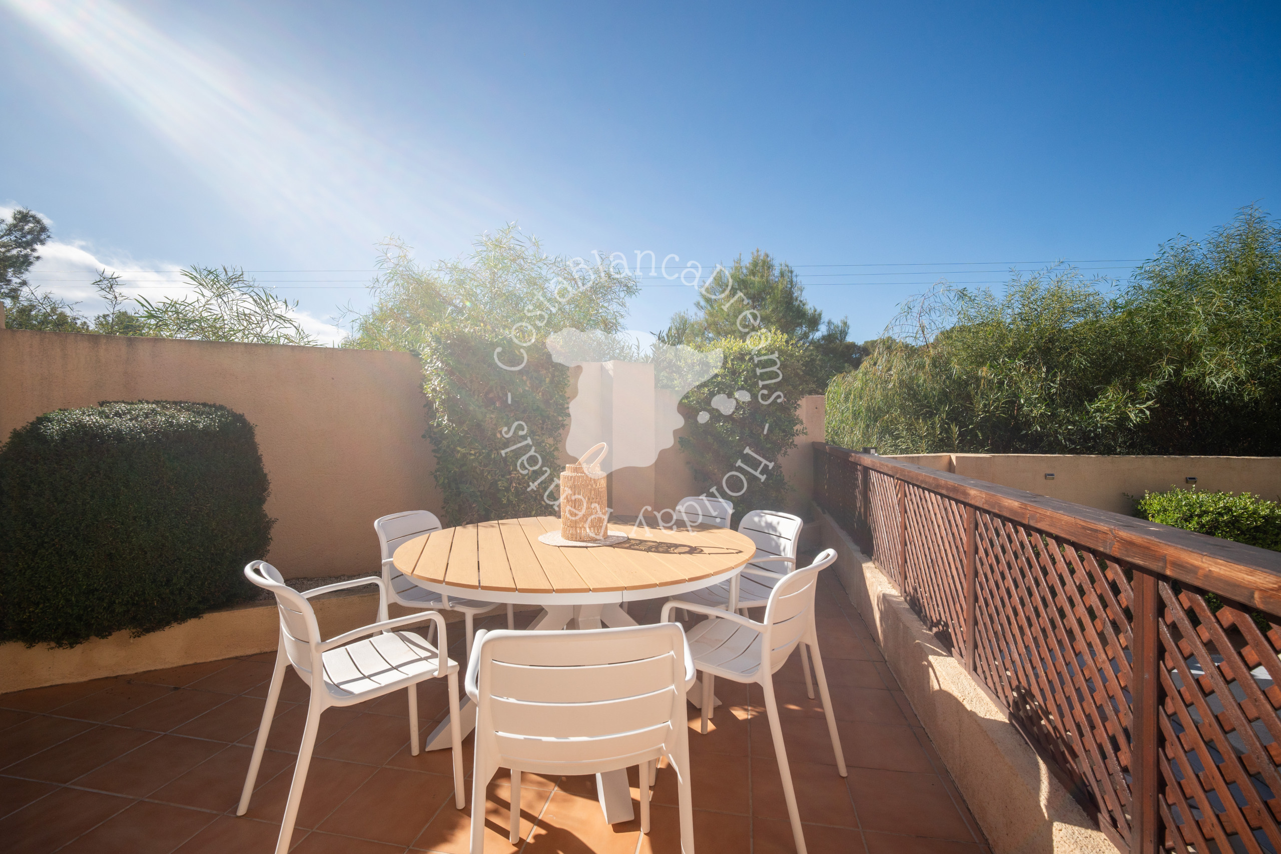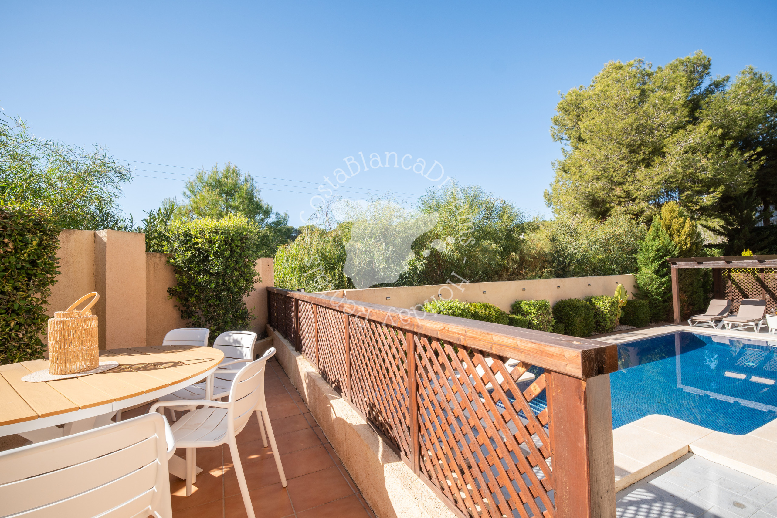 Buiten zorgt de prachtig onderhouden tuin direct voor een ontspannen vakantiestemming. Het zwembad (2,4 x 1,2 meter) vormt het hart van de buitenruimte, omgeven door ligstoelen en schaduwrijke zitjes waar u heerlijk kunt ontspannen en genieten van de Spaanse zon.