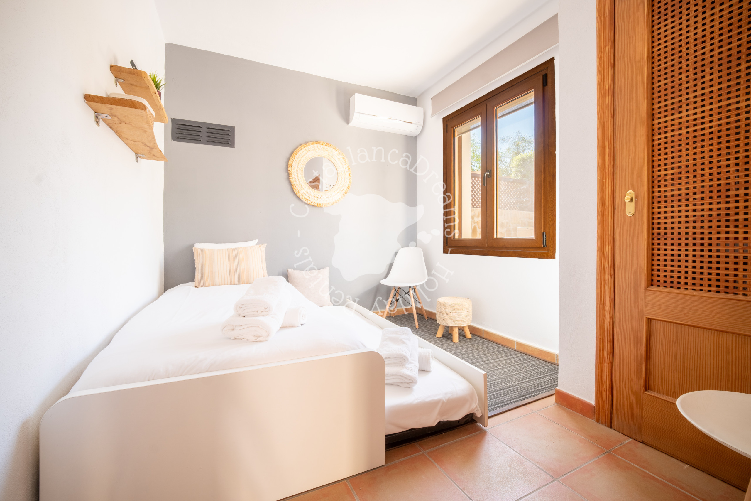 Op de bovenverdieping biedt de ruime master bedroom een privéruimte met airconditioning, Smart TV, een inloopkast, een en-suite badkamer met douche en directe toegang tot een ruim balkon. Op de benedenverdieping, ter hoogte van het zwembad, bevinden zich nog twee slaapkamers, beide met airconditioning en kastruimte. Eén slaapkamer heeft twee éénpersoonsbedden, terwijl de tweede slaapkamer beschikt over een uitschuifbed dat vooral geschikt is voor kinderen. De gedeelde badkamer met douche, wastafel en toilet is alleen toegankelijk via de eerste slaapkamer. Op deze verdieping is ook een praktische kitchenette met wasmachine, droger, Nespresso-apparaat en waterkoker.