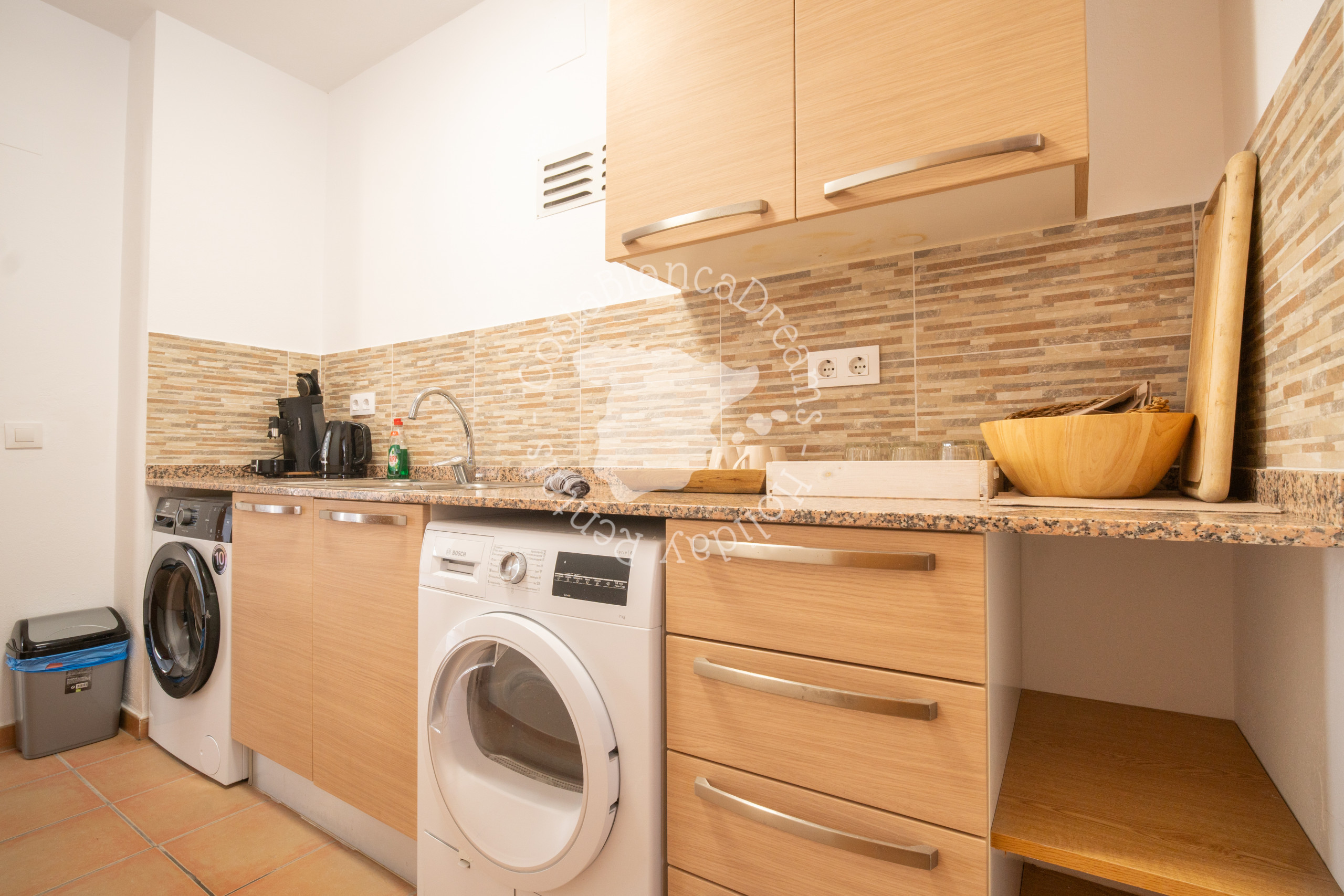 De volledig ingerichte keuken, gelegen net langs de gang, is een culinaire toevluchtsoord met moderne voorzieningen, waaronder een koelkast, vriezer, inductiekookplaat, combi-magnetron, vaatwasser, Nespresso-machine en een waterkoker, waardoor u beschikt over alles wat u nodig heeft voor maaltijdbereiding.