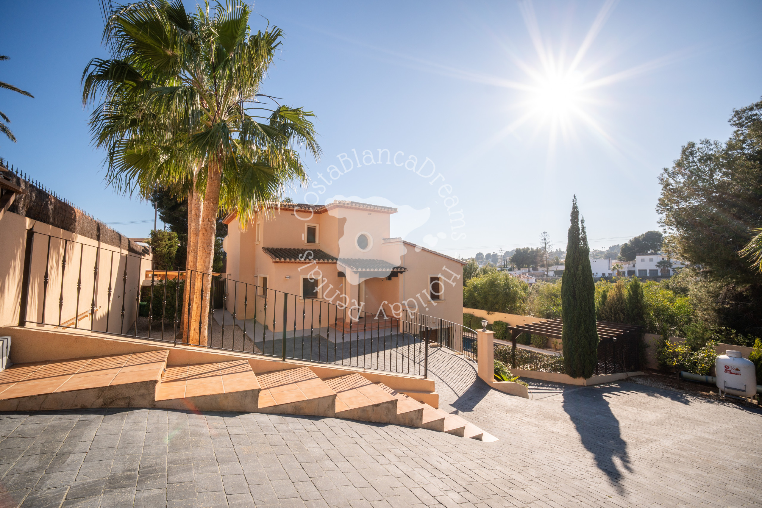 1: U moet trappen beklimmen vanaf de straat om het poolniveau en de villa te bereiken.