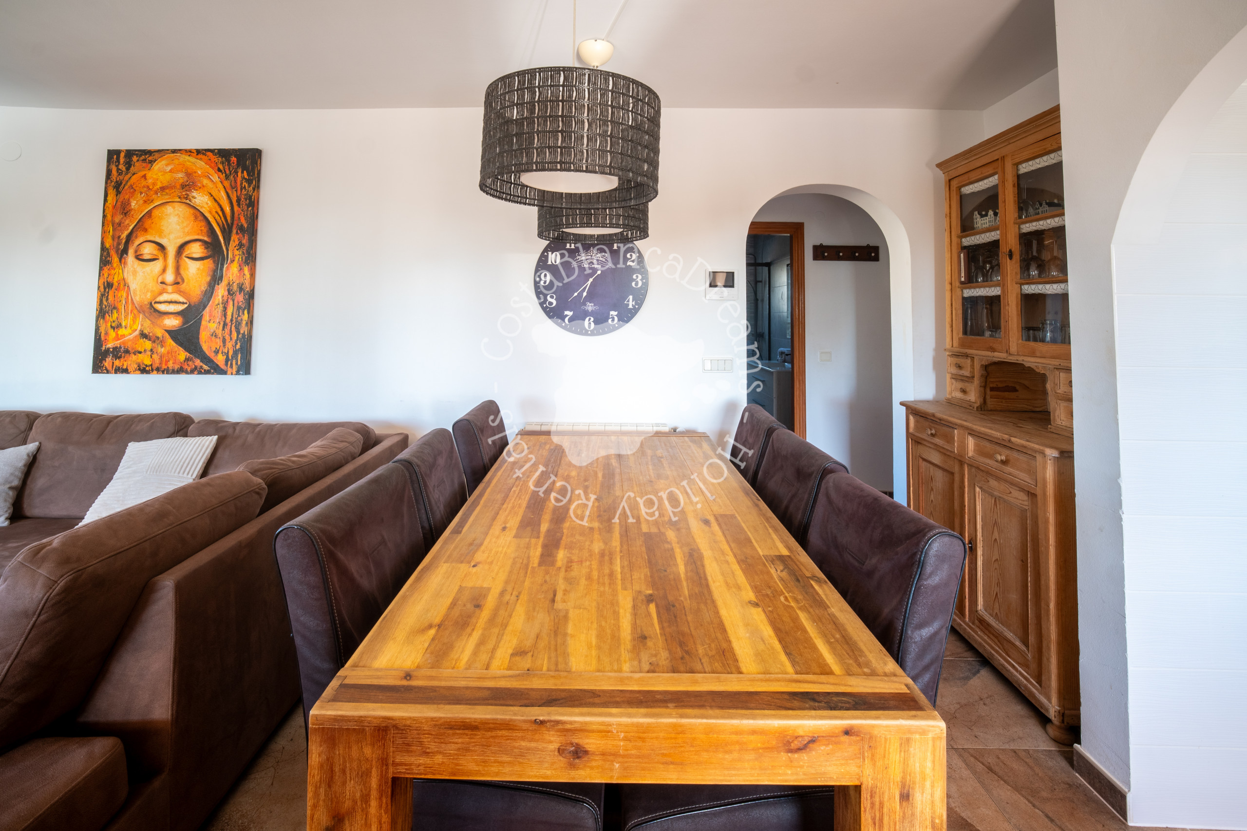 Stap de uitnodigende woonkamer binnen, versierd met een inrichting in Ibiza-stijl en overspoeld met natuurlijk licht. Zak weg in de zachte banken of ontspan in de knusse stoelen terwijl u uw favoriete programma's op de tv bekijkt. Aangrenzend nodigt een eettafel voor zes personen uit tot ontspannen maaltijden met dierbaren, terwijl directe toegang tot de tuin het binnen- en buitenleven naadloos combineert.