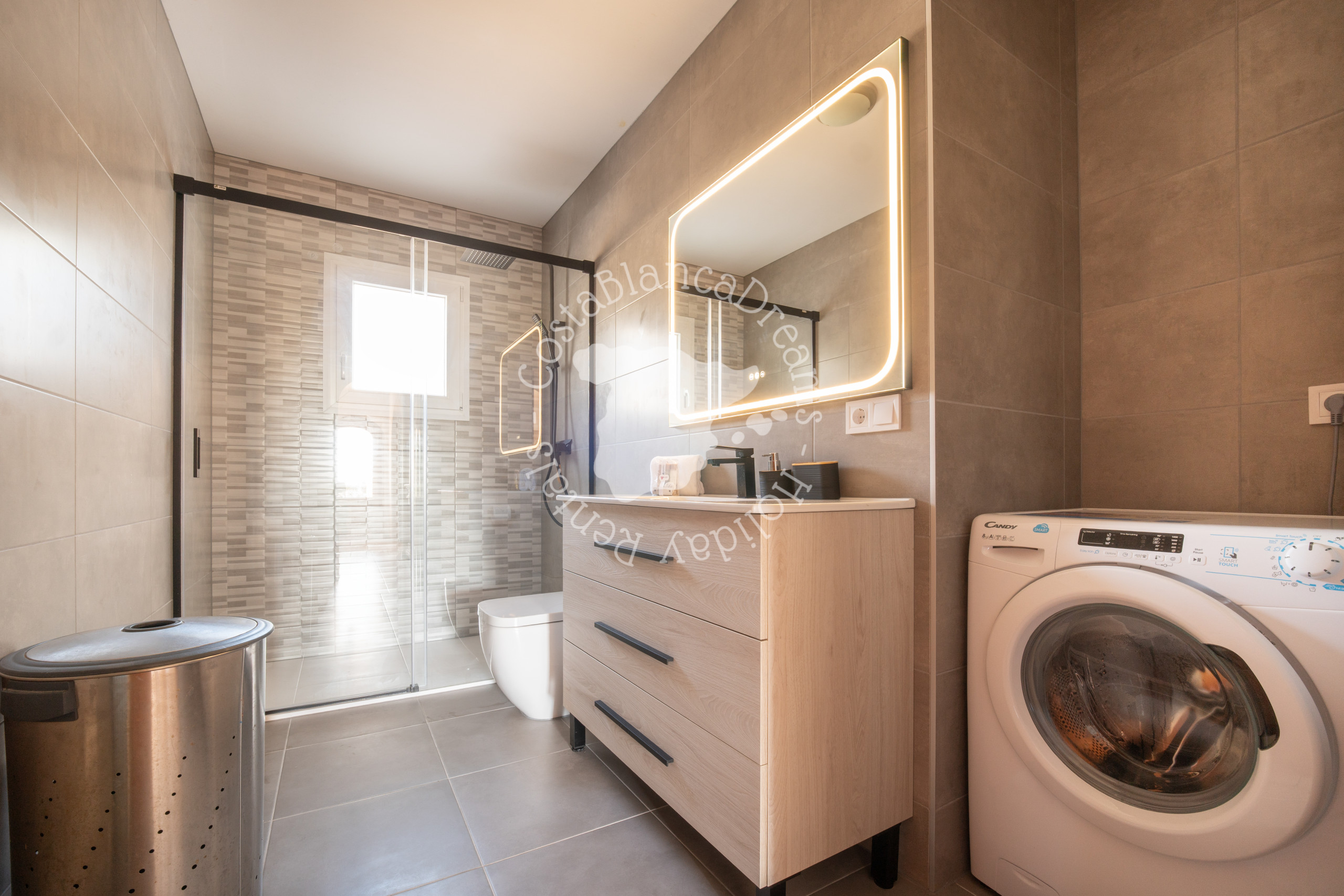 Aan de hal grenzen drie ruime slaapkamers en twee badkamers, die voldoende ruimte bieden voor u en uw dierbaren om te ontspannen. Alle drie de slaapkamers zijn voorzien van een tweepersoonsbed, inbouwkasten en airconditioning. De villa heeft twee aparte badkamers, elk uitgerust met een douche, wastafel en toilet, waarvan één ook een wasmachine heeft.