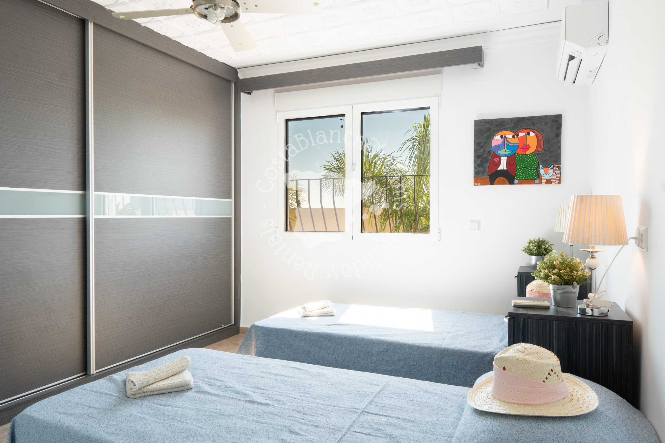 De villa is verdeeld over drie niveaus en biedt vier volledig van airconditioning voorziene slaapkamers. In de loft vind je een lichte slaapkamer met eigen badkamer en balkon, ideaal om ’s ochtends van het uitzicht te genieten. Op de begane grond is een gastvrije tweepersoonskamer met een eigen toilet en wastafel, naast een tweede kamer met twee eenpersoonsbedden. Deze twee kamers delen een ruime badkamer.