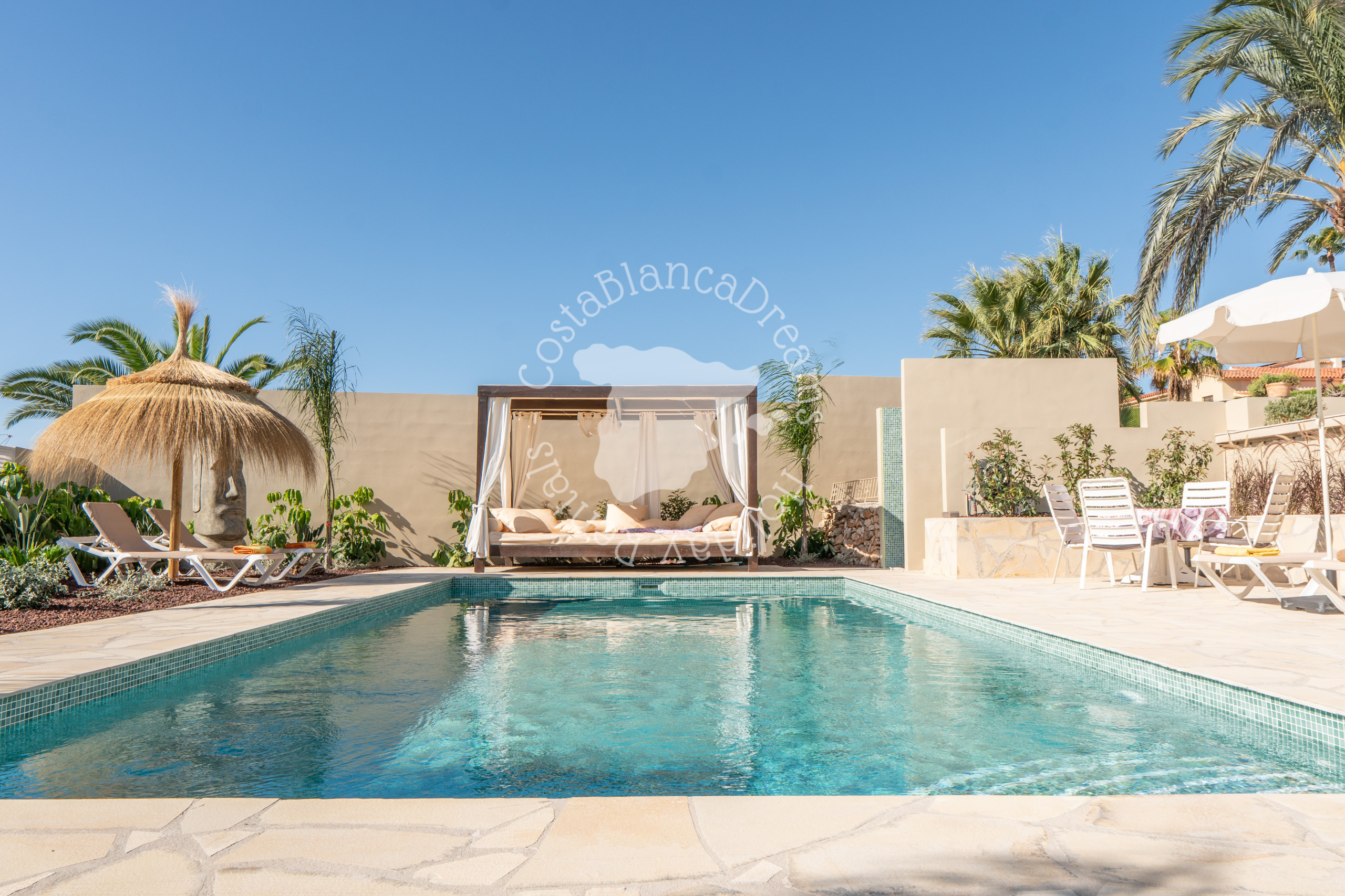Neem een duik in het privézwembad van 8x4, geniet van de zon of ontspan op de ligstoelen langs het zwembad. De buitenbarbecue met grill is perfect om buiten te dineren onder de azuurblauwe hemel van Calpe.