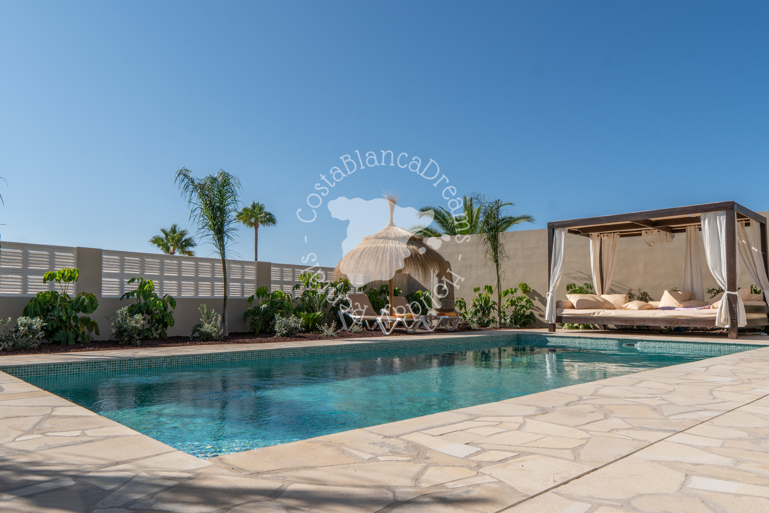 Buiten geniet je volop van het mediterrane leven. Er zijn zowel overdekte als open terrassen, perfect om zowel van de zonsopgang als de zonsondergang te genieten. Op het zwembadniveau vind je twee douches (waarvan één met warm en koud water) en een toilet, allemaal omgeven door muren voor optimale privacy. Ontspan op het buitenbed of één van de ligstoelen – er is meer dan genoeg ruimte voor iedereen.