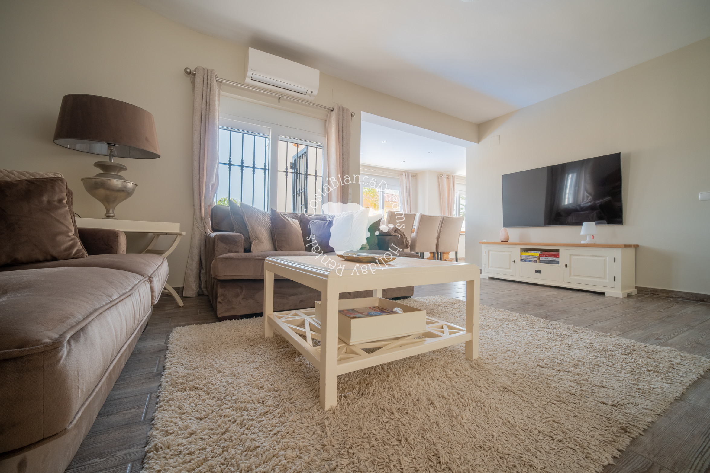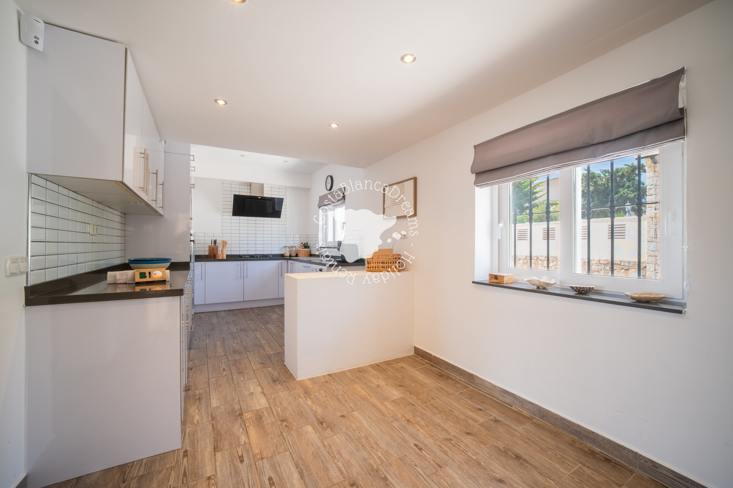 Binnen biedt de villa een lichte en comfortabele leefruimte met airconditioning (warme en koude lucht), een Smart TV en comfortabele banken. De keuken is volledig uitgerust om thuis maaltijden te bereiden, met een grote koelkast, vriezer, oven, magnetron, gasfornuis, l’Or koffiemachine, filterkoffiezetapparaat, waterkoker en vaatwasser.