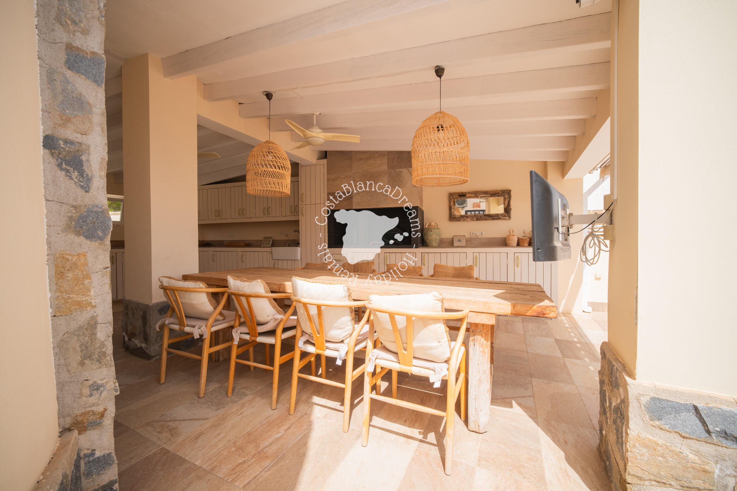 De buitenruimte is perfect ontworpen om optimaal te genieten van de mediterrane levensstijl. Gelegen in een prachtig onderhouden tuin kunnen gasten ontspannen op comfortabele ligbedden, buiten dineren en lange, ontspannen avonden samen doorbrengen in de volledig uitgeruste overdekte buitenkeuken, compleet met een Smart TV, Weber gasbarbecue en gefilterd kraanwater. In het hart van de tuin bevindt zich het privé zoutwaterzwembad (10 x 3,5 meter), aangevuld met een praktische buitenbadkamer, wat zorgt voor een rustige en uitnodigende omgeving voor zowel ontspanning als samenzijn. Het zwembad kan ook worden verwarmd (zie details hieronder) en is voorzien van een veiligheidshek, wat het bijzonder geschikt maakt voor gezinnen met jonge kinderen.