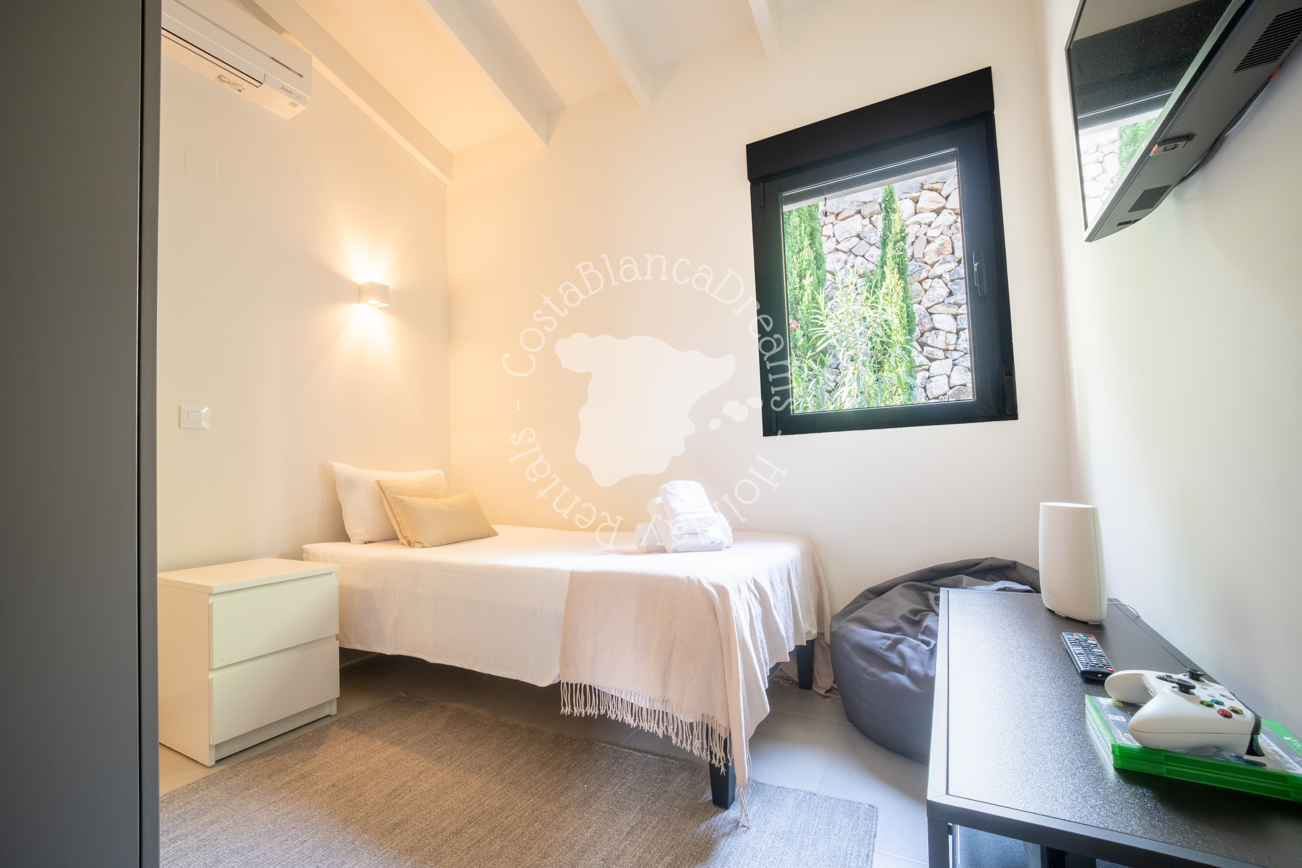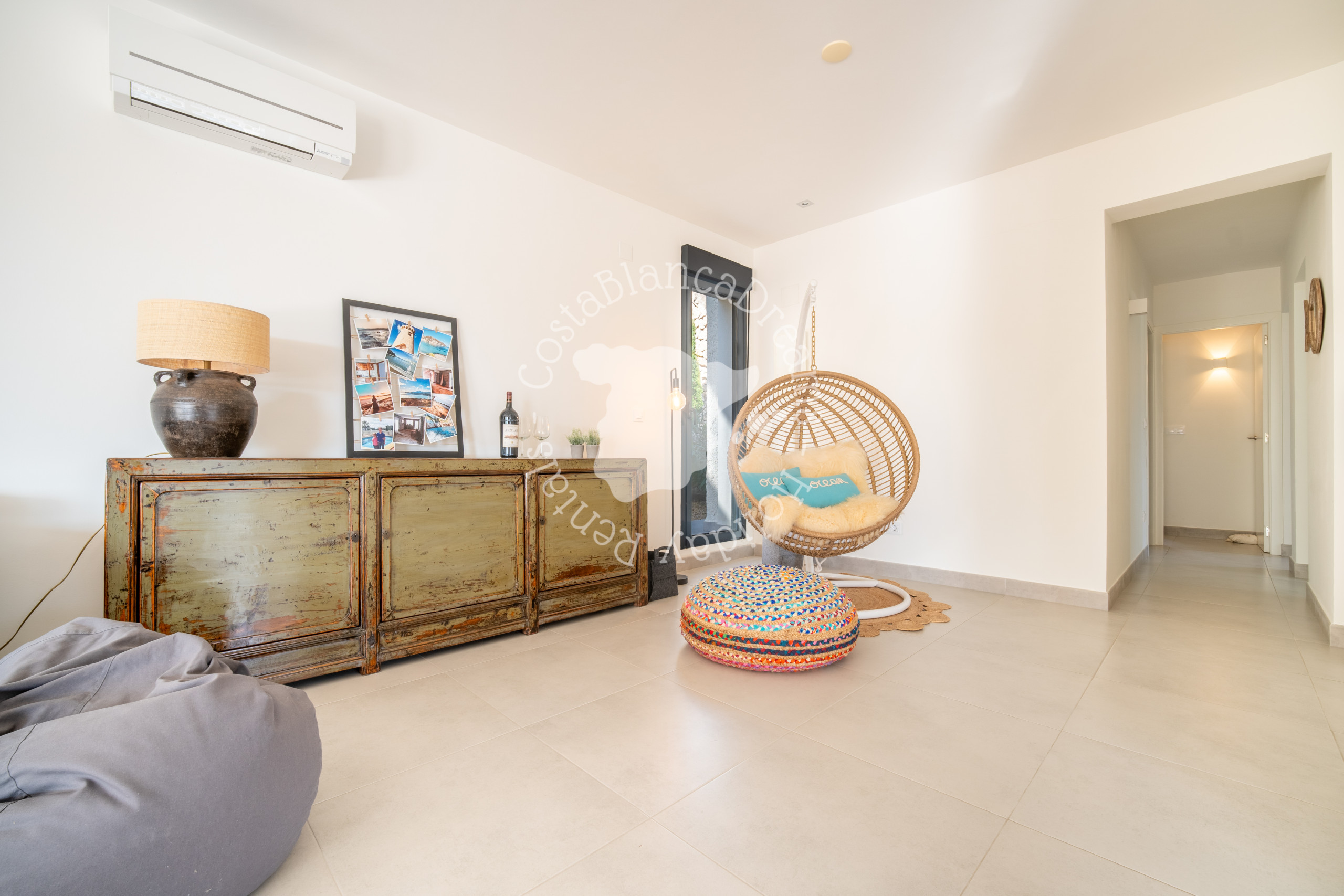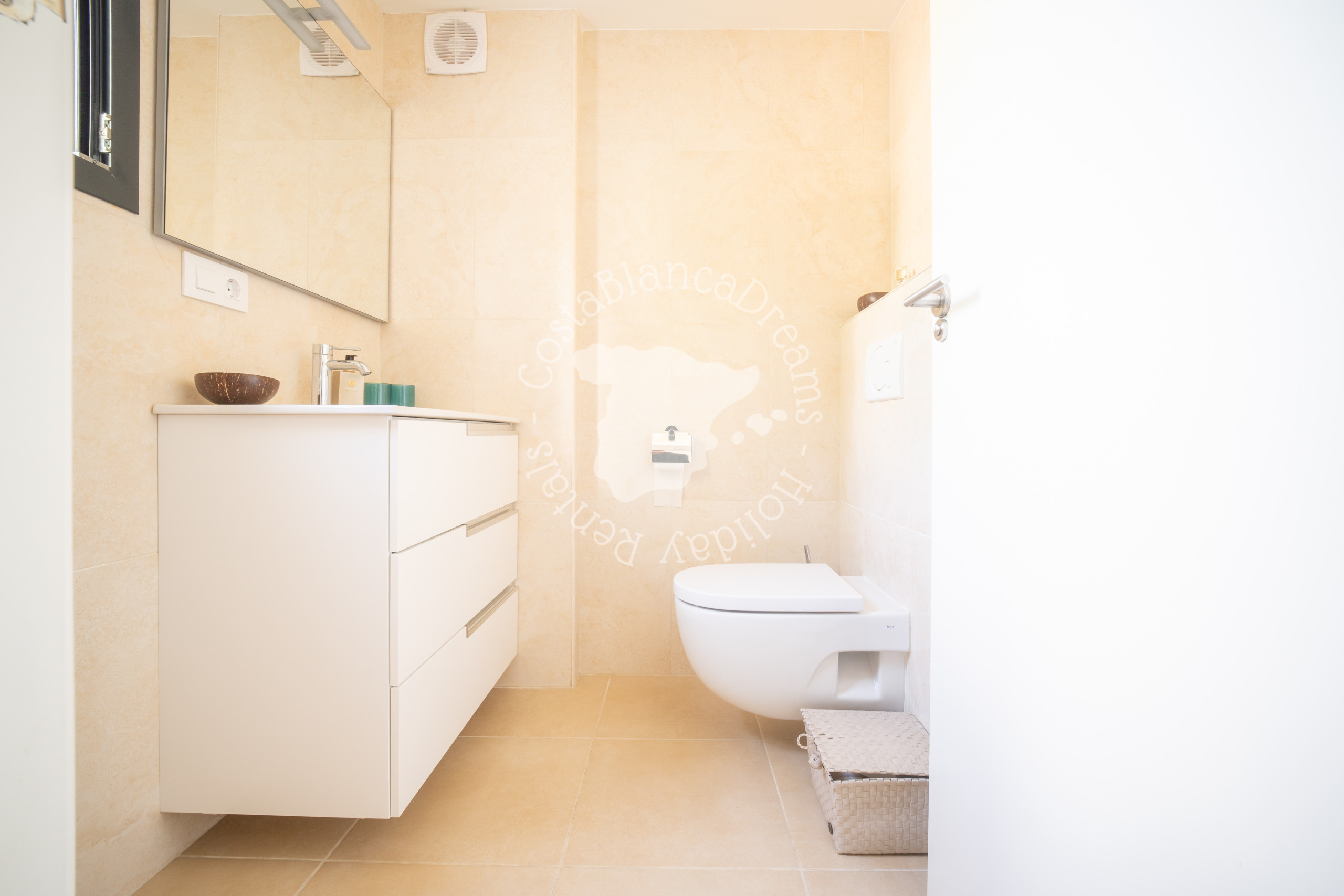 De bovenste verdieping verwelkomt u met een lichte woonkamer met comfortabele banken, een prachtig uitzicht op de zee en een apart thuiskantoor. Ontspan in de gezellige lounge met Smart TV, waarop u uw eigen Netflix-account kunt gebruiken en naar de Duitse satelliet-tv en Spaanse zenders kunt kijken. Of stap naar buiten op het halfoverdekte terras, waar u kunt dineren terwijl u geniet van het betoverende uitzicht op de zee en de vallei.