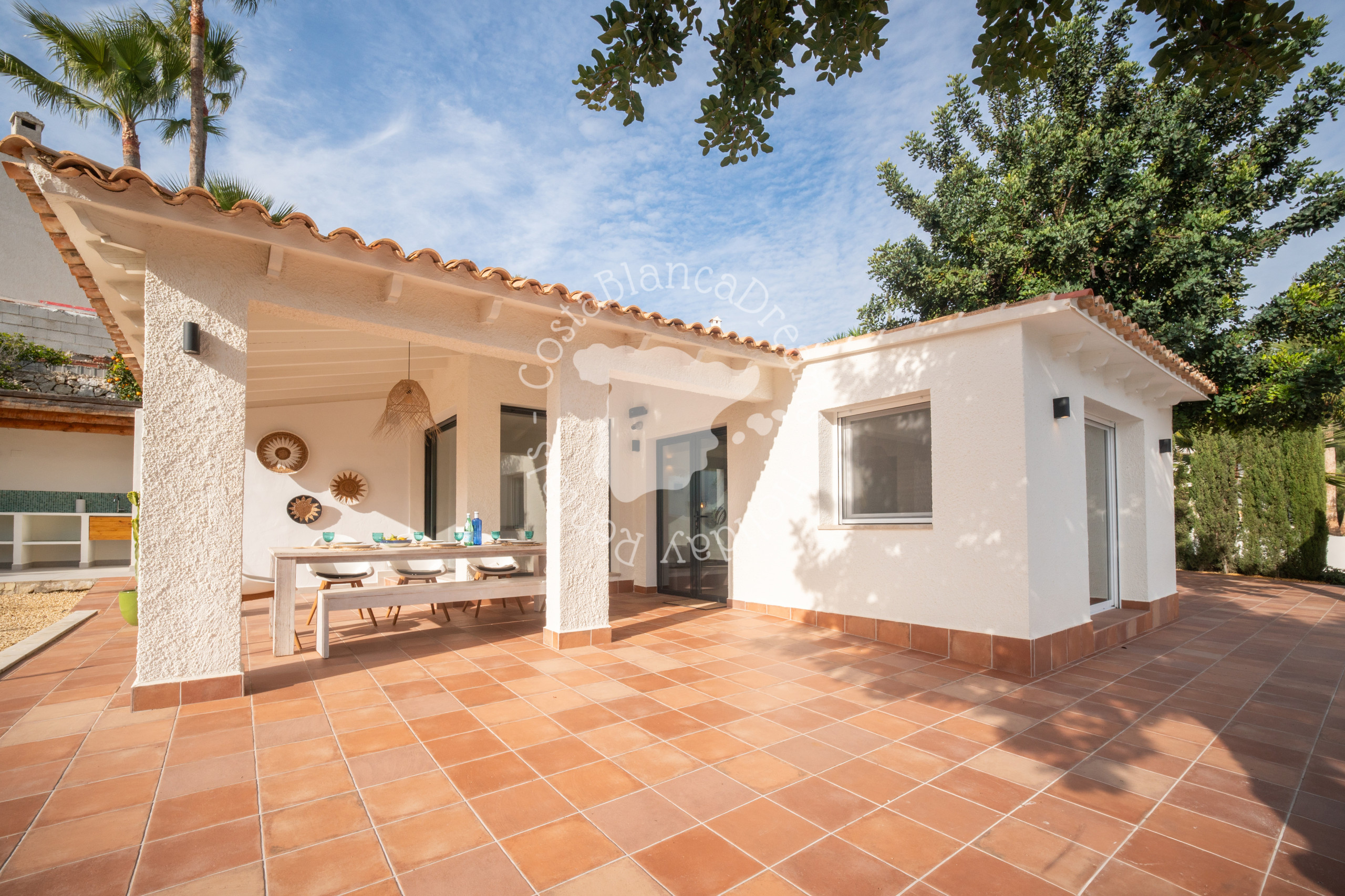Buiten komt Casa Amahle volledig tot zijn recht met een zeer ruime, prachtig onderhouden tuin en open uitzicht over de omgeving, Cap d’Or met zijn toren en zelfs een klein zeezicht op de baai van El Portet. Gasten kunnen optimaal genieten van het buitenleven dankzij de overdekte eethoek en de Ibiza-stijl buitenkeuken met Weber gasbarbecue en spoelbak. Het privézwembad meet 8 x 4 meter en kan op verzoek worden verwarmd (zie details hieronder). De buitendouche is ideaal om af te spoelen na een zonnige dag aan het strand en het zwembad is omgeven door ligbedden, perfect om te ontspannen onder de mediterrane zon. Naast het zwembad bevindt zich een overdekte naya in Ibiza-stijl met twee comfortabele loungesofa’s en een kleine koelkast, een heerlijke schaduwrijke plek met uitzicht op het zwembad en de tuin. Daarnaast zijn er een gezellige daybed en extra loungesofa’s geplaatst, zodat gasten optimaal kunnen genieten van comfort en omgeving.