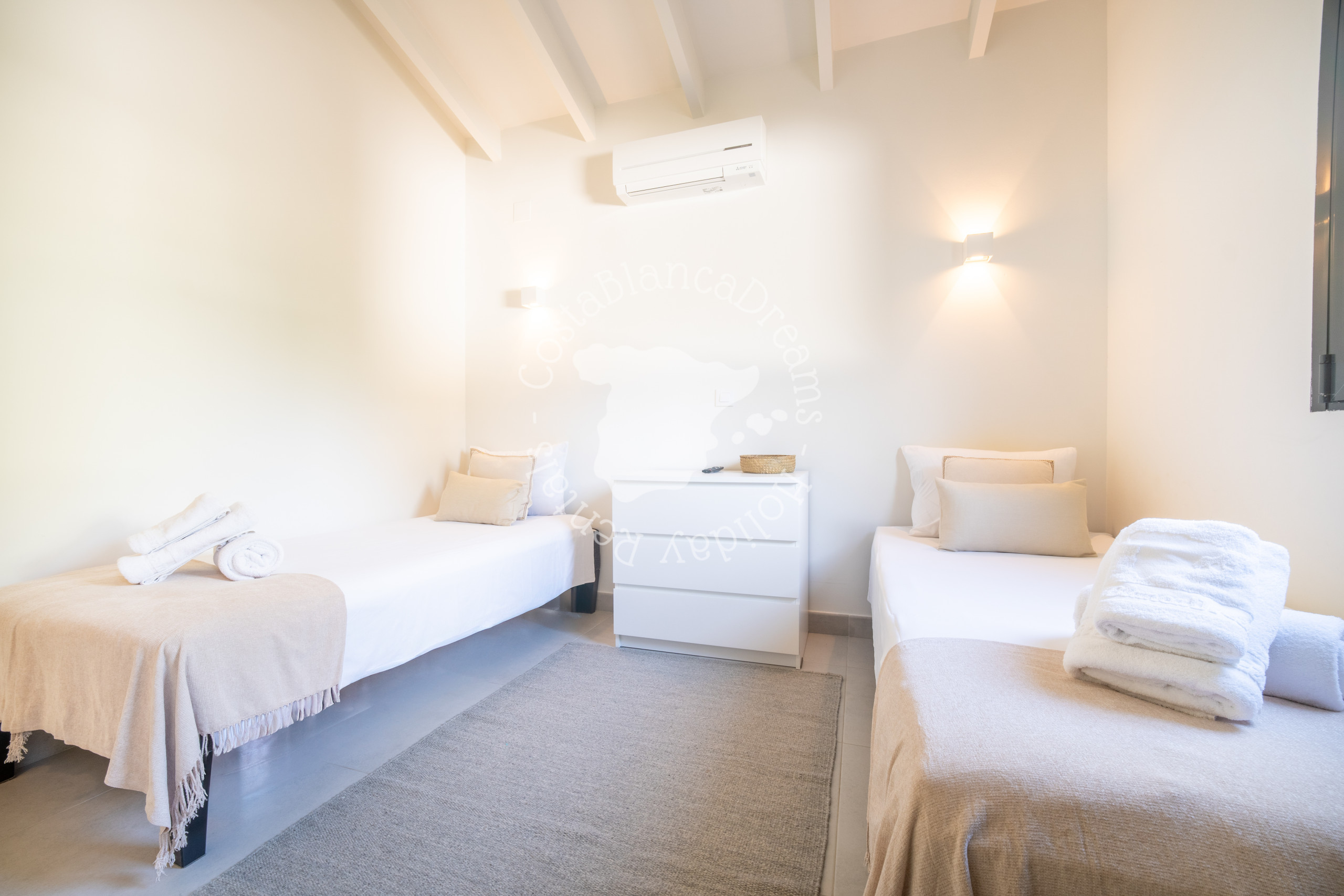 Loop door de gang en ontdek drie prachtig ingerichte slaapkamers, elk voorzien van airconditioning en kastruimte voor uw comfort. De hoofdslaapkamer heeft een tweepersoonsbed en een aangrenzende afgesloten naya, biedt prachtig uitzicht op de vallei en is ingericht met twee uitnodigende loungestoelen. De ensuite badkamer beschikt over een douche, wastafel en toilet.