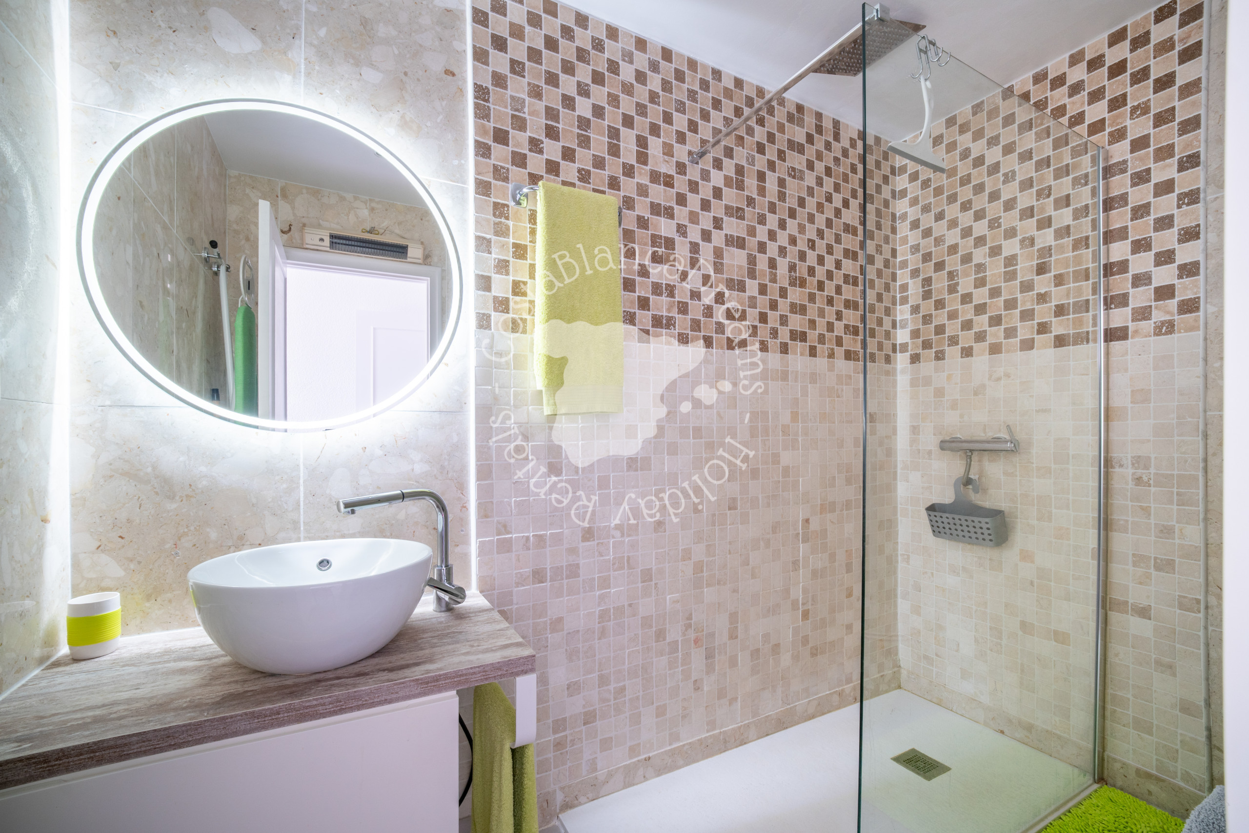 La suite principal tiene su baño privado que incluye una hermosa ducha a ras de suelo y lavabos. El dormitorio principal ofrece una cama doble, un gran tocador en el pasillo y aire acondicionado. El segundo dormitorio ofrece también una cama doble y aire acondicionado con un baño con ducha en el pasillo.