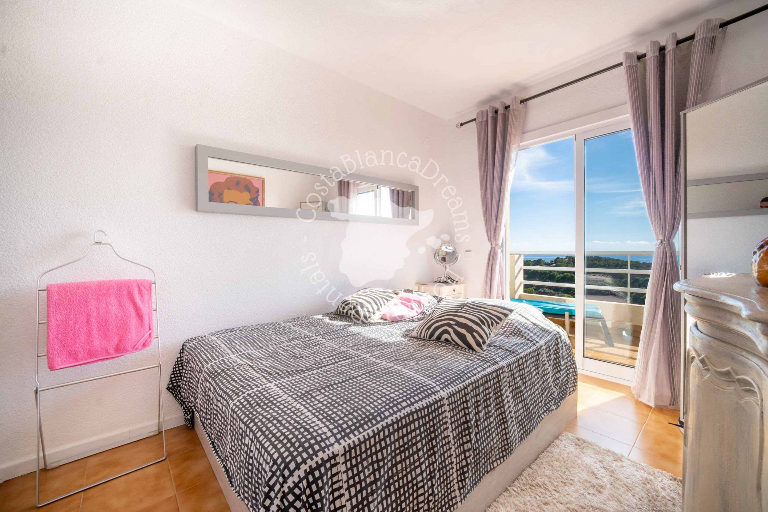 Una escalera interior conduce a la planta superior, donde se encuentran los dos dormitorios. El dormitorio principal dispone de una cama doble, ventilador de techo, TV, armario y un baño en suite con ducha, lavabo e inodoro. El segundo dormitorio también cuenta con una cama doble, ventilador de techo y armario, y tiene su propio baño privado con ducha, lavabo e inodoro. Ambos dormitorios ofrecen acceso directo a un balcón, desde donde podrá disfrutar nuevamente de agradables vistas a las colinas circundantes, el campo de golf y el mar al fondo.
