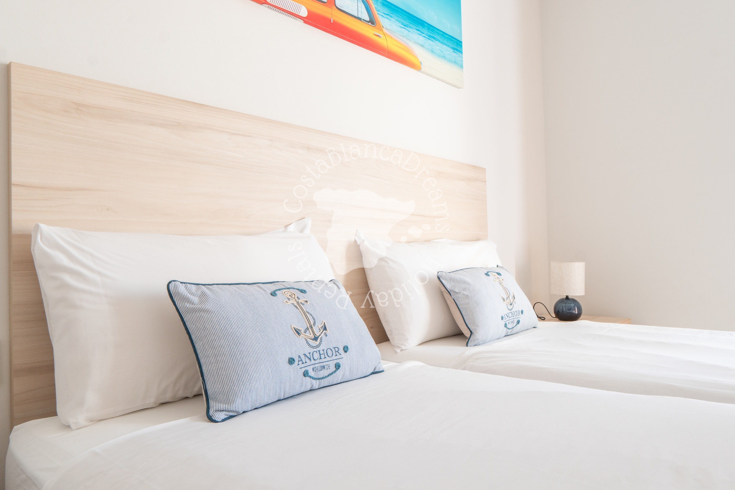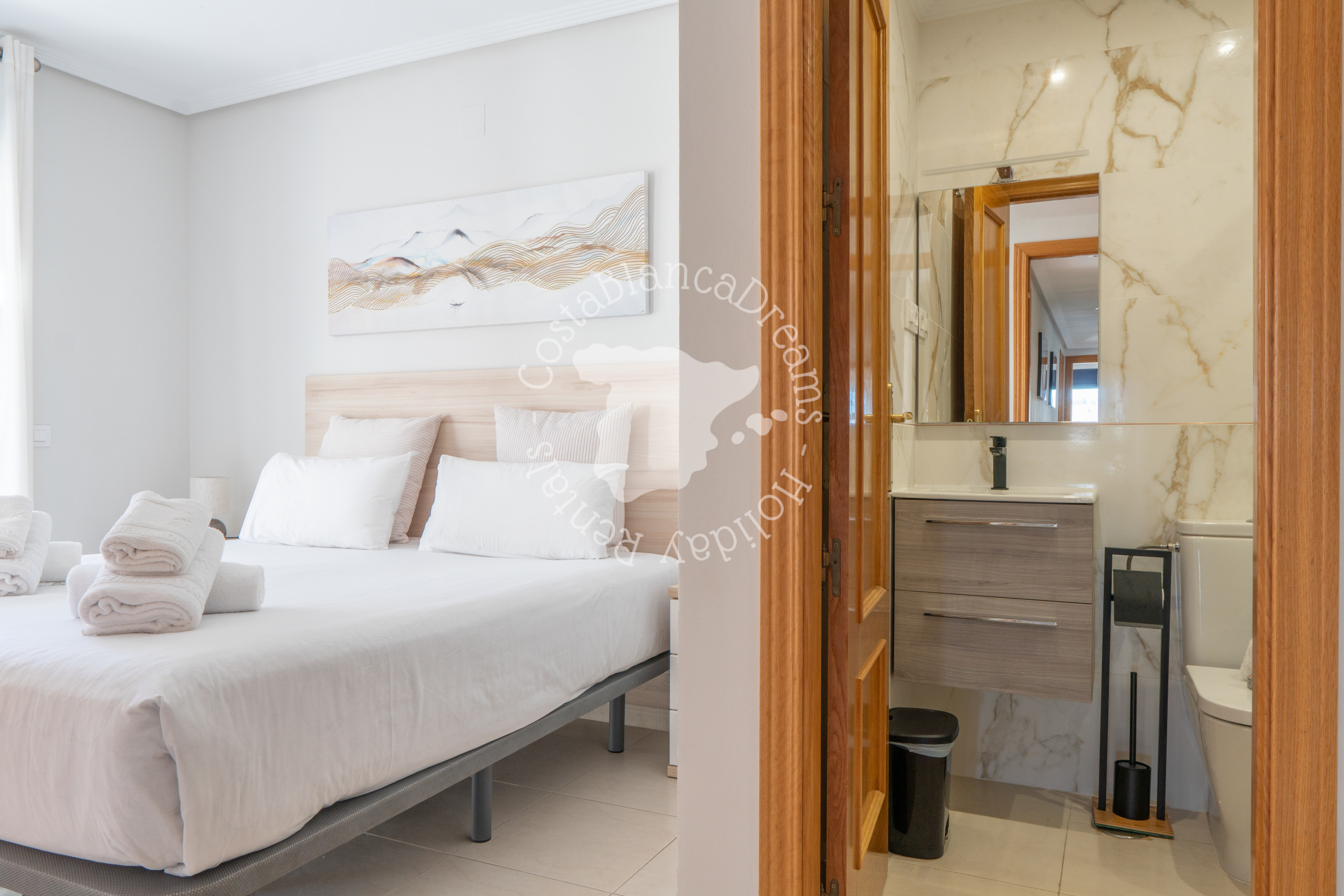 El apartamento cuenta con tres dormitorios cuidadosamente diseñados. El dormitorio principal cuenta con una cama doble, un amplio espacio de guardarropas y un baño privado equipado con dos lavabos, ducha e inodoro. El segundo dormitorio también ofrece una cama doble y un amplio espacio de almacenamiento, mientras que el tercer dormitorio cuenta con dos camas individuales y espacio de guardarropas. Estos dormitorios comparten un elegante baño con ducha, lavabo e inodoro.