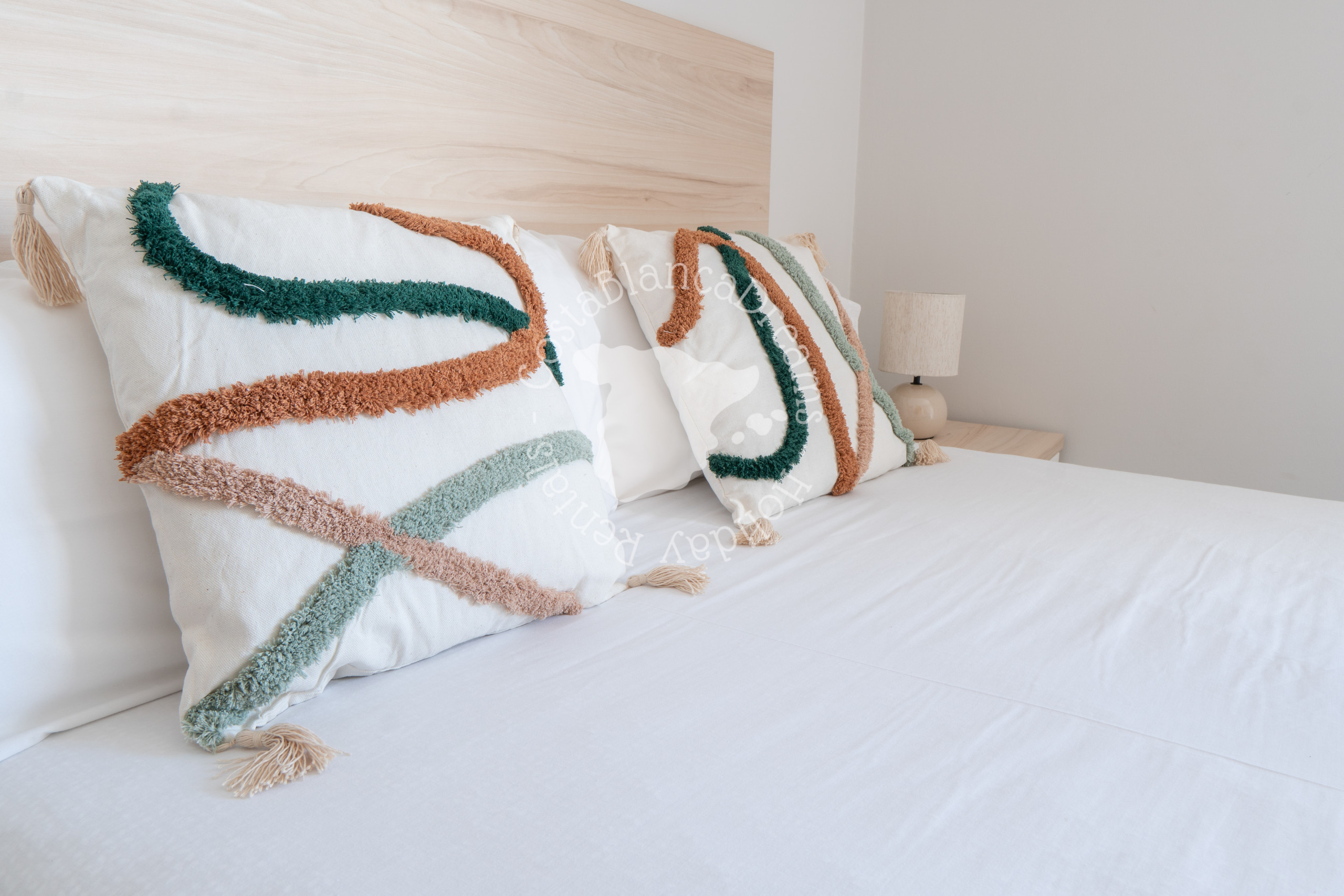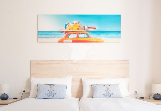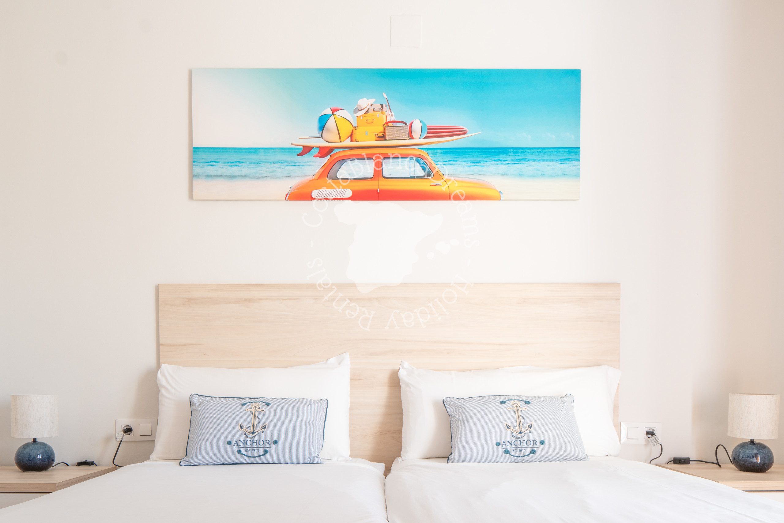 El apartamento cuenta con tres dormitorios con aire acondicionado y dos baños completos, uno de ellos en suite. El dormitorio principal ofrece una cama king-size, mientras que el segundo y el tercer dormitorio tienen una cama doble y dos camas individuales, respectivamente.
