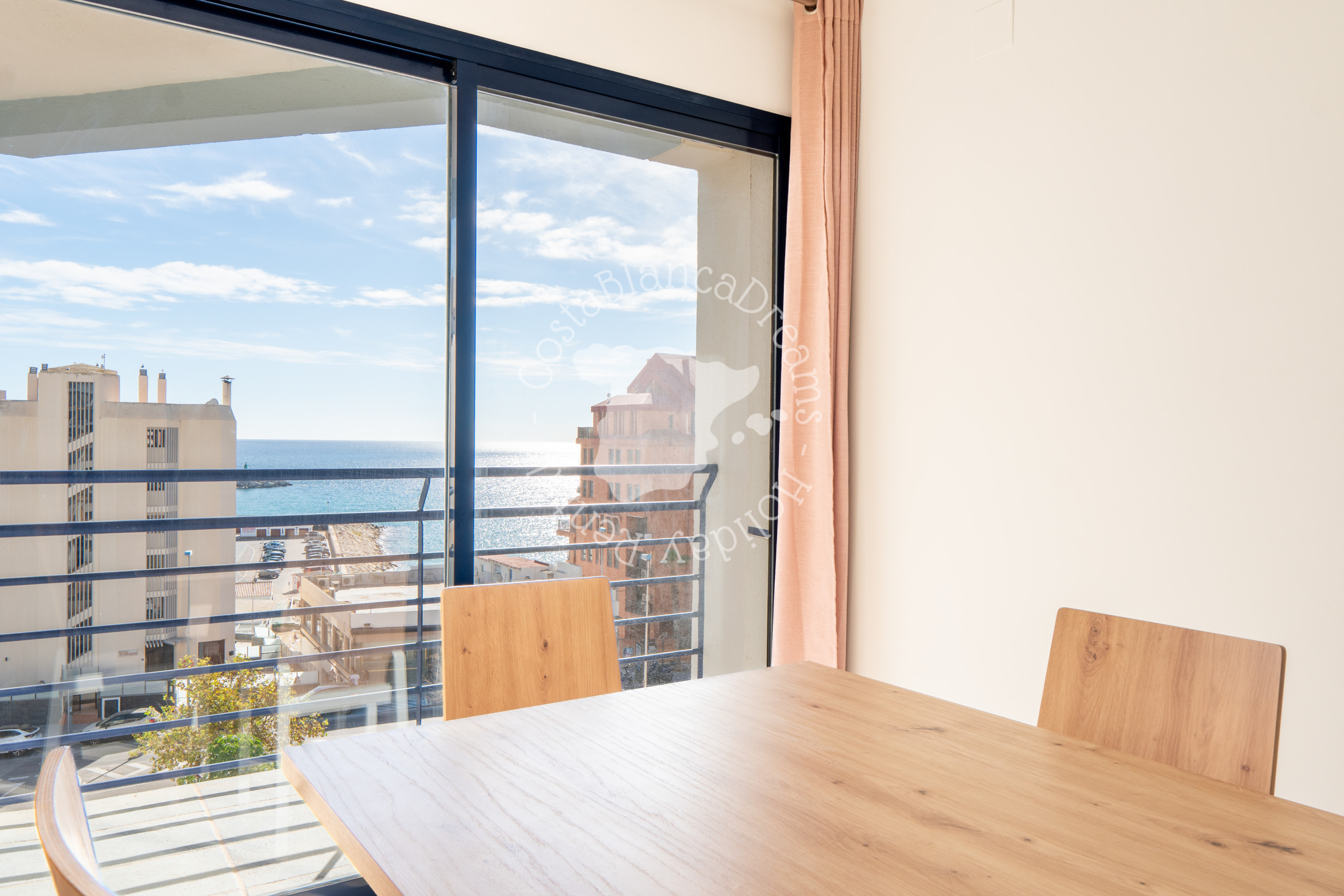 Al entrar, accederá a un luminoso y acogedor salón. La moderna cocina americana está totalmente equipada con electrodomésticos de alta gama, como nevera, congelador, placa de inducción, horno, microondas, lavavajillas, tostadora, exprimidor, batidora de mano, hervidor de agua y cafetera Nespresso. Junto a la cocina, una elegante mesa de comedor con capacidad para seis personas se integra a la perfección con el salón, donde un cómodo sofá se encuentra frente a una Smart TV. Unas amplias puertas correderas dan acceso a un balcón orientado al sur, con una mesa de comedor exterior y una sala de estar, ideal para disfrutar de un café por la mañana o relajarse por la noche.