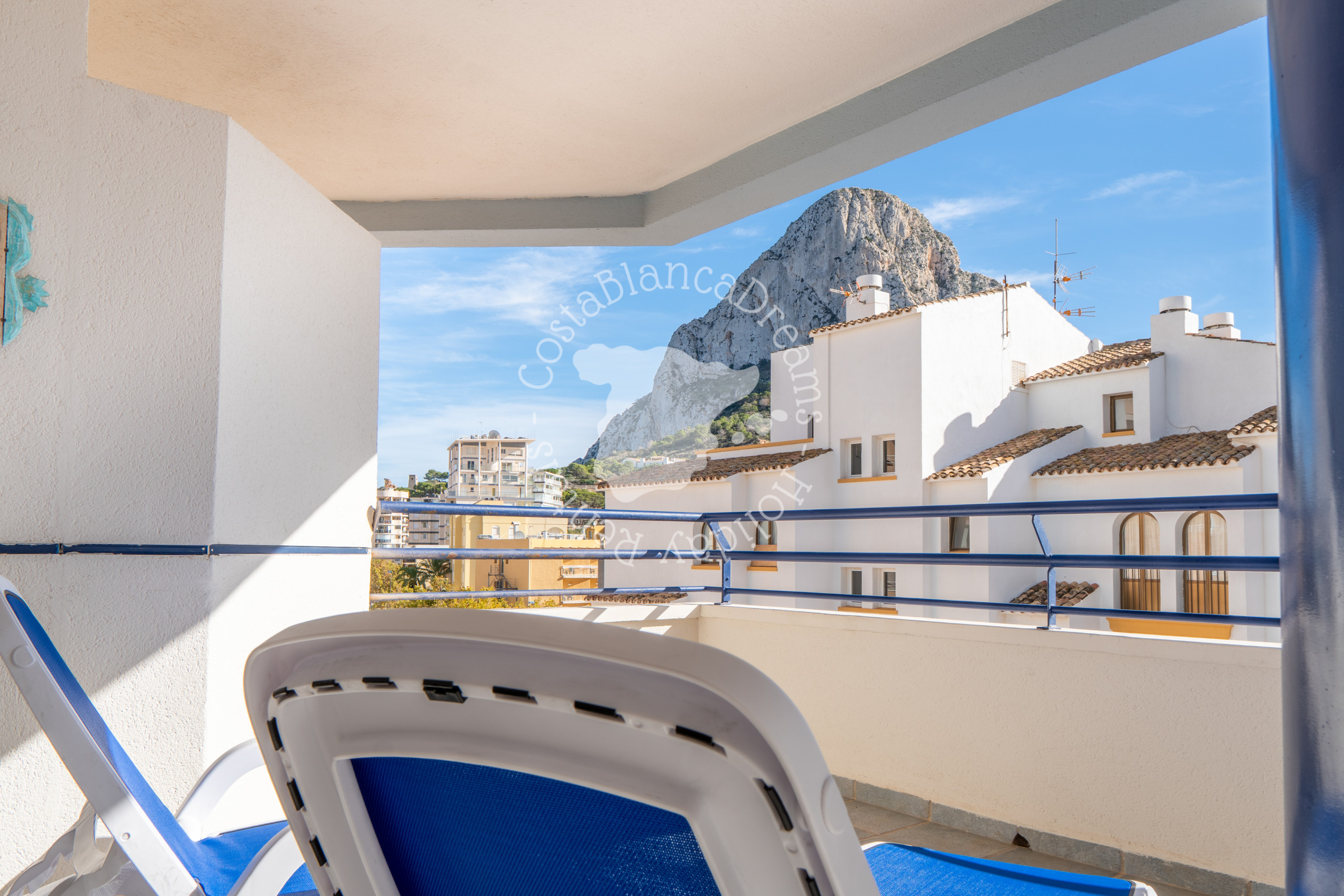 Sal del salón al espacioso balcón privado, amueblado con una mesa de comedor y dos tumbonas. Este es el lugar perfecto para disfrutar del sol mediterráneo mientras contemplas las vistas panorámicas del emblemático Peñón de Ifach, el horizonte de la ciudad de Calpe, el lago salado Les Salines y el mar resplandeciente.
