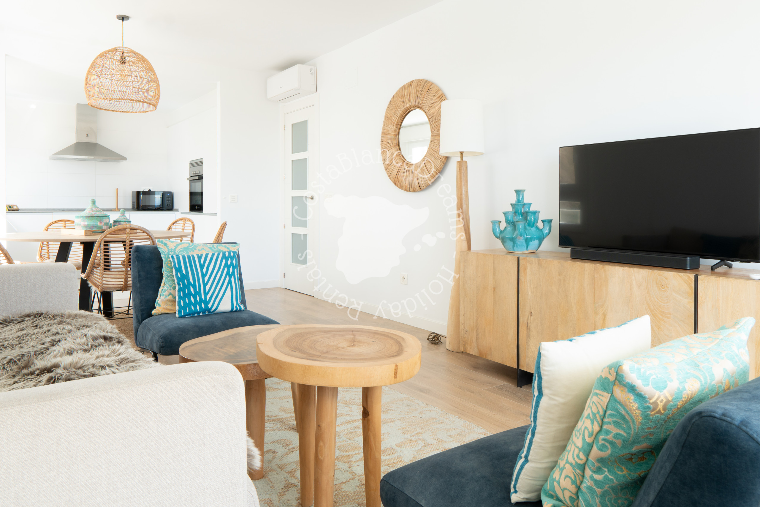 Ingrese a la acogedora sala de estar donde encontrará un ambiente acogedor. Directamente a su izquierda, hay una cocina nueva y moderna equipada con todo lo necesario: nevera, congelador, vitrocerámica, horno combinado, lavavajillas, cafetera con filtro, hervidor, tostadora y lavadora. El salón cuenta con un cómodo sofá, dos acogedores sillones, Smart TV y aire acondicionado. El comedor, justo al lado de la sala de estar, se conecta perfectamente con el balcón, lo que le permite disfrutar de sus comidas con vistas. Y hay Wi-Fi gratuito disponible en todo el apartamento.