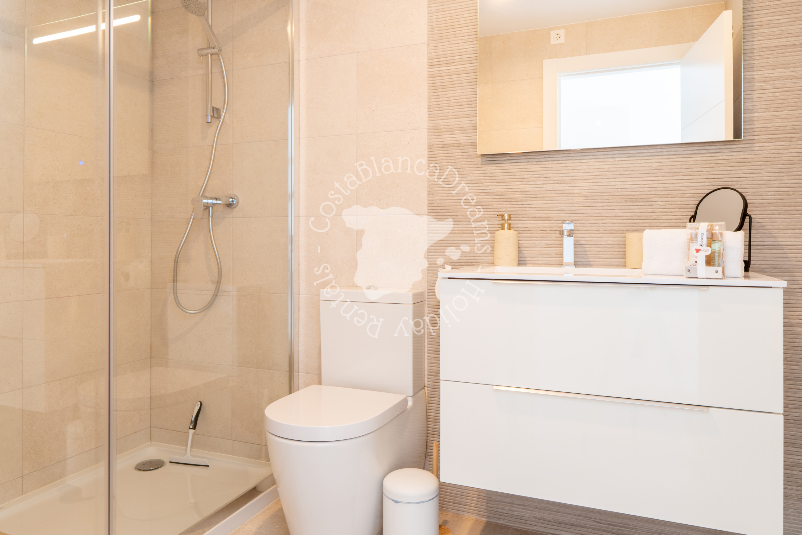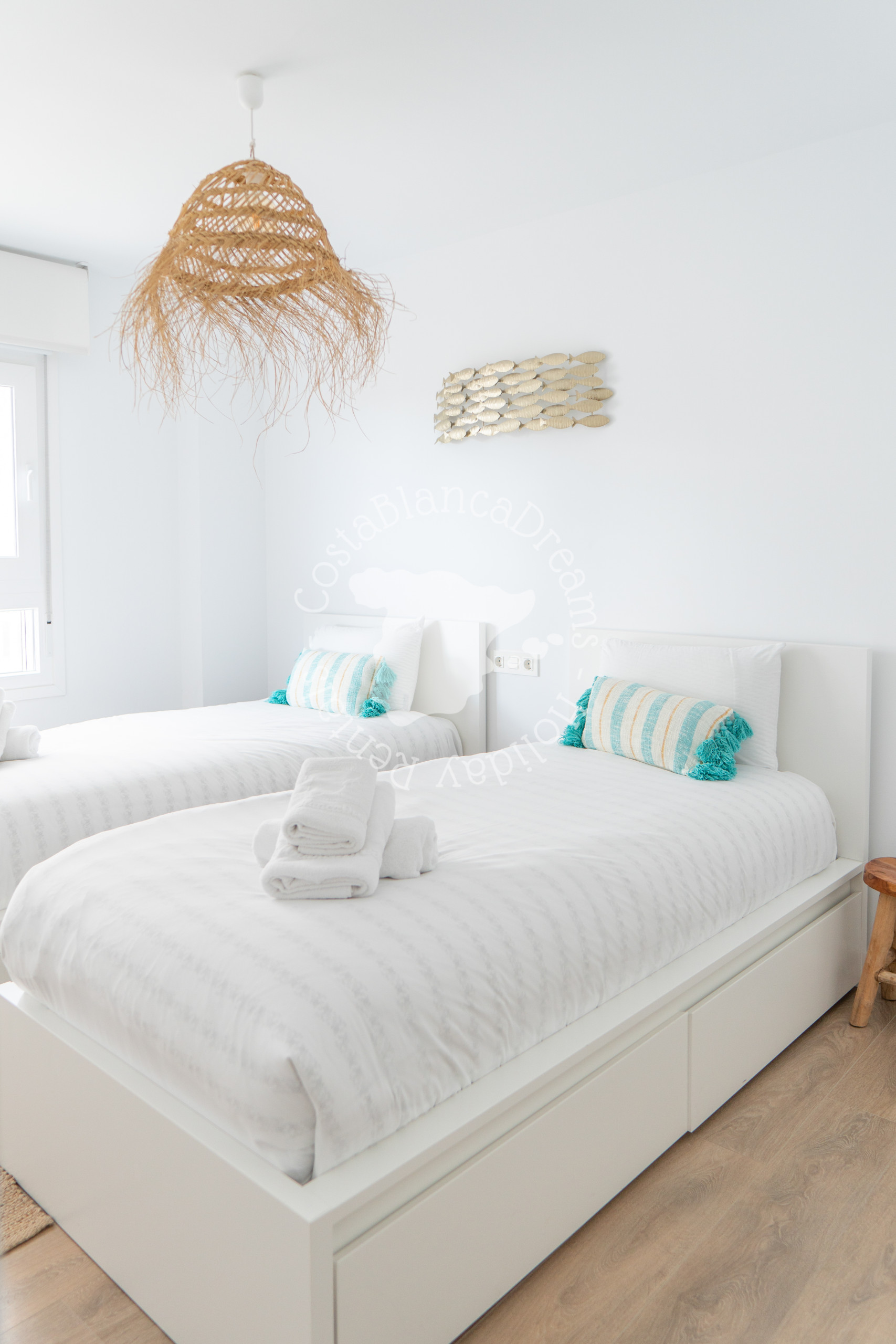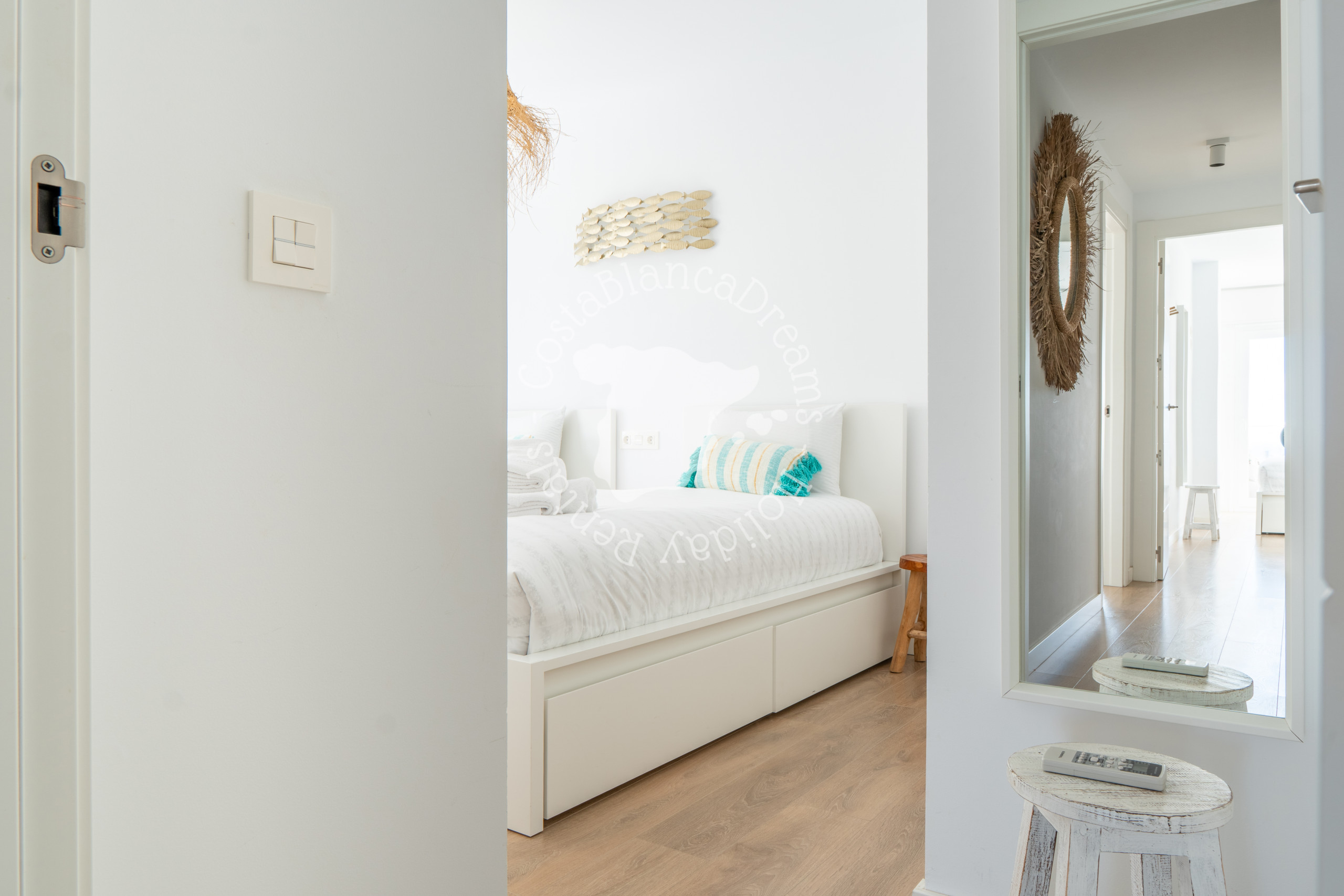 El dormitorio principal cuenta con una cama doble, armarios empotrados, aire acondicionado y baño privado con ducha, lavabo e inodoro. Además, tiene una puerta corredera que da a la terraza. El segundo dormitorio dispone de dos camas individuales, un armario y también aire acondicionado. Un segundo baño en el pasillo cuenta con ducha, lavabo e inodoro para mayor comodidad.