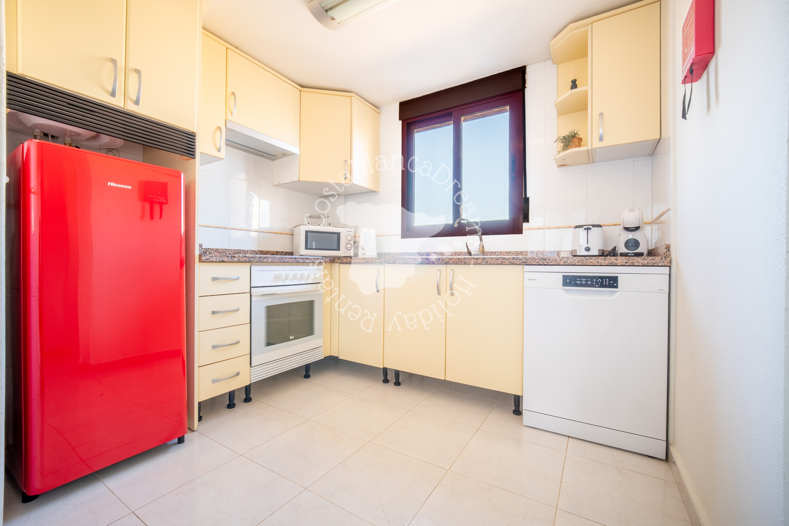 La cocina, totalmente equipada, ofrece todo lo necesario para una estancia confortable, incluyendo nevera, congelador, vitrocerámica, horno, microondas, lavavajillas, cafetera Dolce Gusto, hervidor de agua y tostadora.
