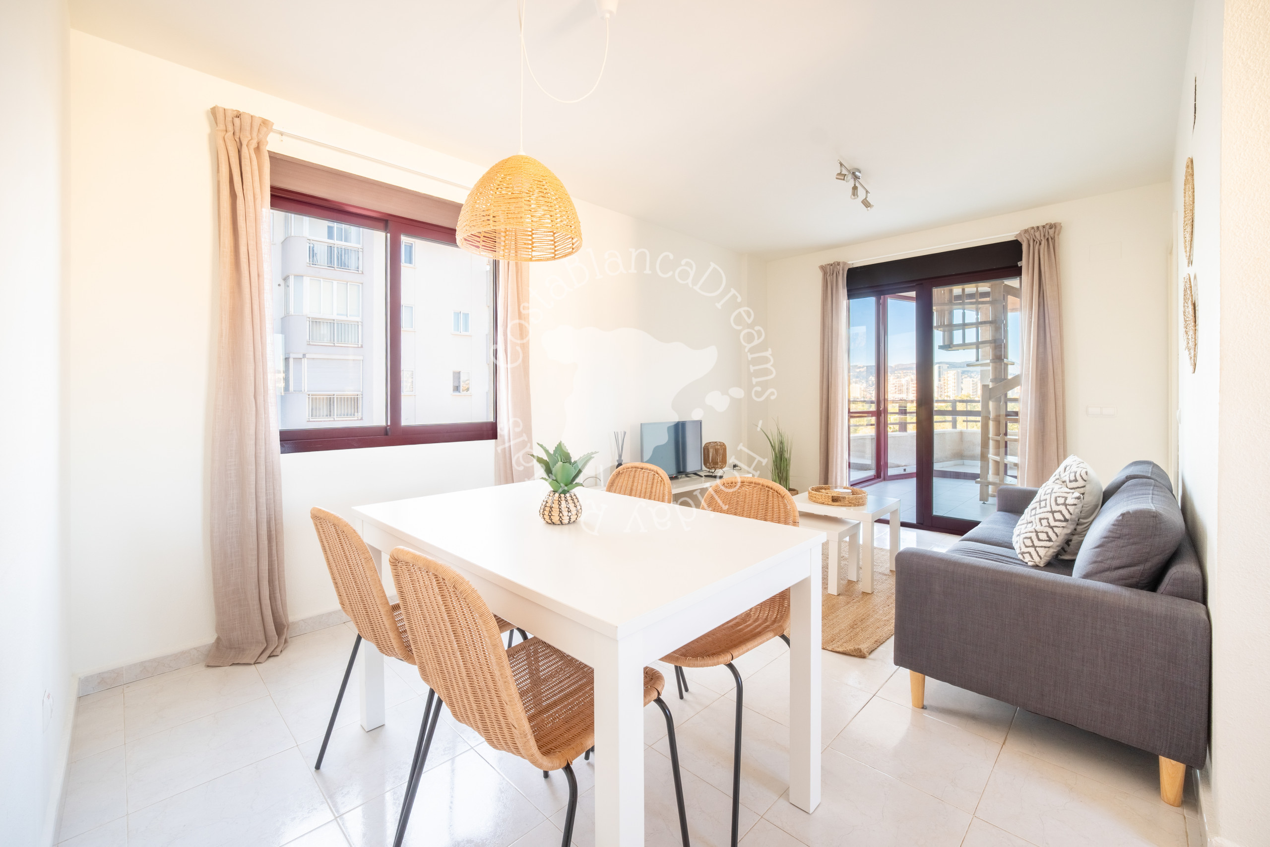 Al entrar en el apartamento, se accede a un acogedor salón con un cómodo sofá, Smart TV y mesa de comedor. Desde aquí, se accede directamente a la terraza cubierta, donde se puede disfrutar de preciosas vistas a la ciudad de Calpe, al famoso lago de Las Salinas con sus flamencos, a las montañas circundantes y a las resplandecientes colinas de Calpe.