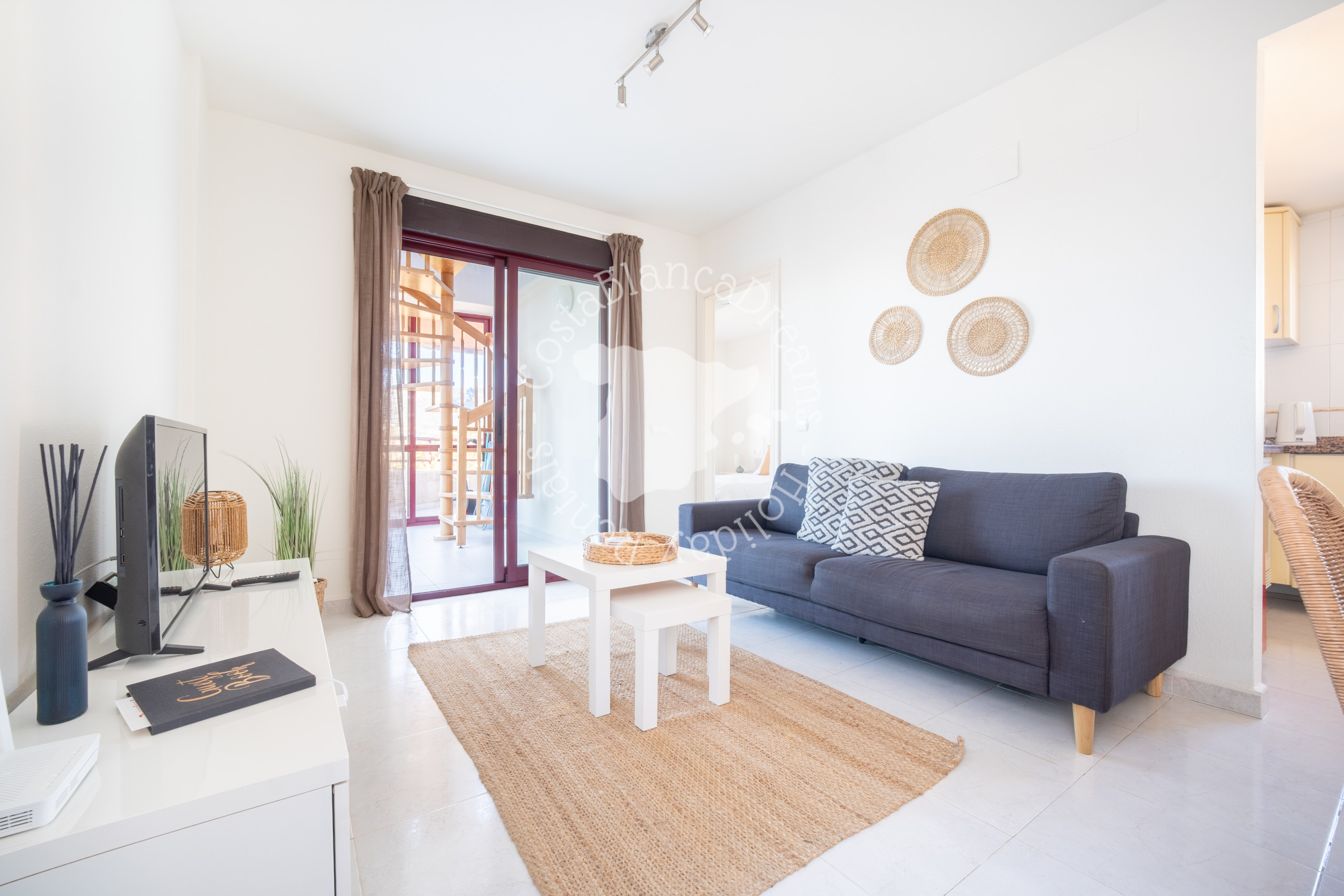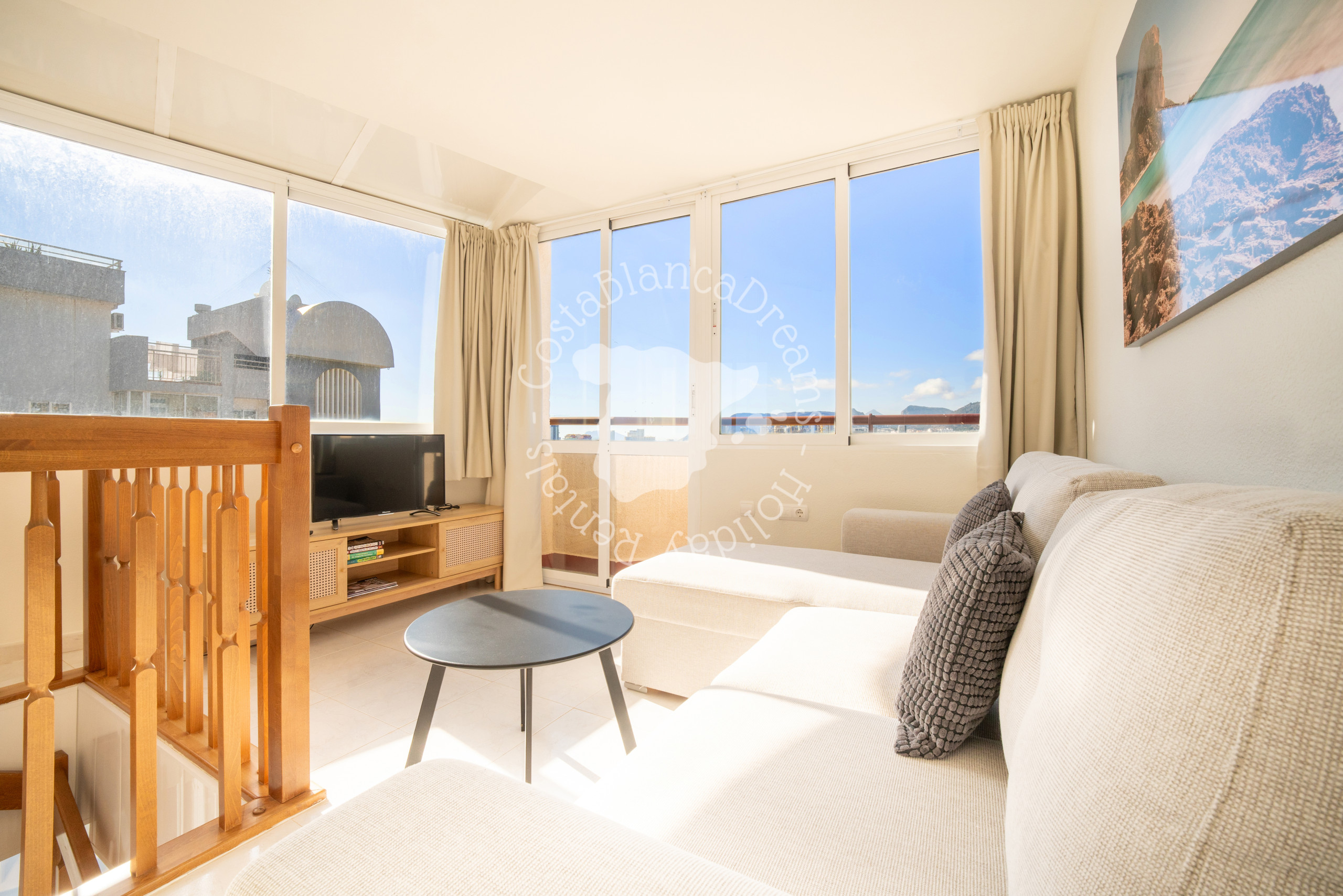 Una escalera interior conduce a la planta superior a una segunda sala de estar luminosa, llena de luz natural gracias a las ventanas orientadas al sur. Este espacio cuenta con un sofá, aire acondicionado y otra Smart TV, lo que lo convierte en una zona de estar ideal para relajarse. Además, hay un tercer baño con ducha, lavabo e inodoro. Desde esta planta, se accede a la terraza privada en la azotea, con tumbonas, desde donde se puede disfrutar de una ligera vista al mar, así como de Calpe y sus alrededores.