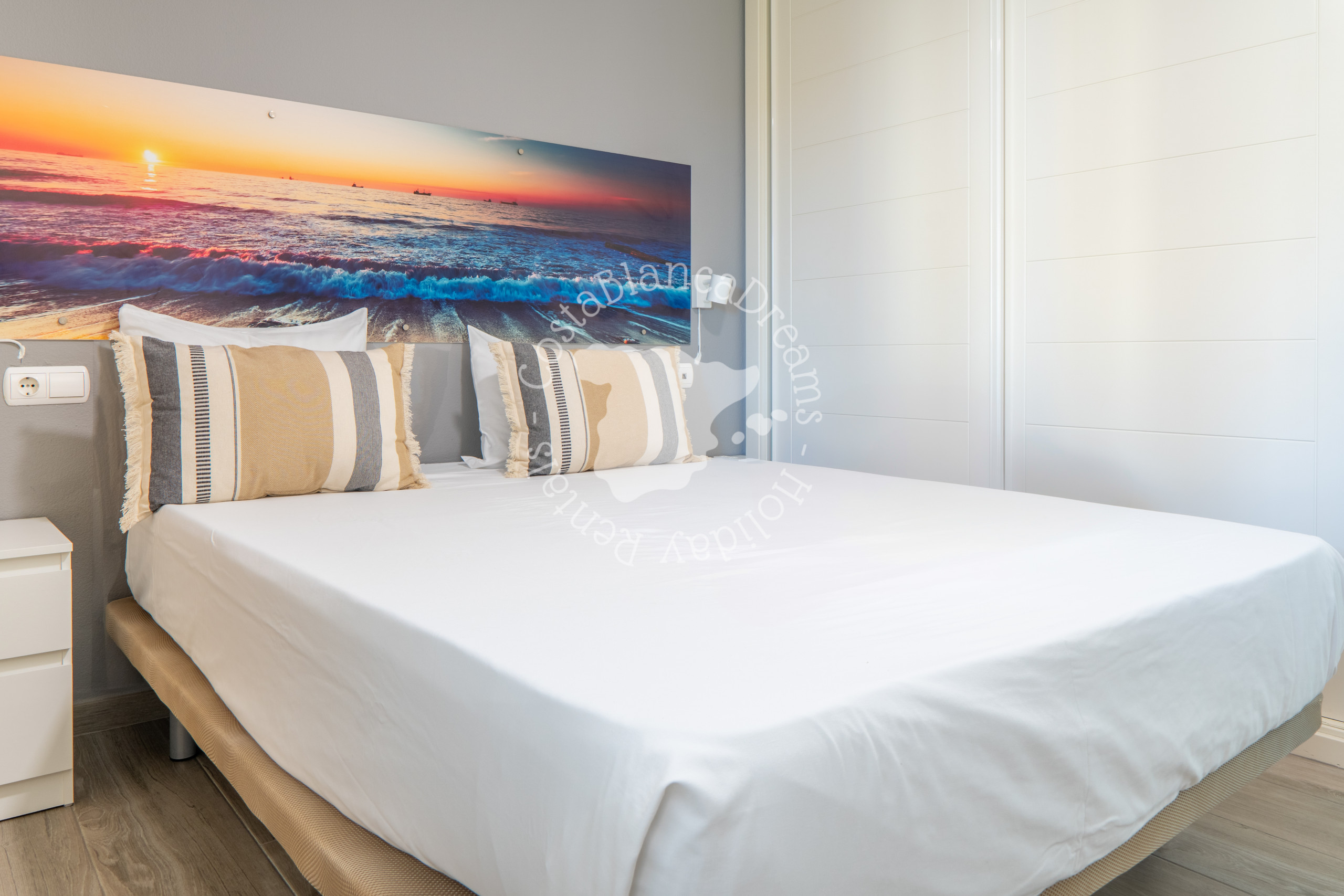 El apartamento ofrece tres dormitorios cuidadosamente diseñados. El dormitorio principal cuenta con una cómoda cama doble, armario y baño en suite con ducha, lavabo e inodoro. El segundo dormitorio también tiene una cama doble y un armario, mientras que el tercero cuenta con dos camas individuales conectadas. Un segundo baño, convenientemente ubicado en el pasillo, incluye ducha, lavabo e inodoro.