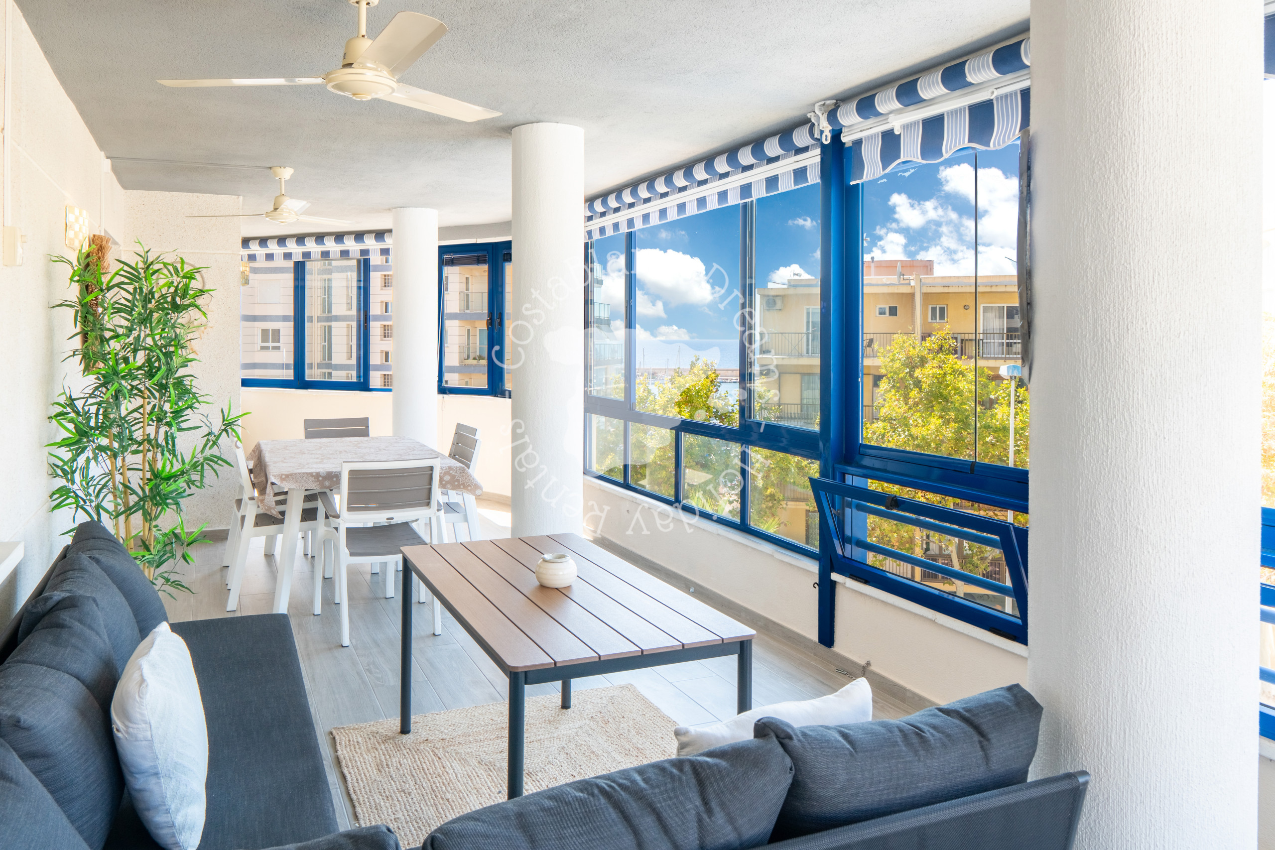 Entre por el pasillo, que conduce a la sala de estar de planta abierta. Aquí encontrará un cómodo sofá, una Smart TV y aire acondicionado para una estancia agradable. Junto al salón se encuentra una terraza completamente cerrada con ventanas acristaladas que se abren por completo, lo que permite una experiencia interior-exterior sin complicaciones. La terraza está amueblada con una mesa de comedor, una acogedora sala de estar, ventiladores de techo y dos tumbonas, ideal para disfrutar del clima mediterráneo.
