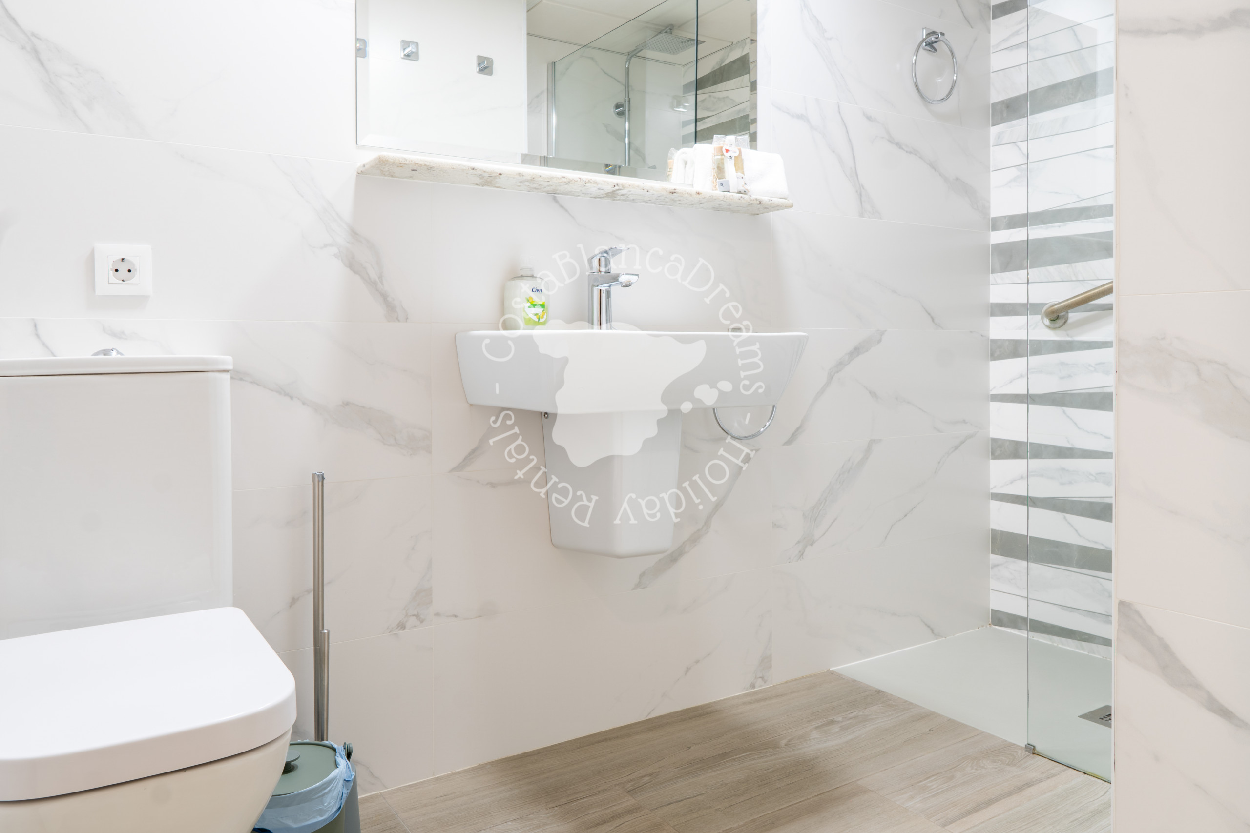 El apartamento cuenta con tres dormitorios cuidadosamente diseñados. El dormitorio principal cuenta con una cama doble, un amplio espacio de guardarropas y un baño privado equipado con dos lavabos, ducha e inodoro. El segundo dormitorio también ofrece una cama doble y un amplio espacio de almacenamiento, mientras que el tercer dormitorio cuenta con dos camas individuales y espacio de guardarropas. Estos dormitorios comparten un elegante baño con ducha, lavabo e inodoro.