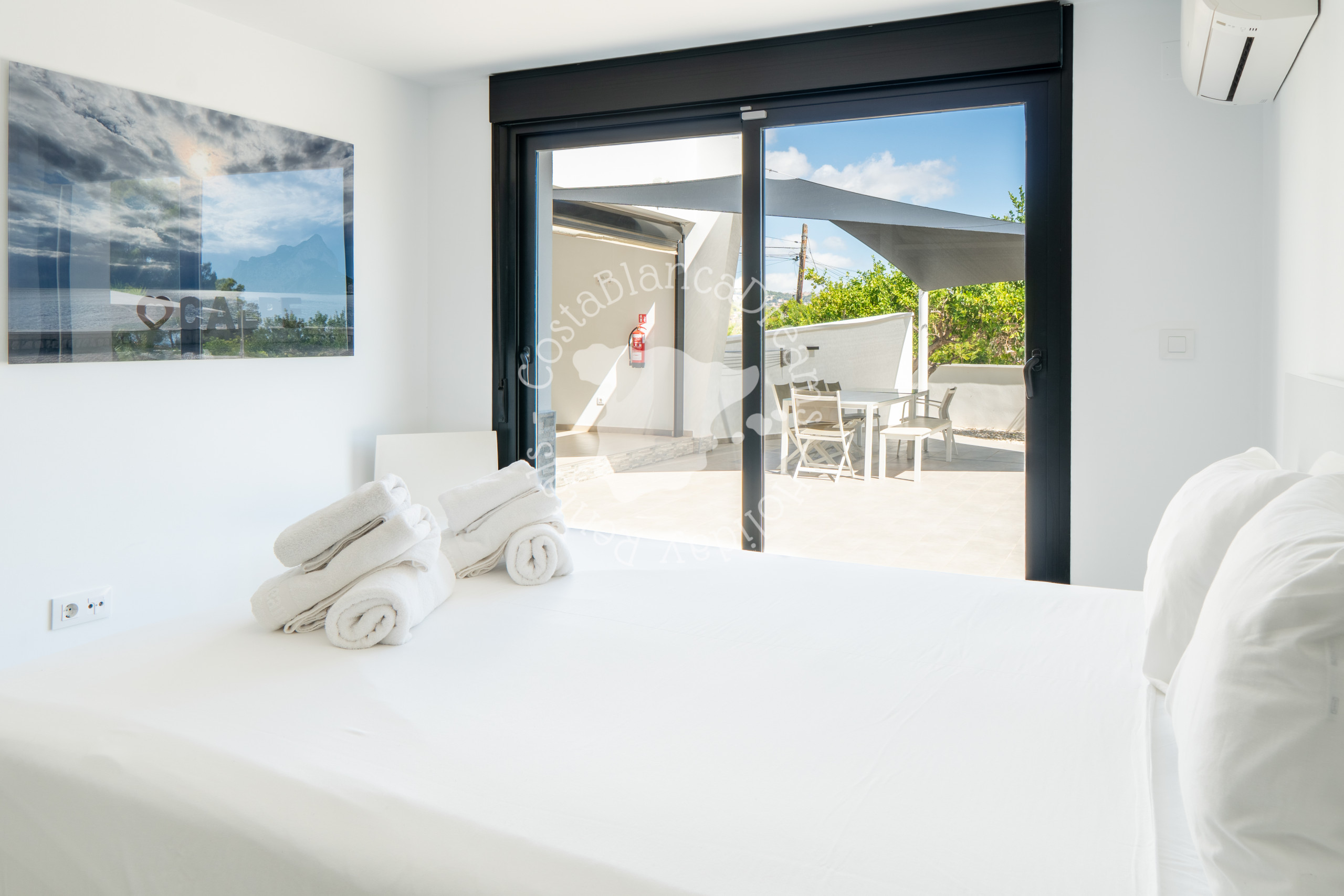 Los otros dos dormitorios y el baño se encuentran junto a la casa, pero se puede llegar a ellos a través de la terraza cubierta. El moderno dormitorio principal tiene una cama doble, armario estilo ibicenco, aire acondicionado y baño privado. En este baño encontrará una amplia cabina de ducha, inodoro y lavabo. Junto a este dormitorio encontrará otra habitación con un sofá. Se trata de un sofá cama apto para dos personas.