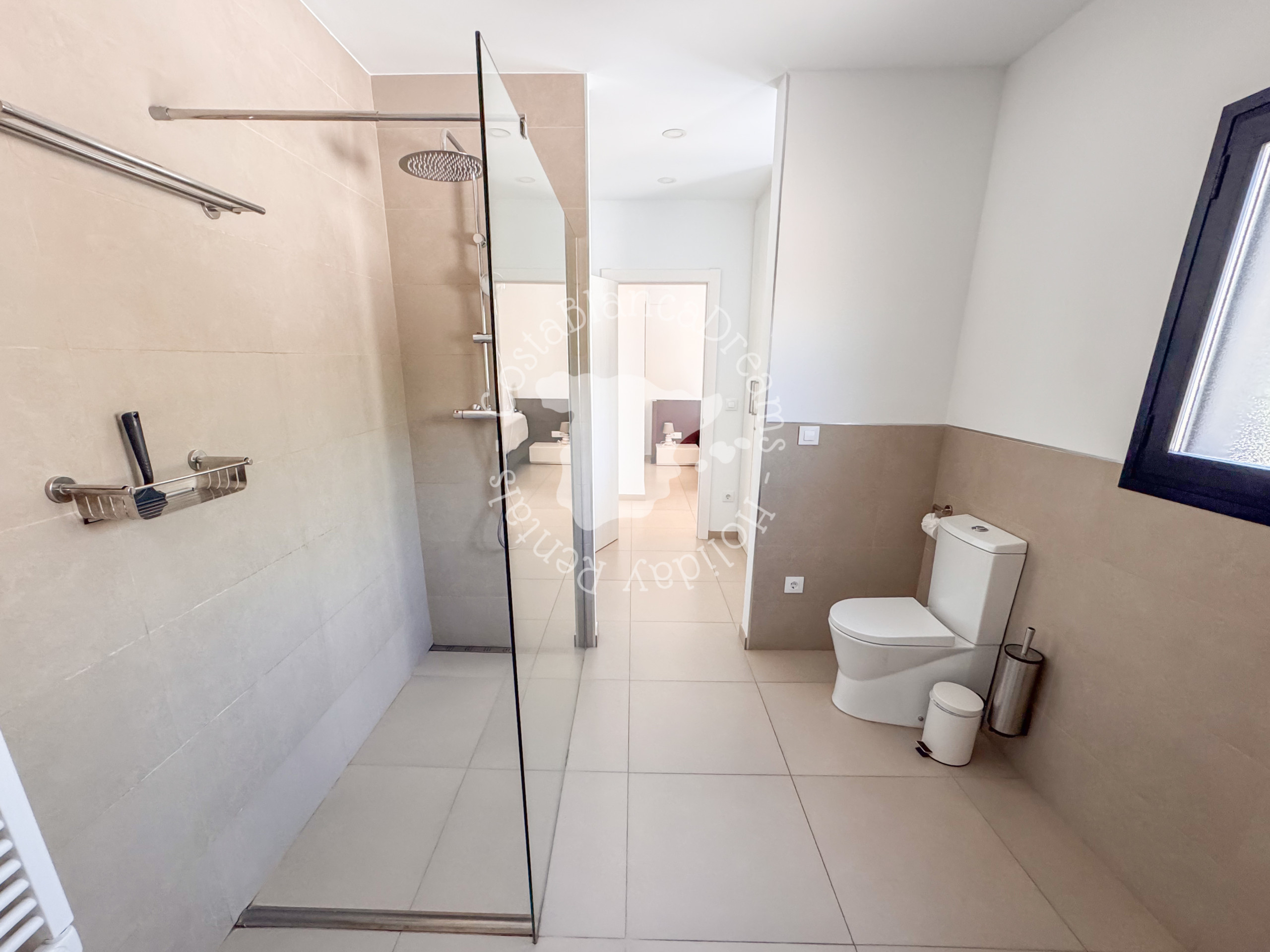 Mila es una casa de vacaciones privada con 4 dormitorios y 3 baños con capacidad para 10 personas cómodamente. El primer dormitorio está en el primer piso junto a la sala de estar y la cocina. Este dormitorio tiene una cama doble con baño privado. Aquí encontrará aire acondicionado, armario, plato de ducha, inodoro y lavabo. Los otros tres dormitorios se encuentran en la planta baja. Un dormitorio tiene una cama doble y un baño en suite. Aquí puede volver a disfrutar de aire acondicionado, armario, ducha a ras de suelo, inodoro y lavabo.