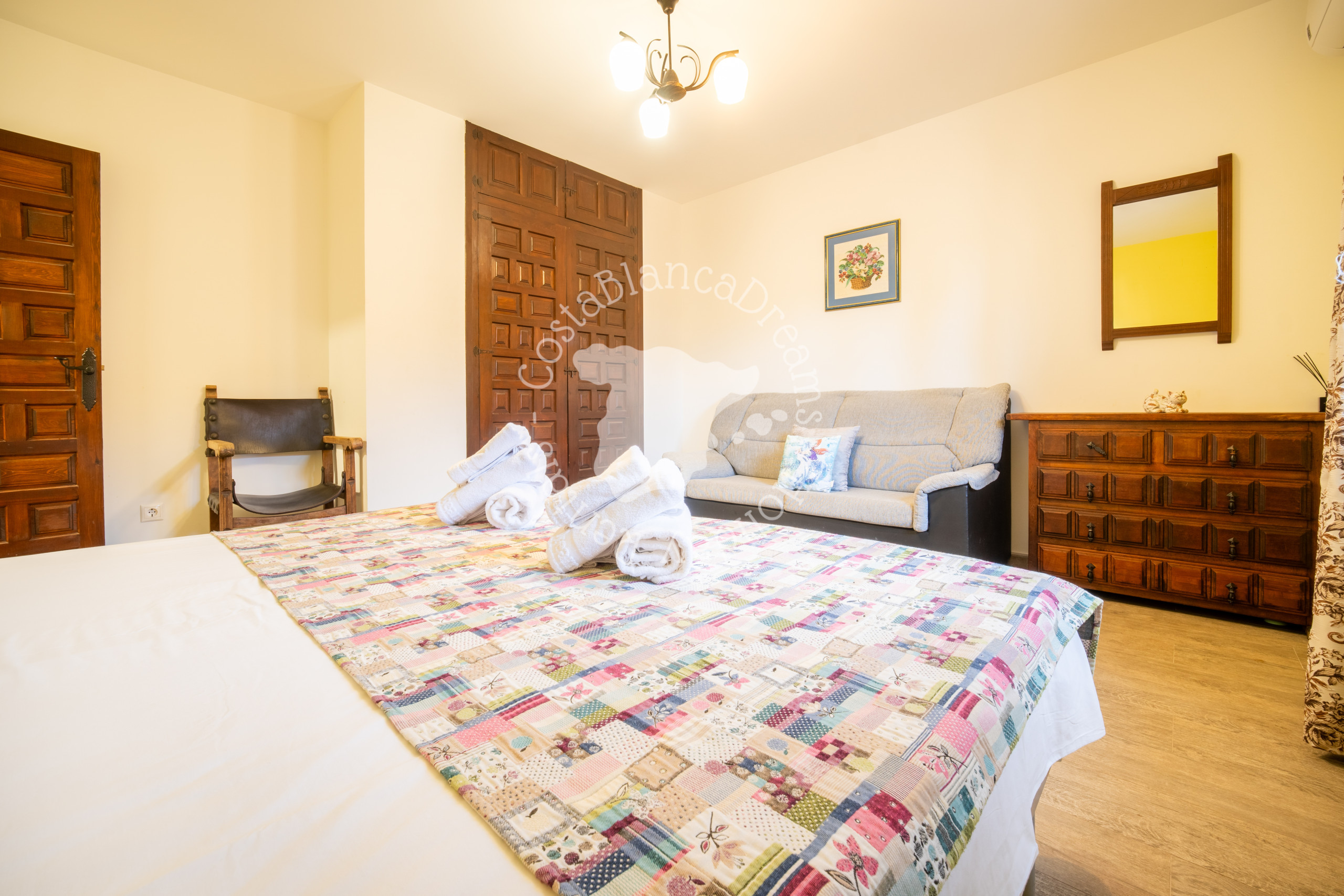 Los otros dos dormitorios y el baño se encuentran junto a la casa, pero se puede llegar a ellos a través de la terraza cubierta. El moderno dormitorio principal tiene una cama doble, armario estilo ibicenco, aire acondicionado y baño privado. En este baño encontrará una amplia cabina de ducha, inodoro y lavabo. Junto a este dormitorio encontrará otra habitación con un sofá. Se trata de un sofá cama apto para dos personas.