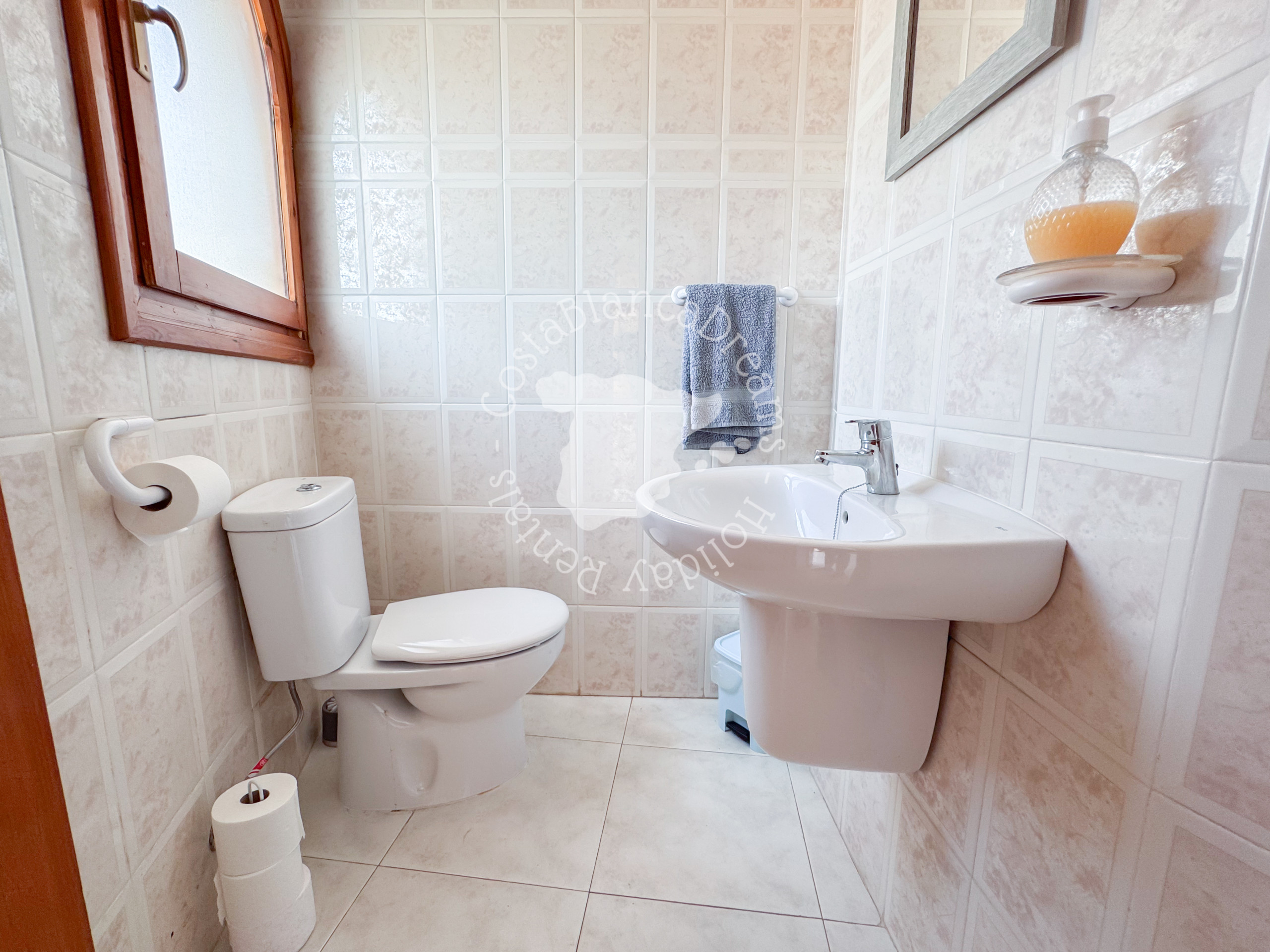 En el interior, la villa se distribuye en dos plantas. La planta superior principal incluye un amplio y luminoso salón con aire acondicionado, un comedor con preciosas vistas al mar y una cocina totalmente equipada con cafetera de Dulce Gusto. En este nivel también encontrará un dormitorio con dos camas individuales, un baño con ducha, lavabo e inodoro, así como un aseo adicional para invitados.