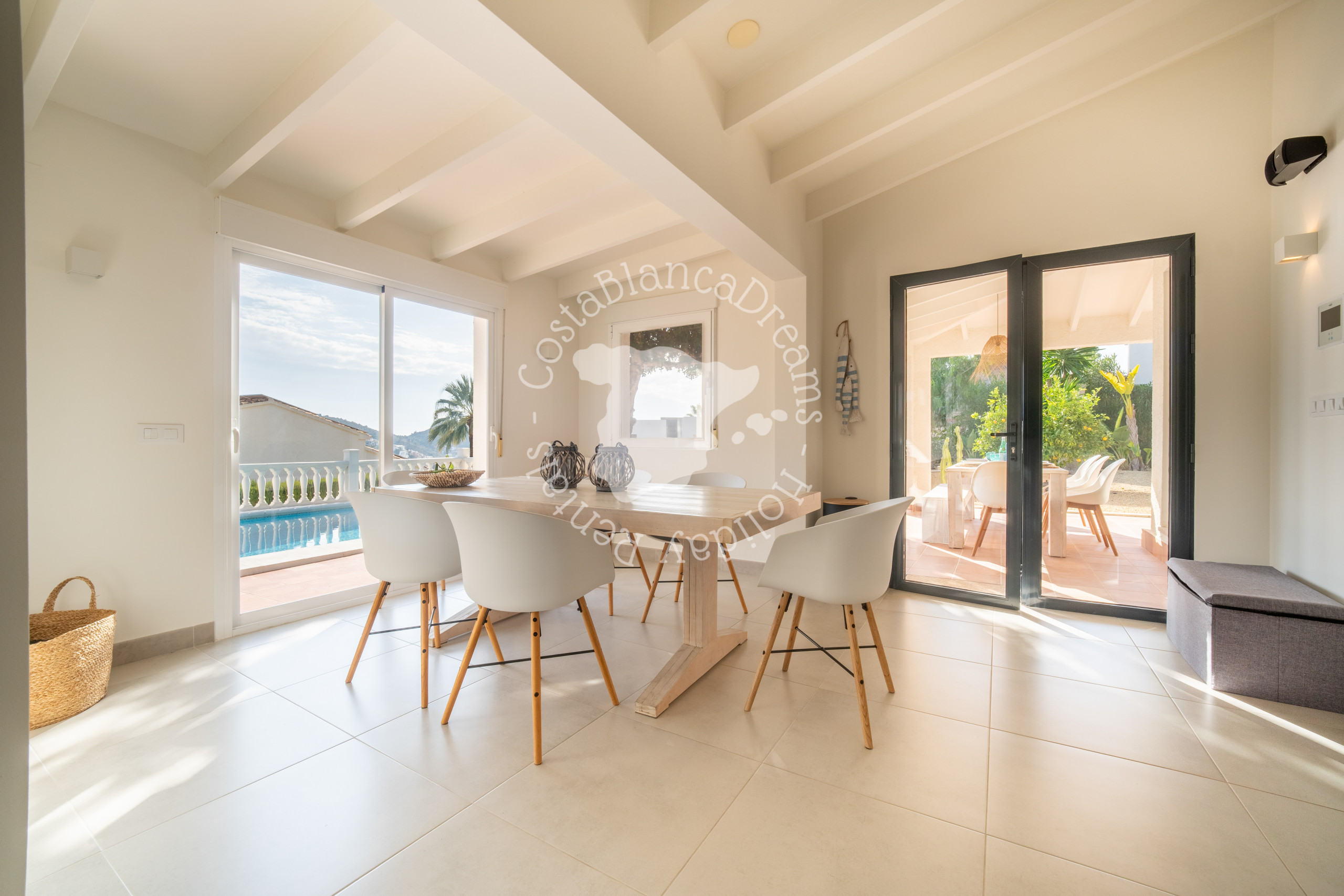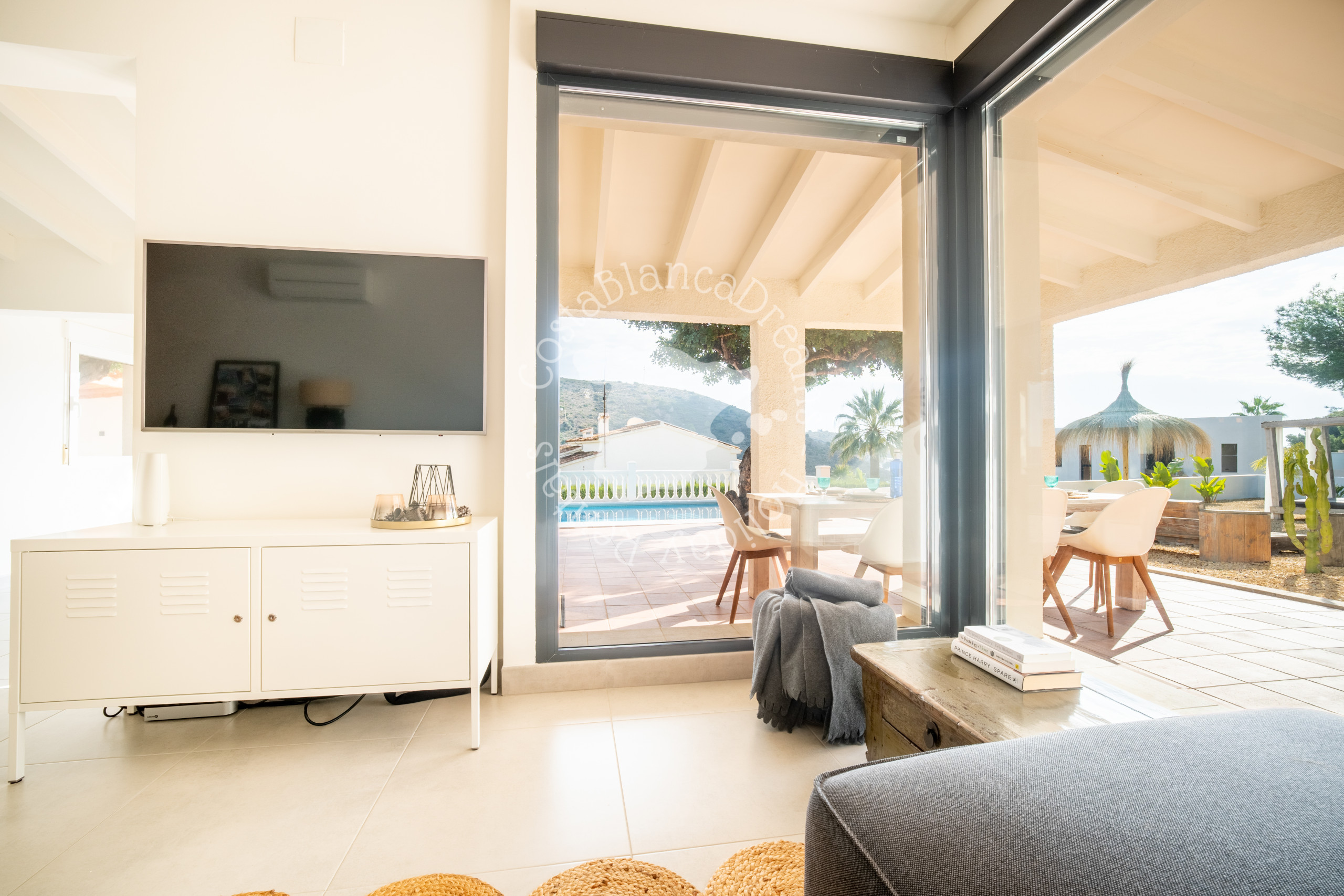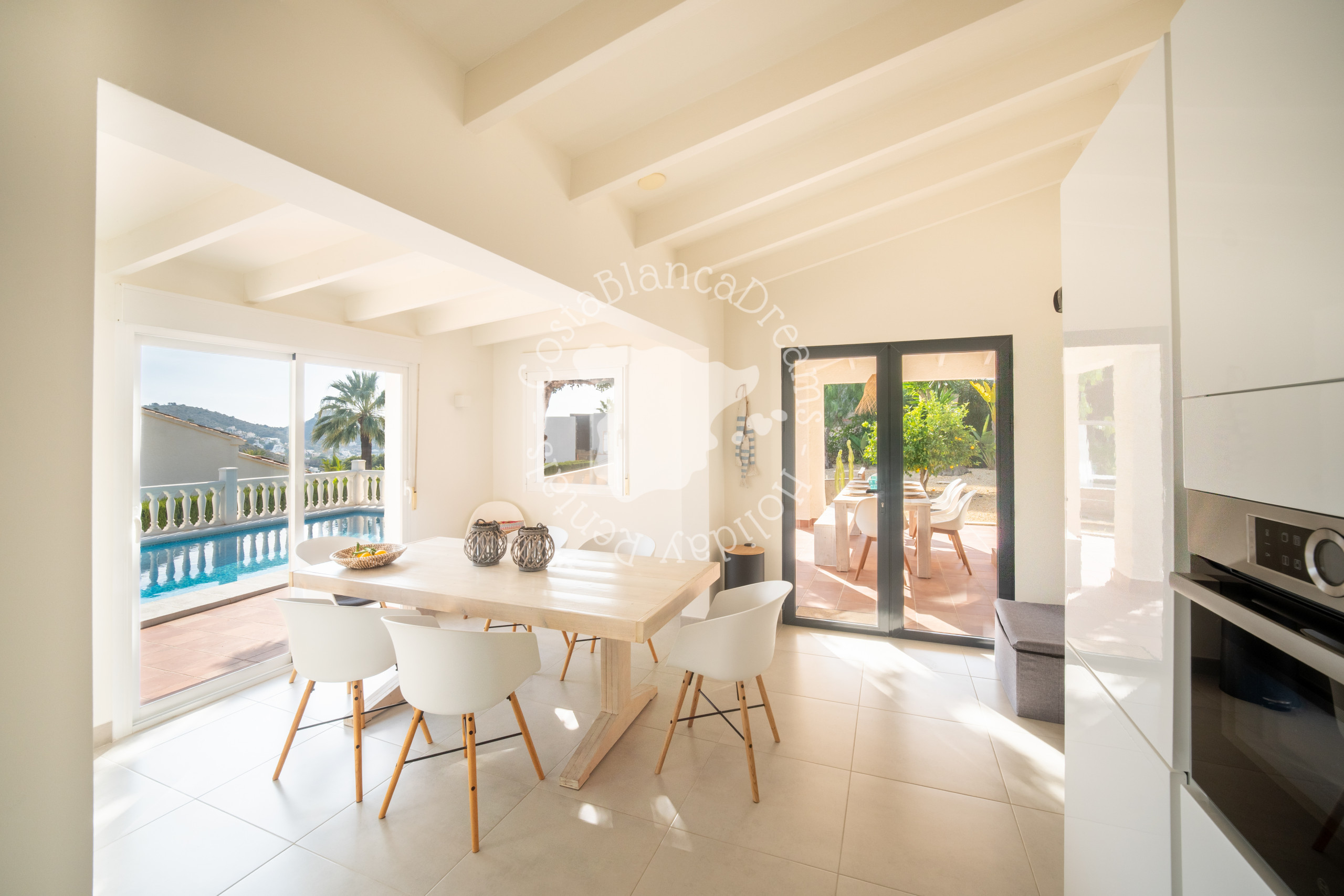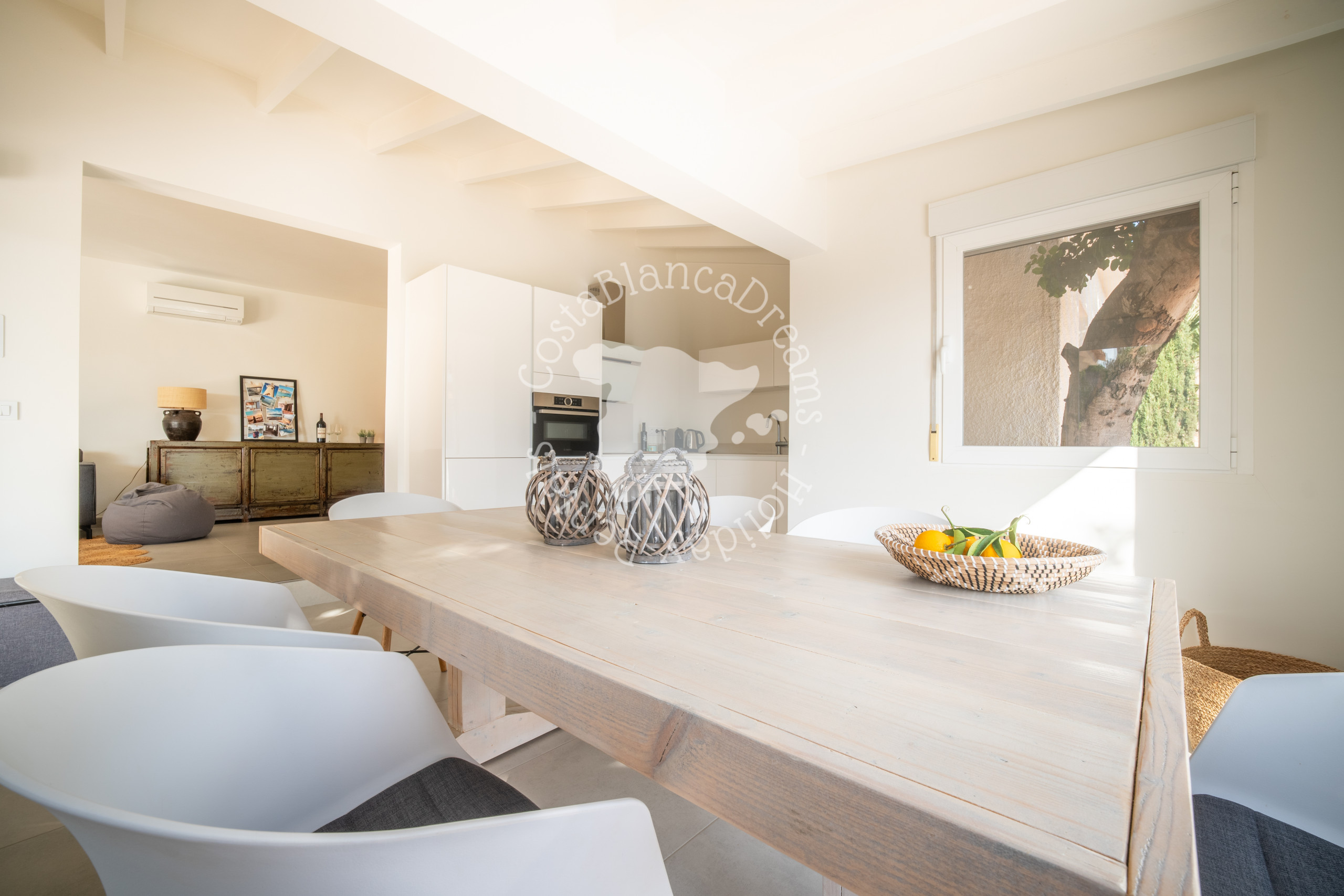 Al entrar en la casa, se accede a un luminoso y espacioso salón-comedor de planta abierta. El salón está cómodamente amueblado con un acogedor sofá, sillón, Smart TV LG y aire acondicionado, creando un espacio perfecto para relajarse. Junto a este se encuentra la zona de comedor, con acceso directo al gran jardín y a la zona de la piscina. La moderna cocina abierta, totalmente equipada y con electrodomésticos Bosch integrados, cuenta con nevera, congelador, placa vitrocerámica, microondas-horno combinado, lavavajillas, cafetera Nespresso, tostadora y hervidor de agua, ofreciendo todo lo necesario para una estancia agradable.