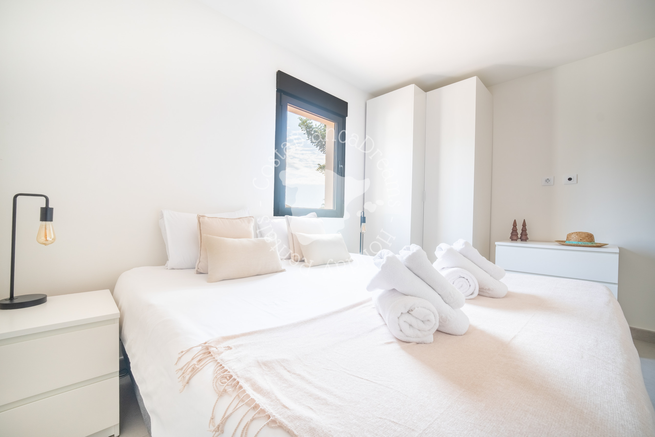 A nivel de piscina encontrarás un apartamento independiente con salón, TV alemana vía satélite y canales españoles y ventilador de techo, además de una pequeña cocina equipada con nevera con un pequeño congelador incorporado, cafetera de filtro, y vitrocerámica de 2 fuegos. El dormitorio cuenta con aire acondicionado y cama doble (200×180), y hay un baño con inodoro, lavabo y ducha.