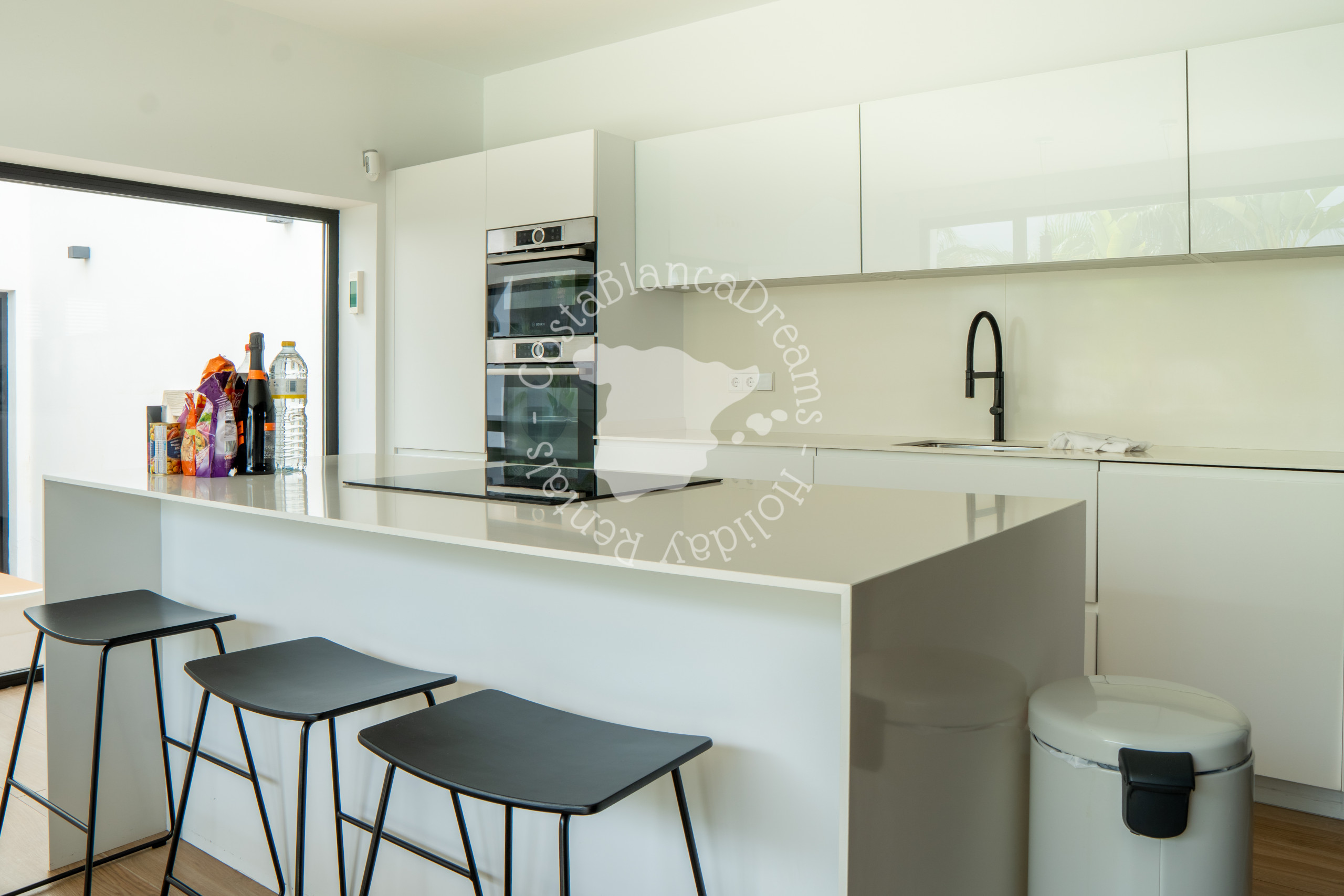 Junto al comedor se encuentra la cocina totalmente equipada, donde esperan ser creadas delicias culinarias. Desde el elegante refrigerador y congelador hasta el conveniente horno, estufas de gas y de inducción, microondas, Cafetera Dolce Gusto, lavavajillas y enfriador de vino, todas las comodidades están a su disposición para preparar comidas sin esfuerzo.